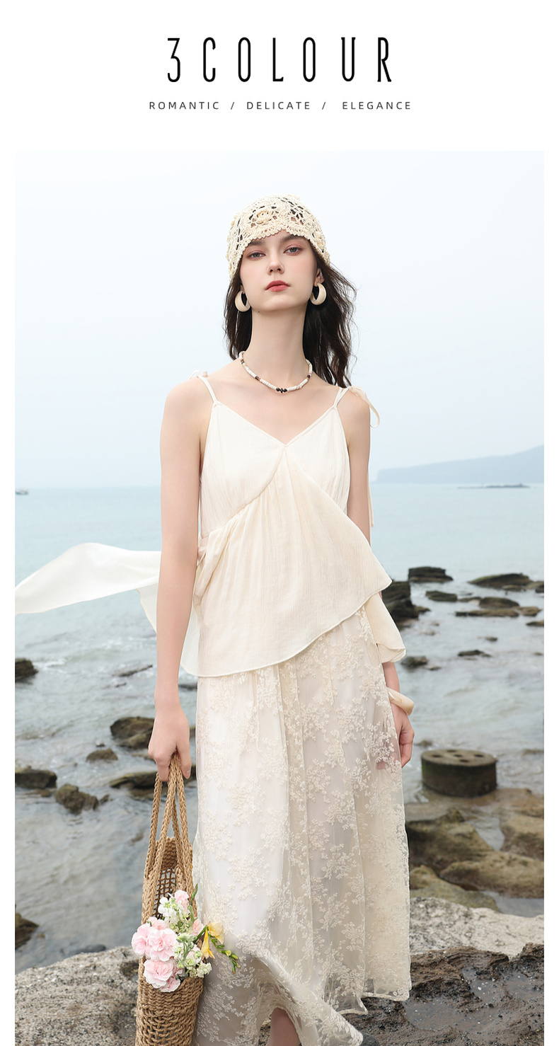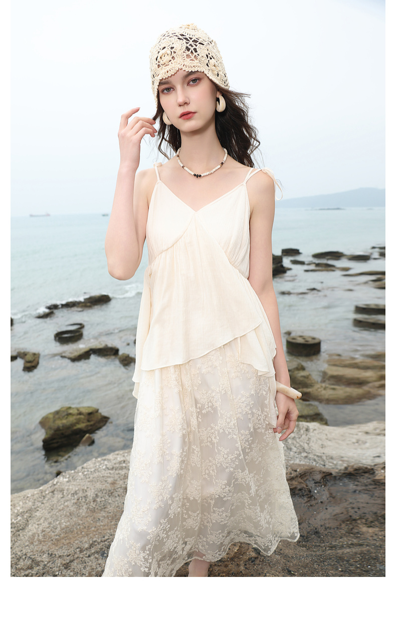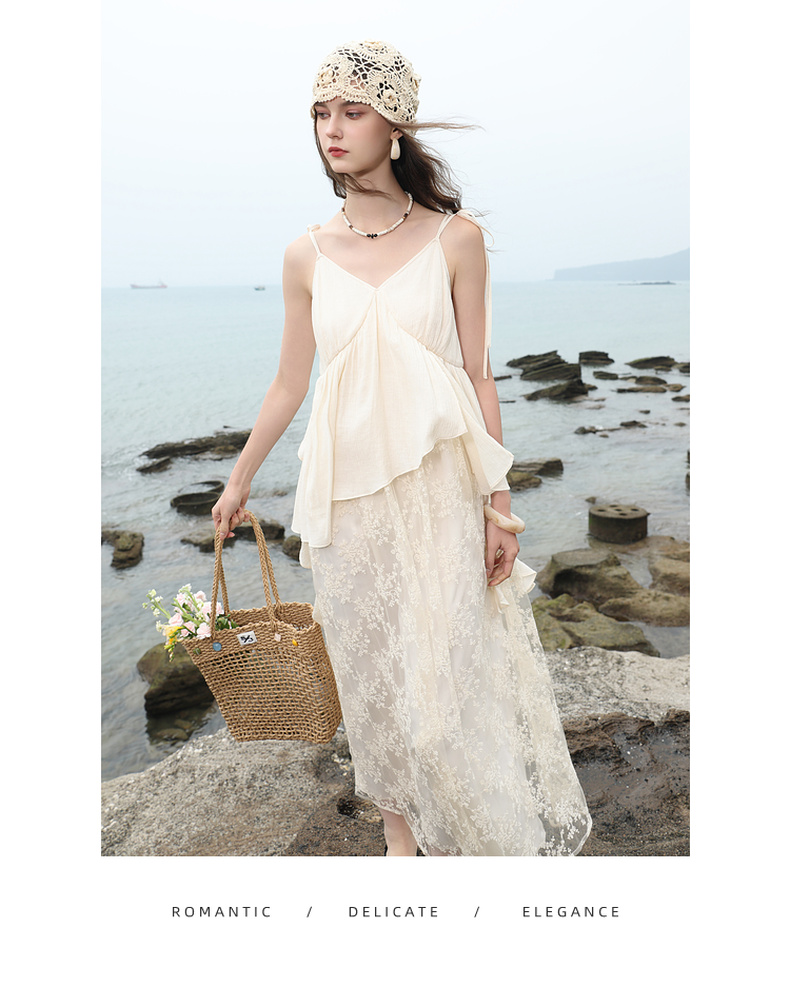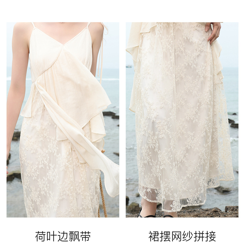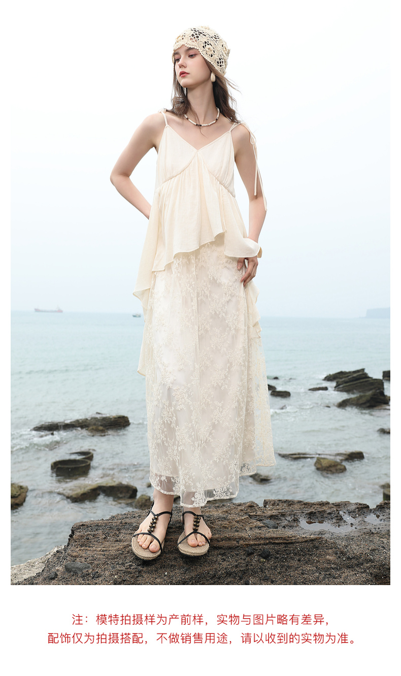 三彩2025夏季新款假两件吊带裙网纱拼接A字长裙度假风M