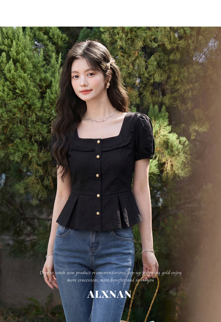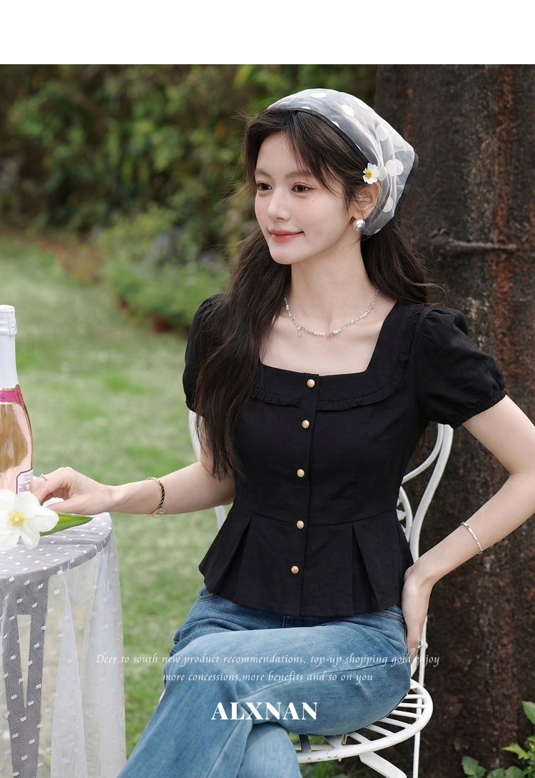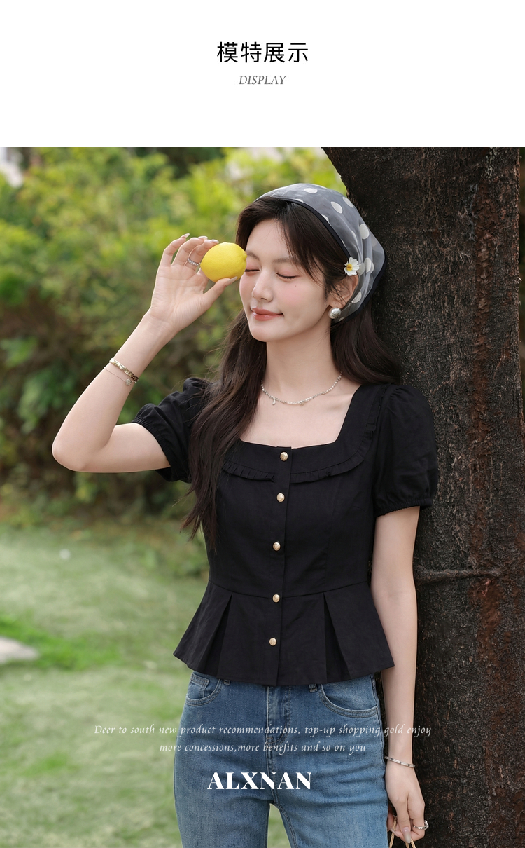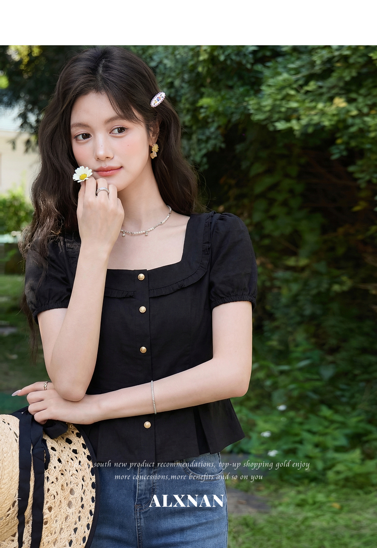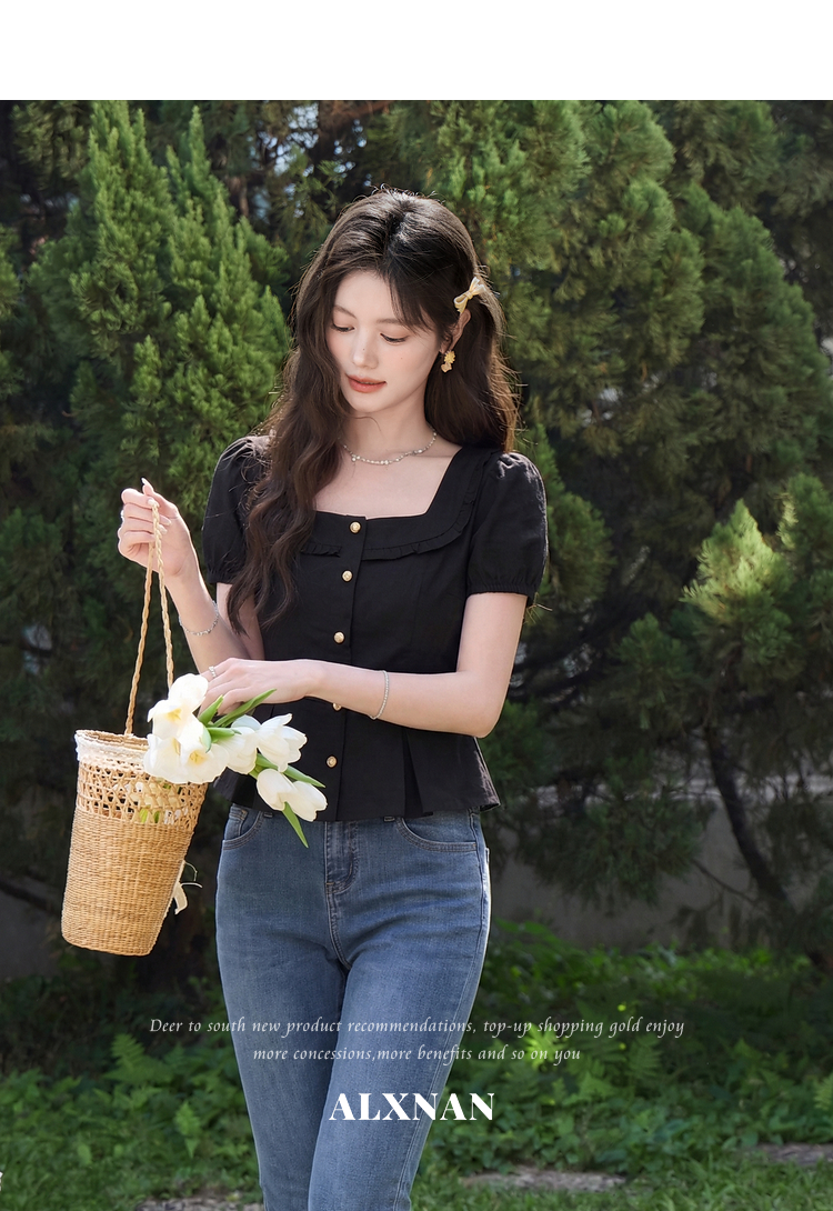 鹿向南「悸动心事」法式方领黑色短袖衬衫女夏季设计感小香风上衣