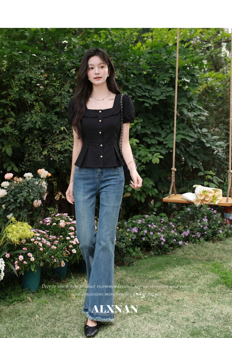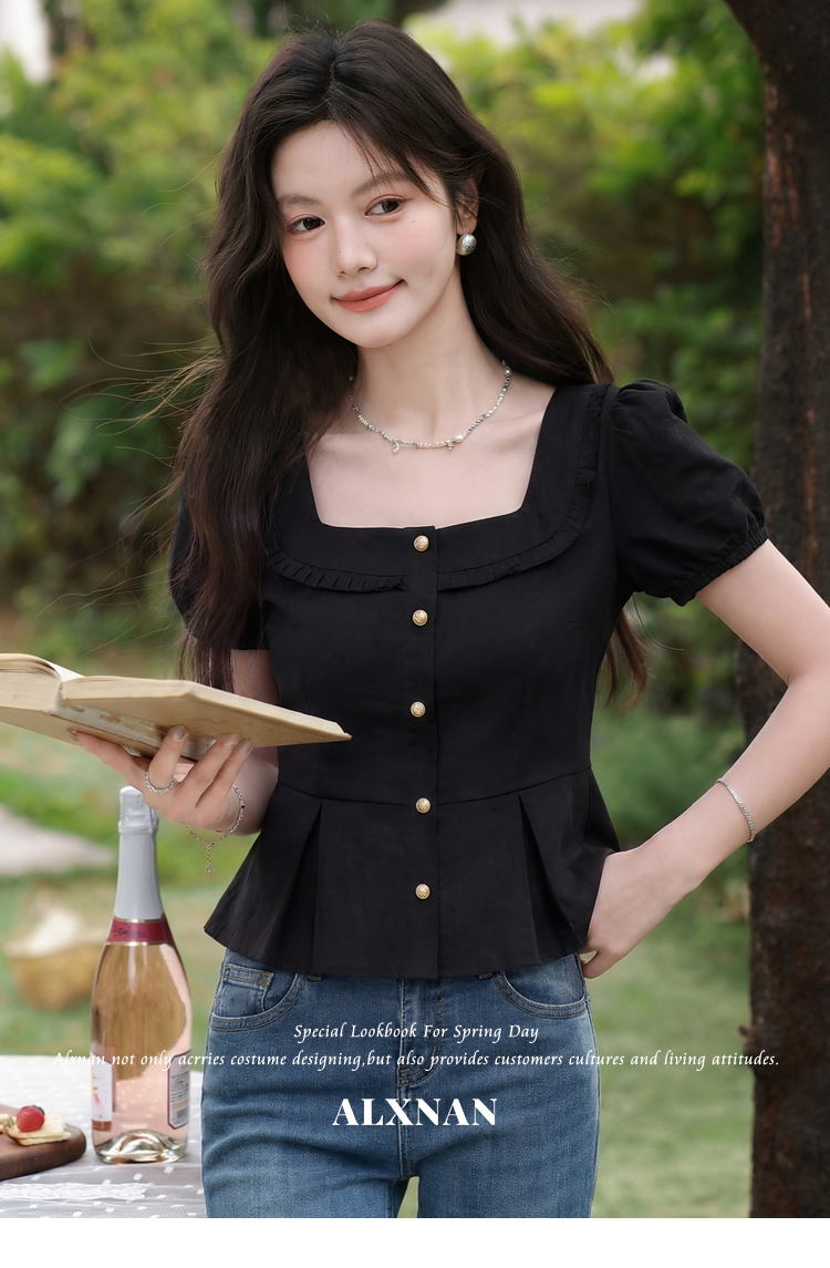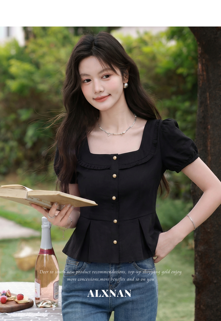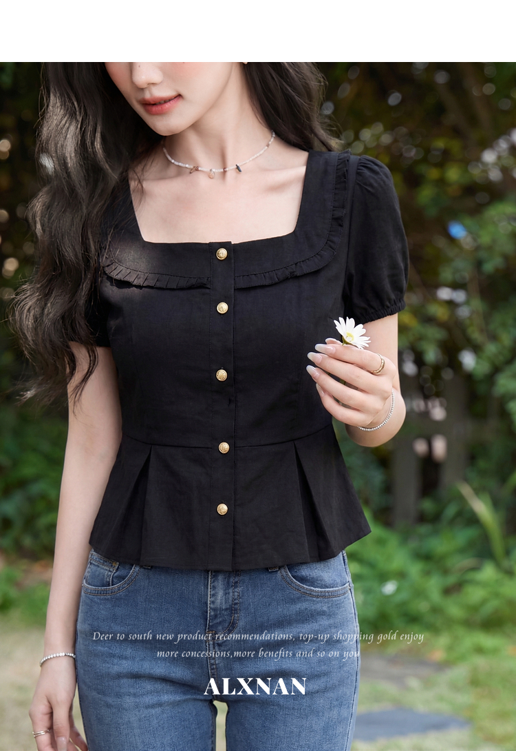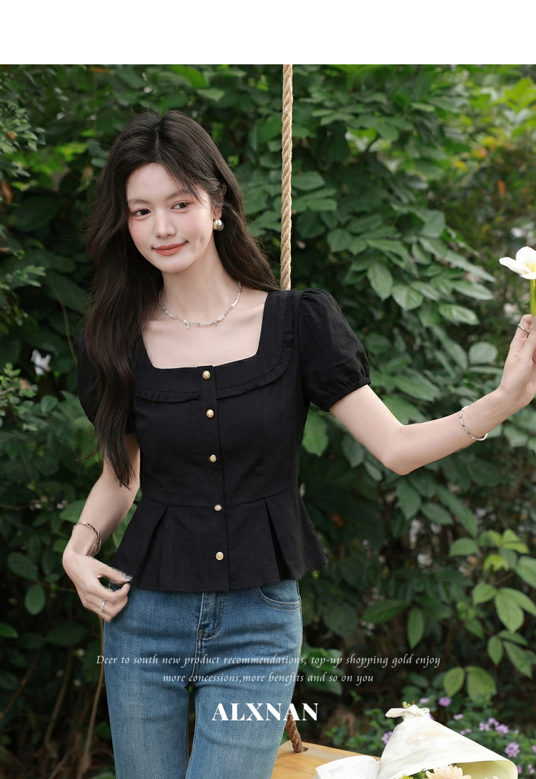鹿向南「悸动心事」法式方领黑色短袖衬衫女夏季设计感小香风上衣