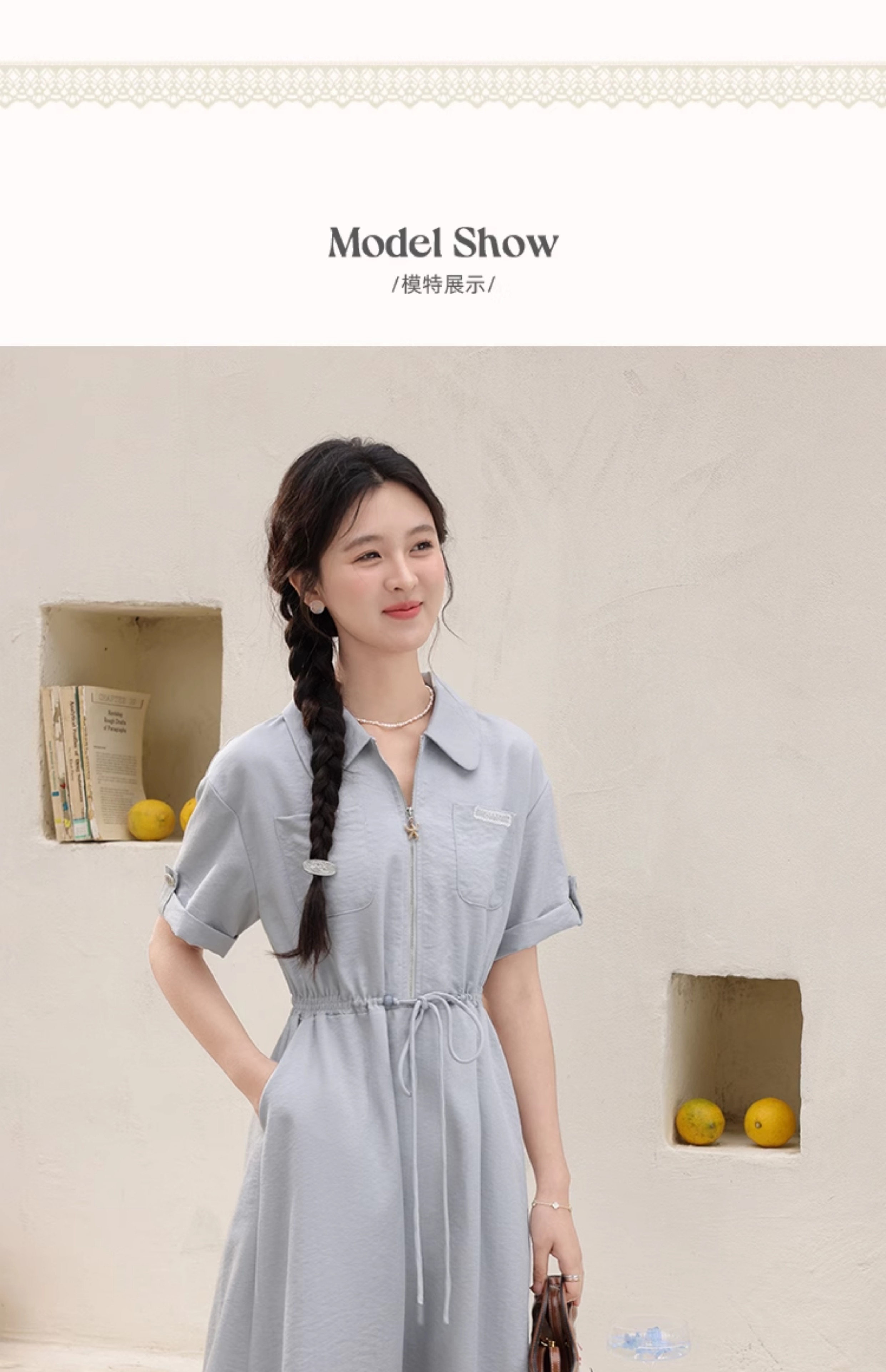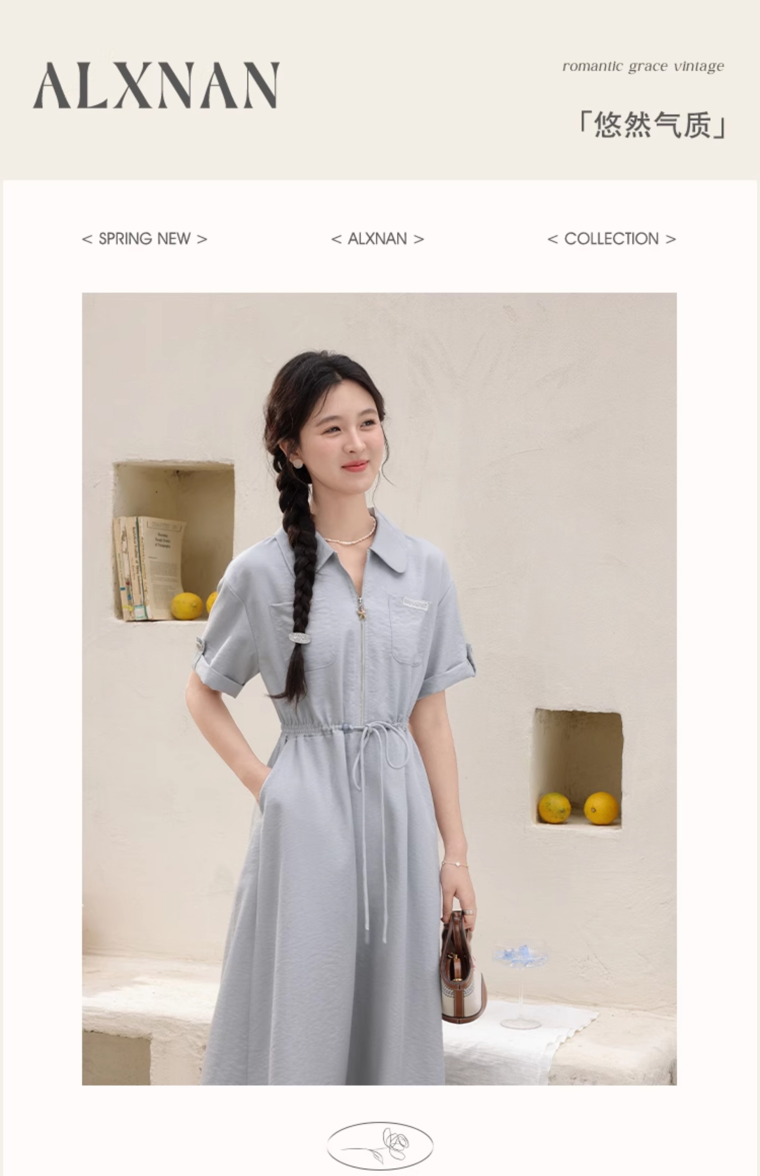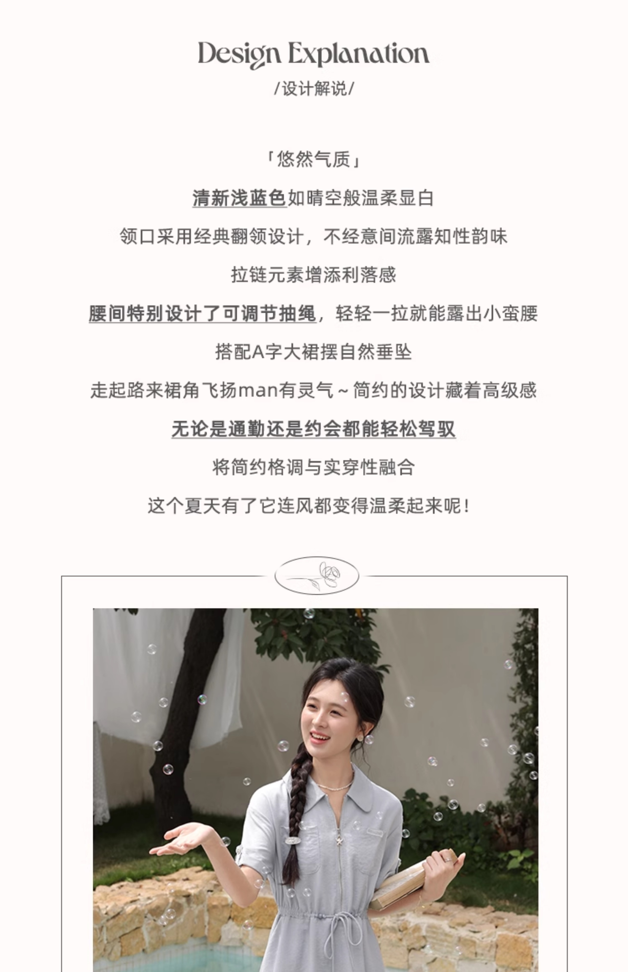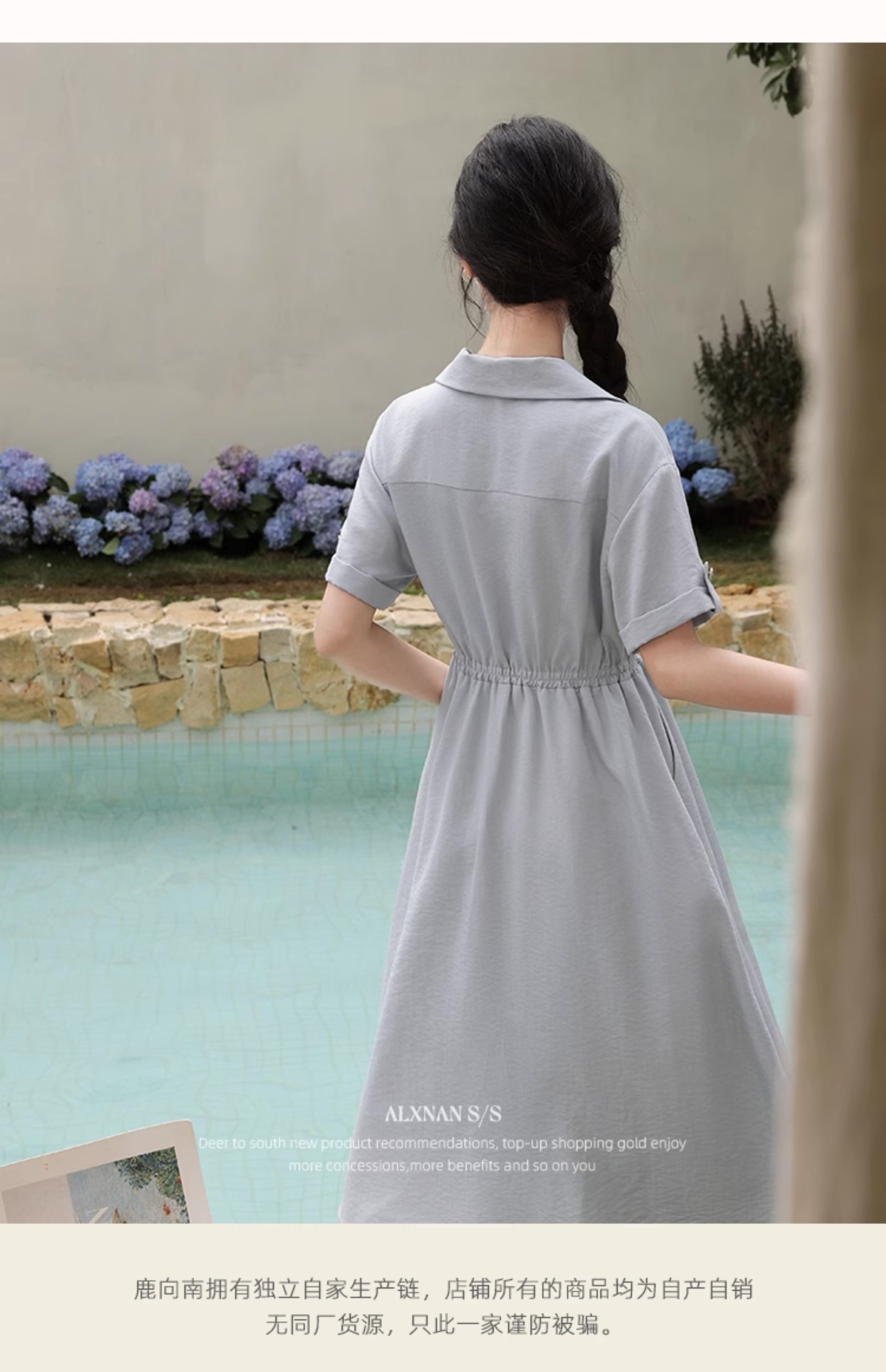 鹿向南「悠然气质」蓝色连衣裙女夏短袖衬衫裙收腰长裙子