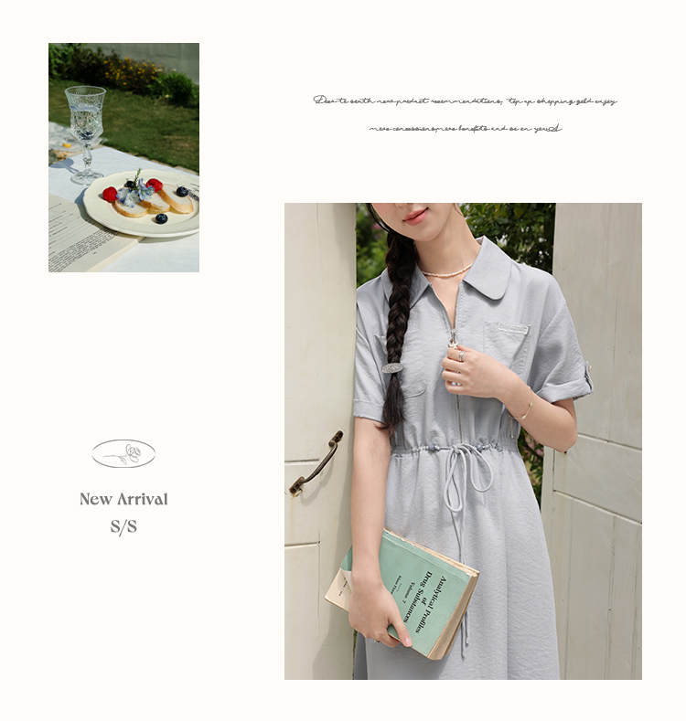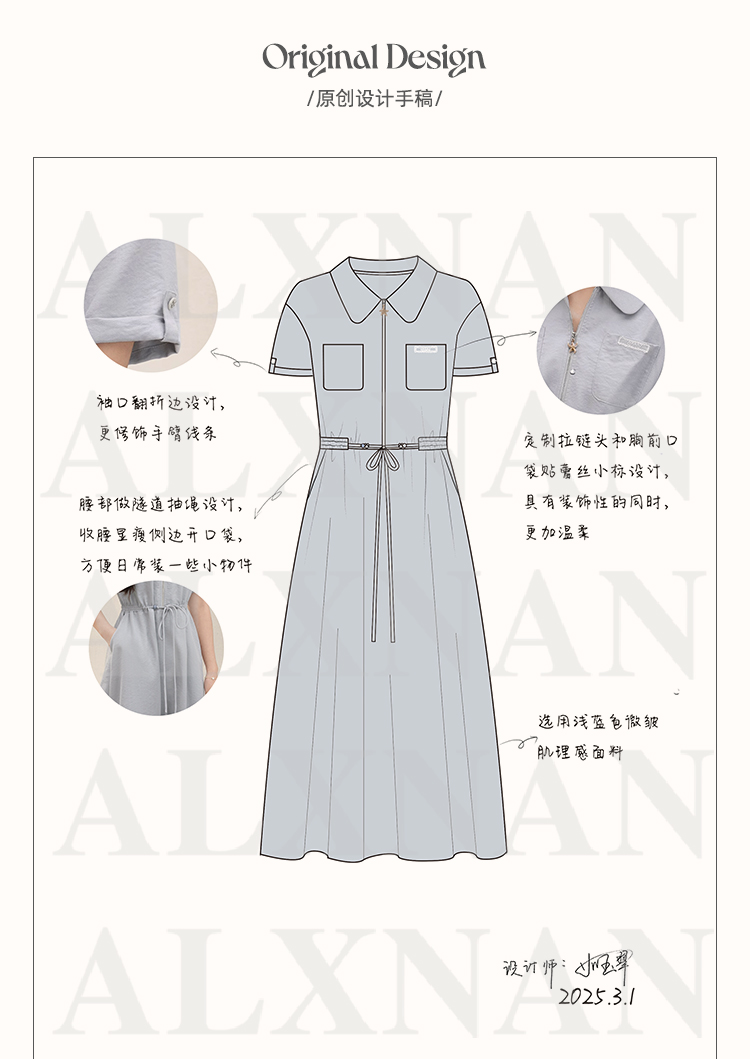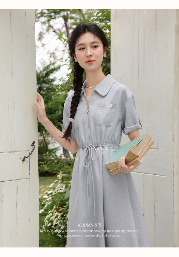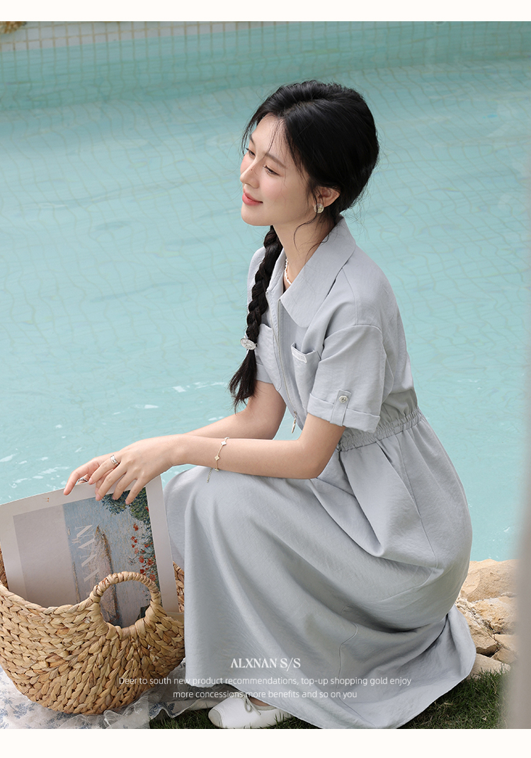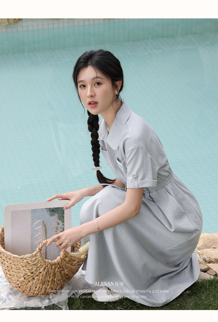 鹿向南「悠然气质」蓝色连衣裙女夏短袖衬衫裙收腰长裙子