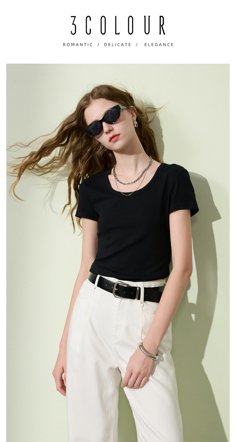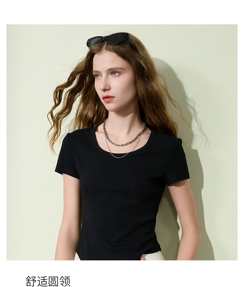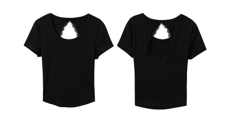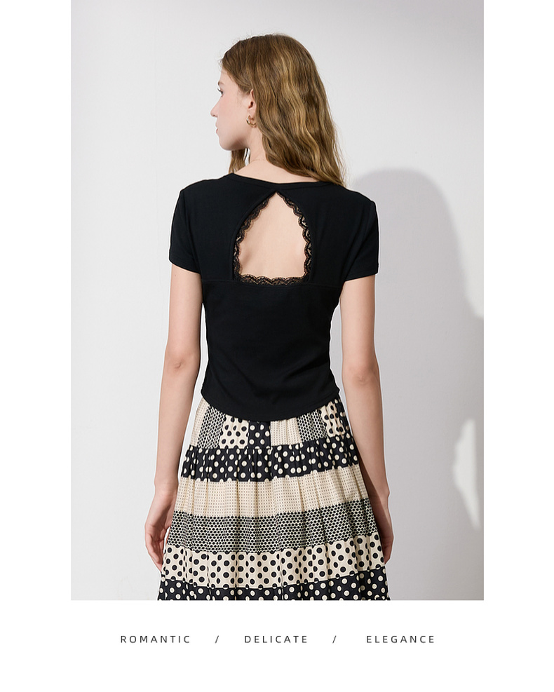 三彩2025夏季新款镂空花边T恤修身短款圆领正肩短袖套头衫上衣M