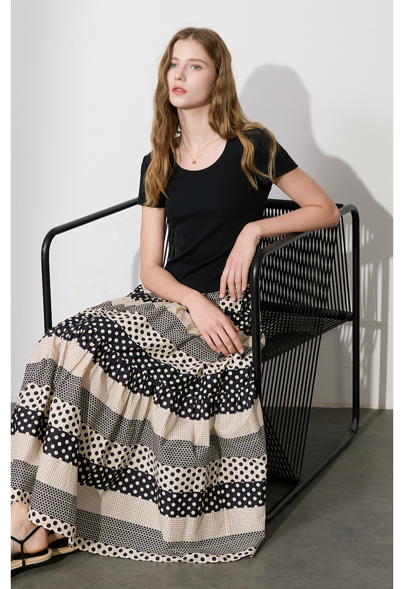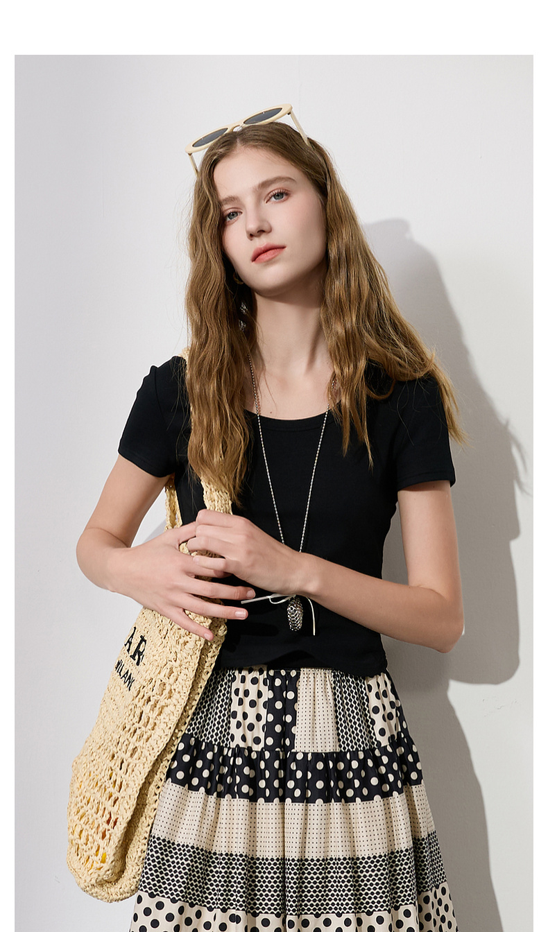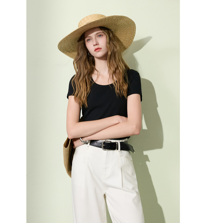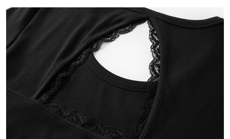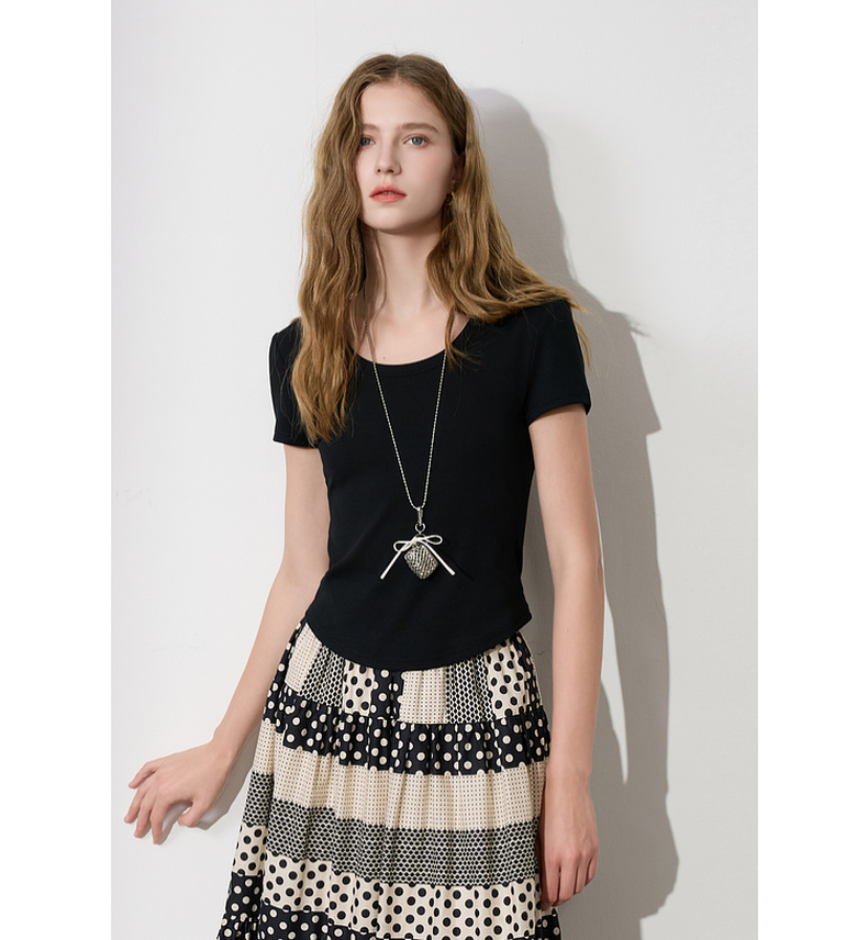 三彩2025夏季新款镂空花边T恤修身短款圆领正肩短袖套头衫上衣M