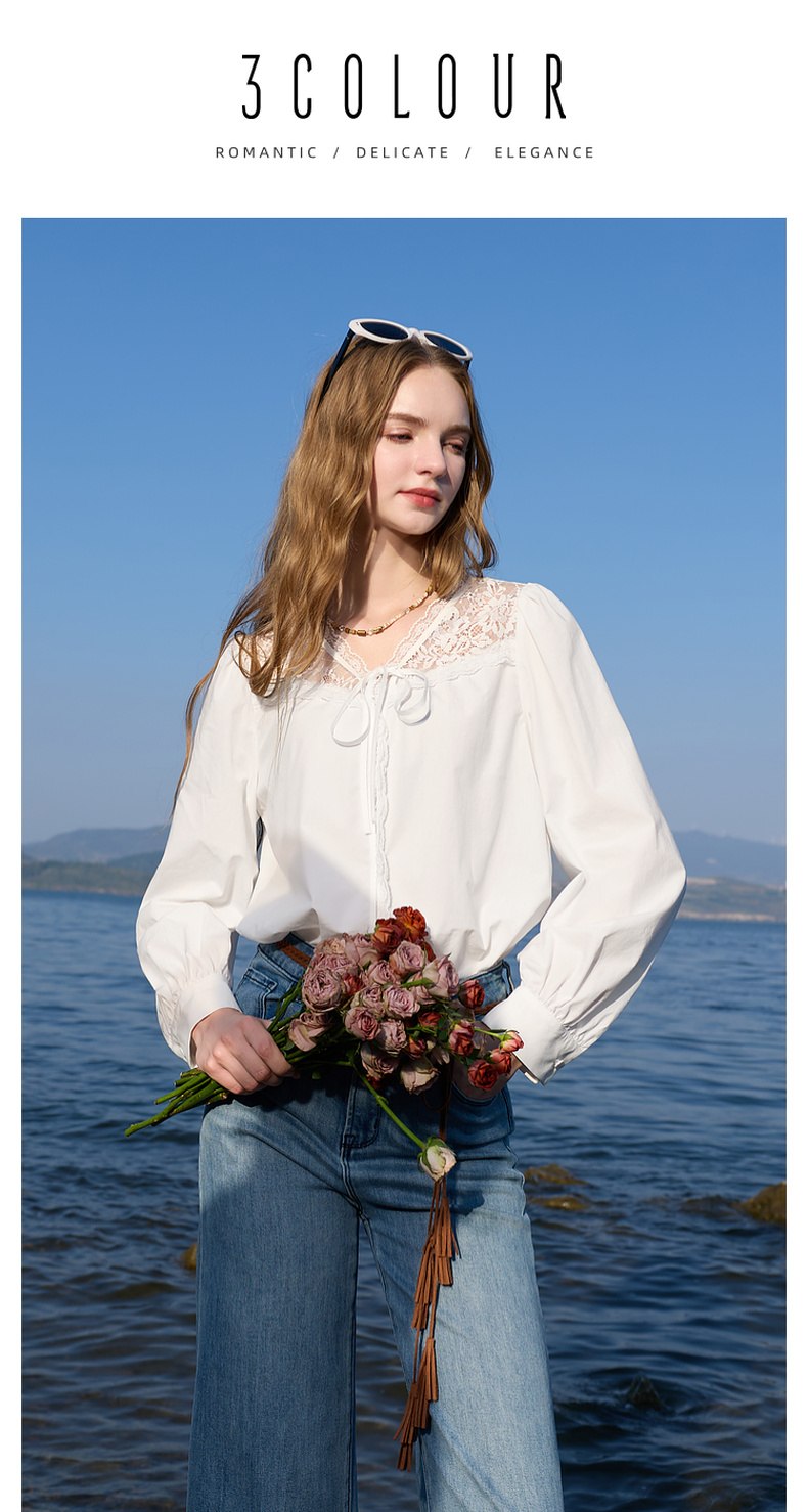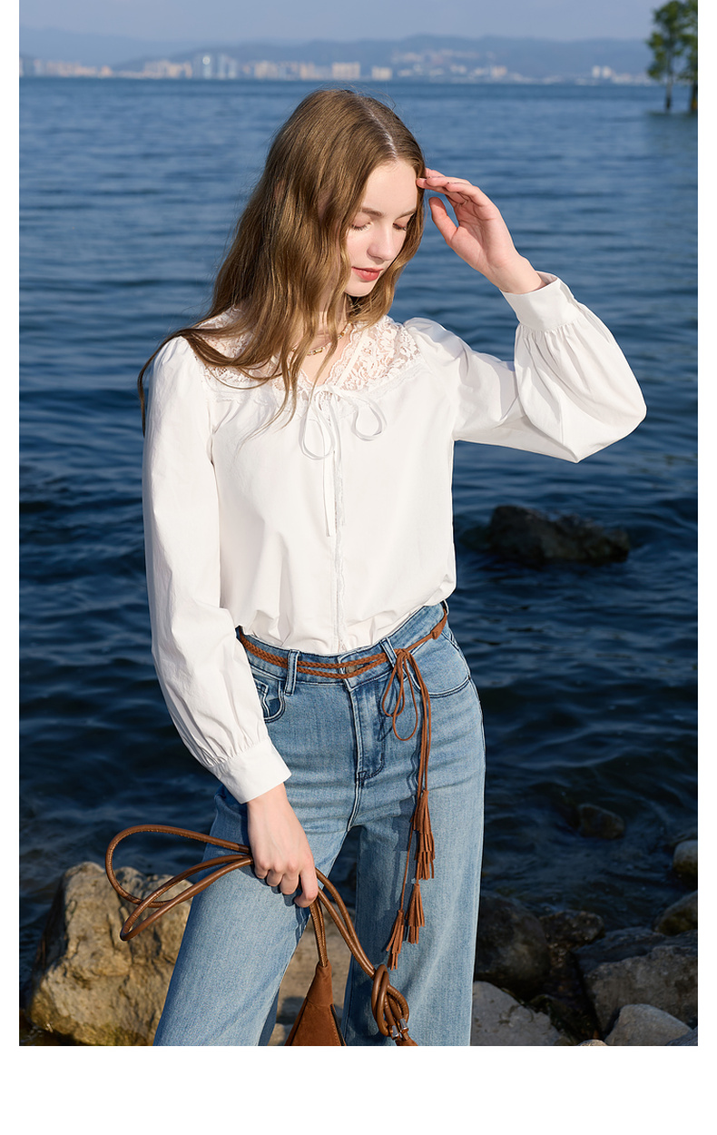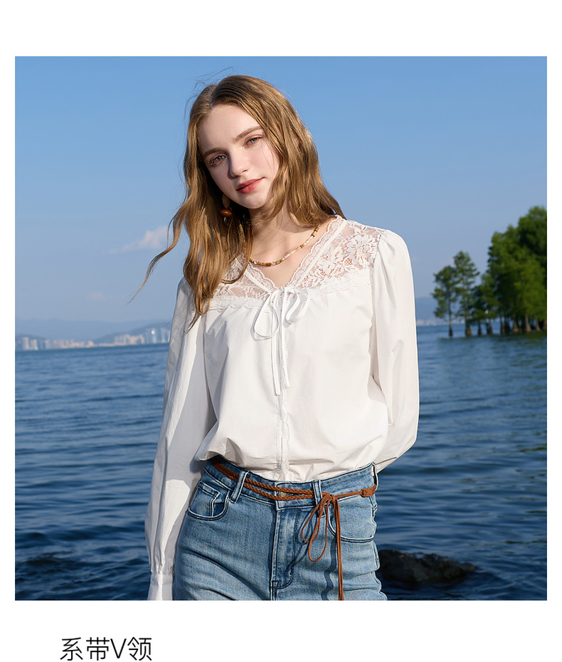 三彩2025秋季新款系带蕾丝V领宽松衬衫长袖衬衣上衣气质M