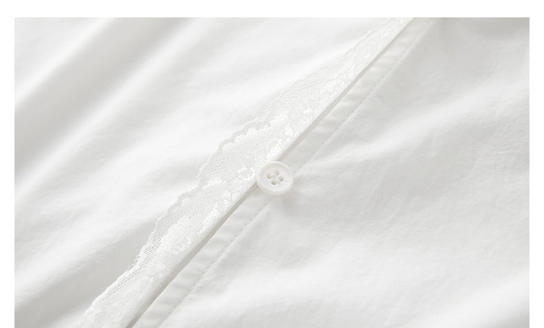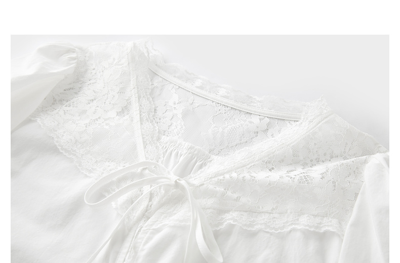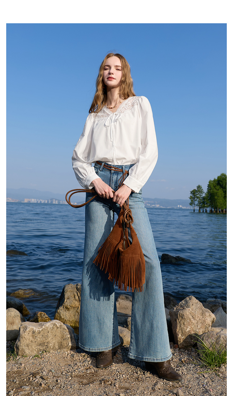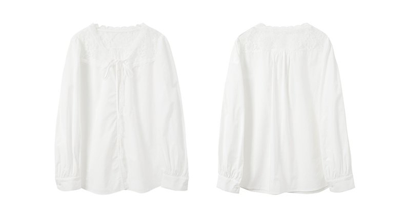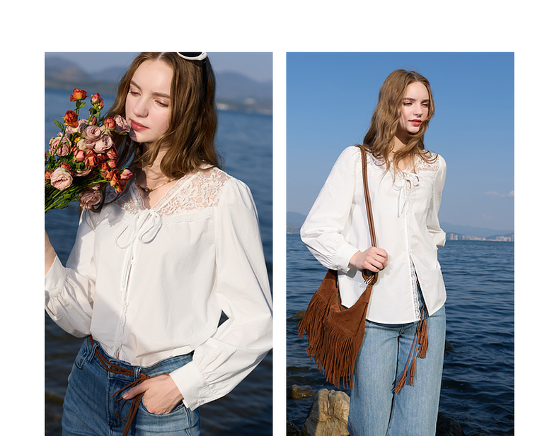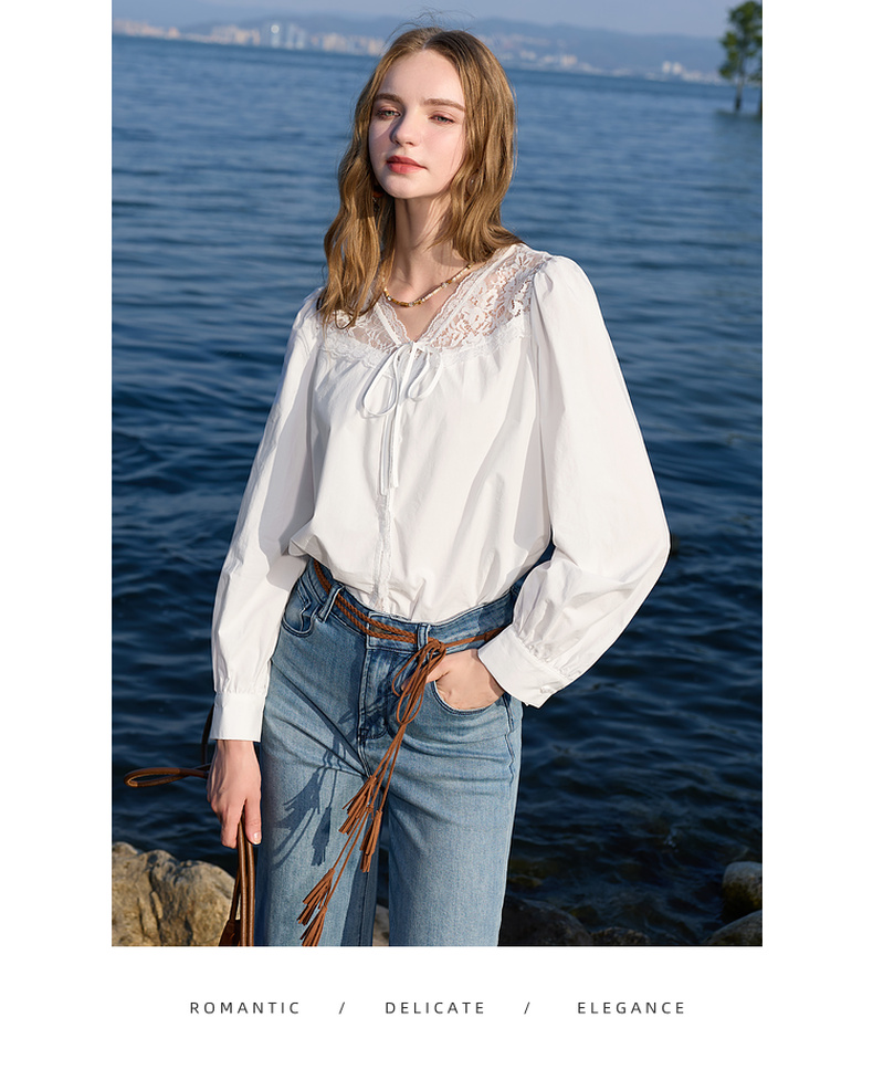 三彩2025秋季新款系带蕾丝V领宽松衬衫长袖衬衣上衣气质M