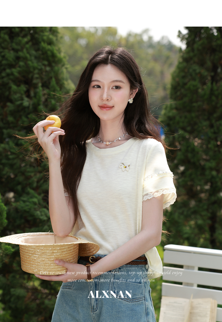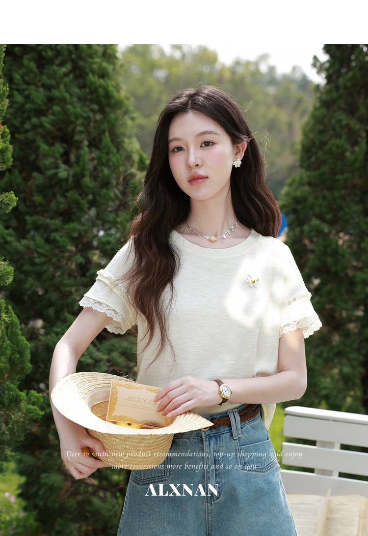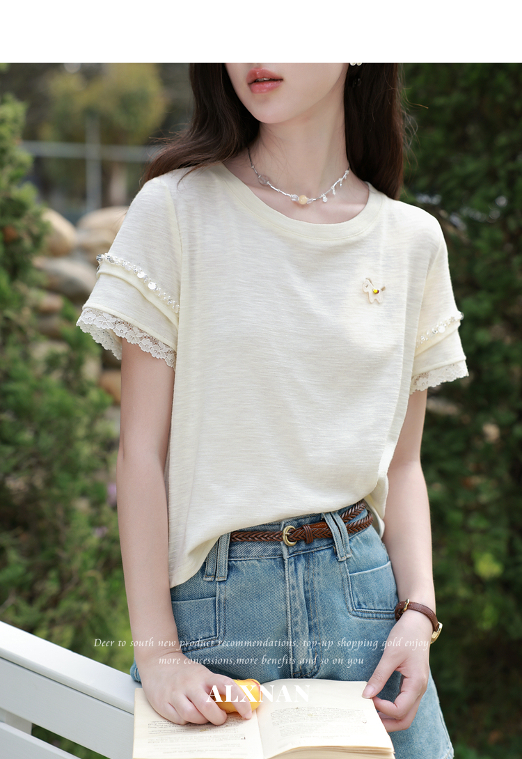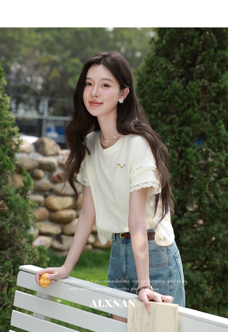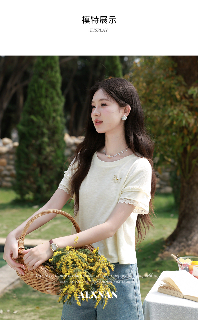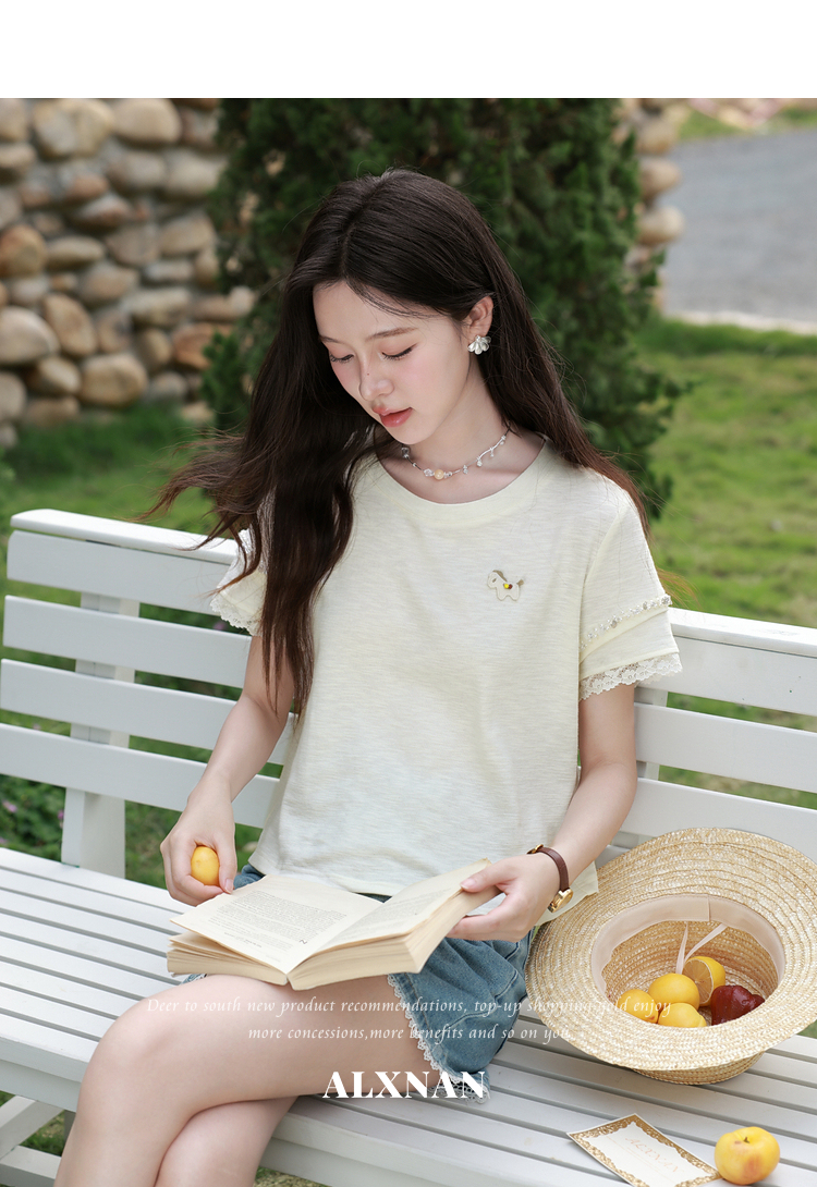 鹿向南「铃兰夏序」法式小资米白色T恤女夏新款气质好看短袖上衣