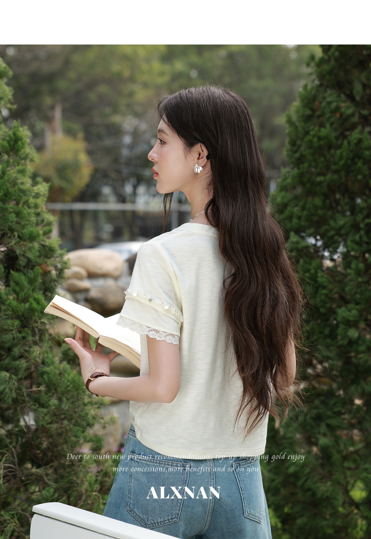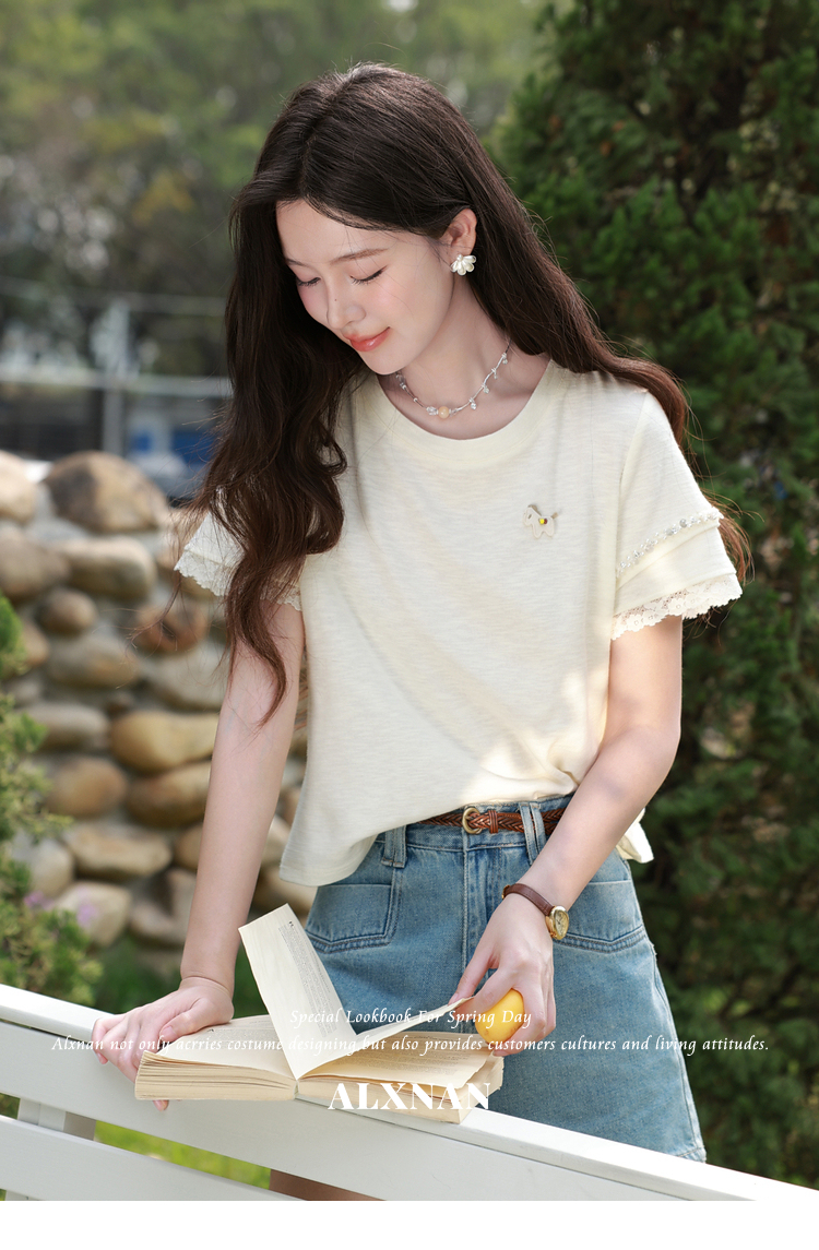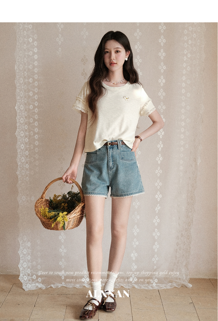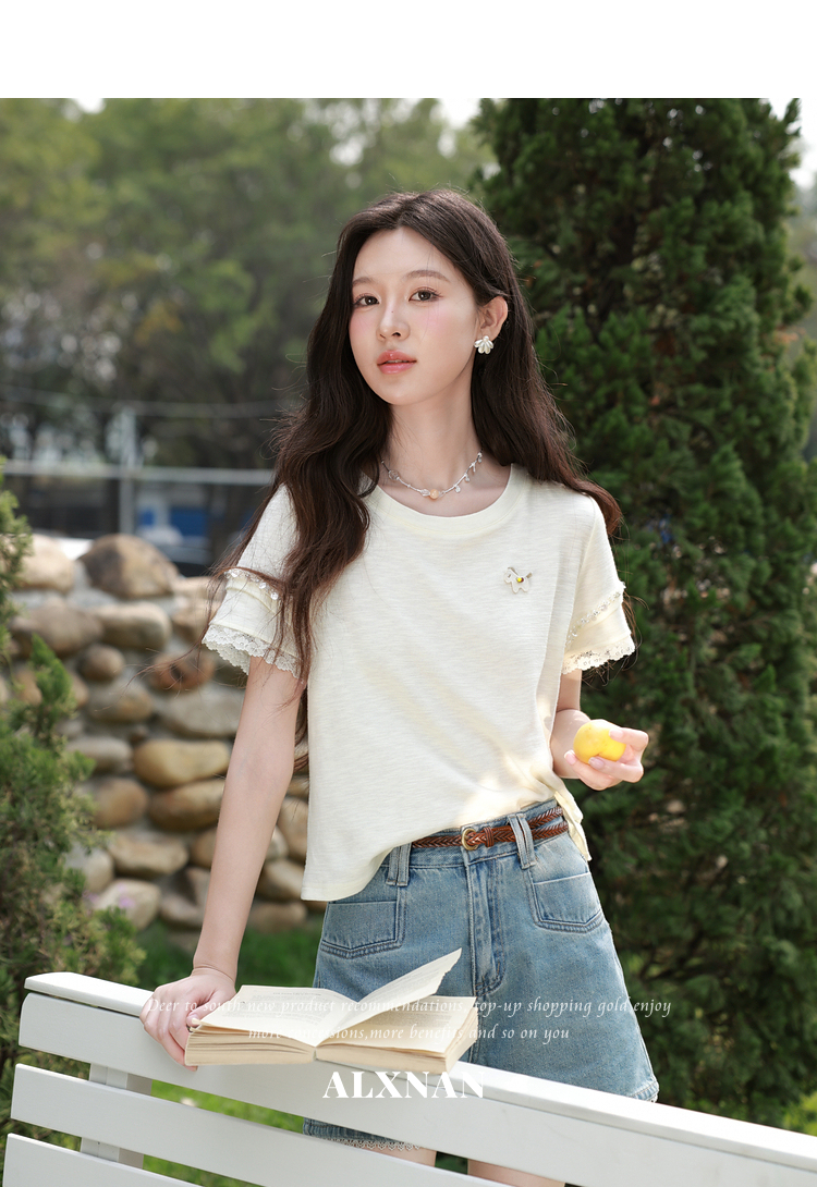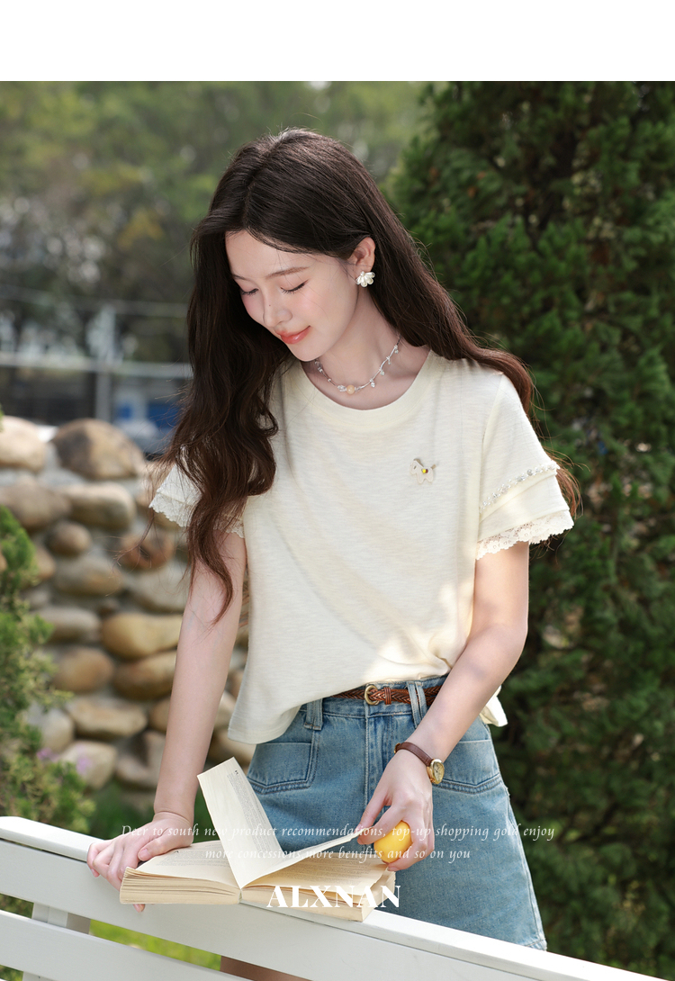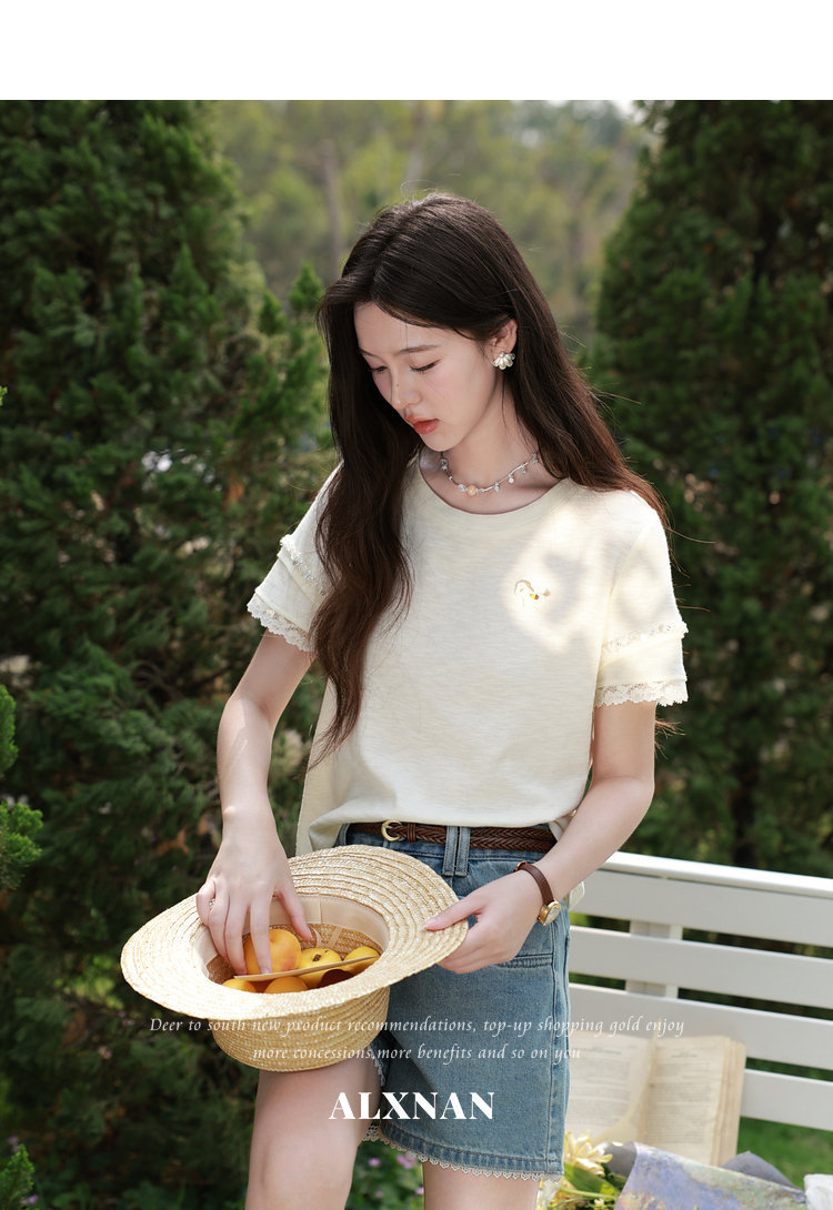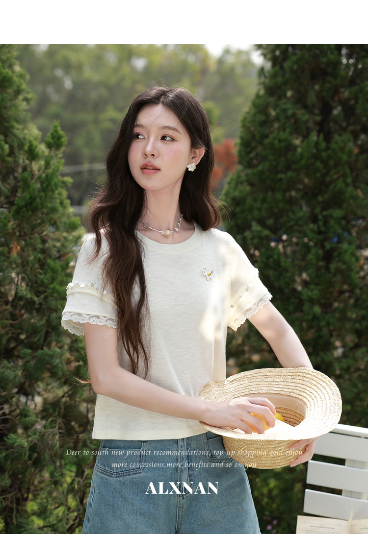 鹿向南「铃兰夏序」法式小资米白色T恤女夏新款气质好看短袖上衣