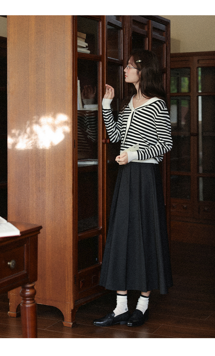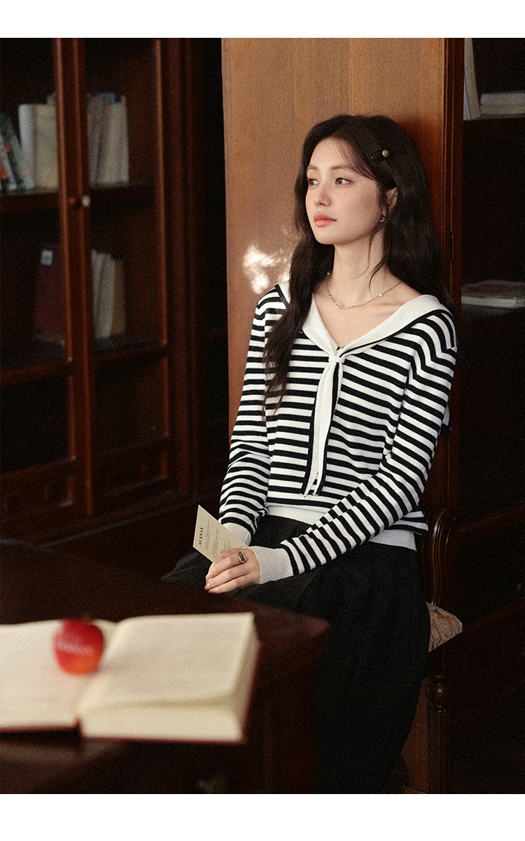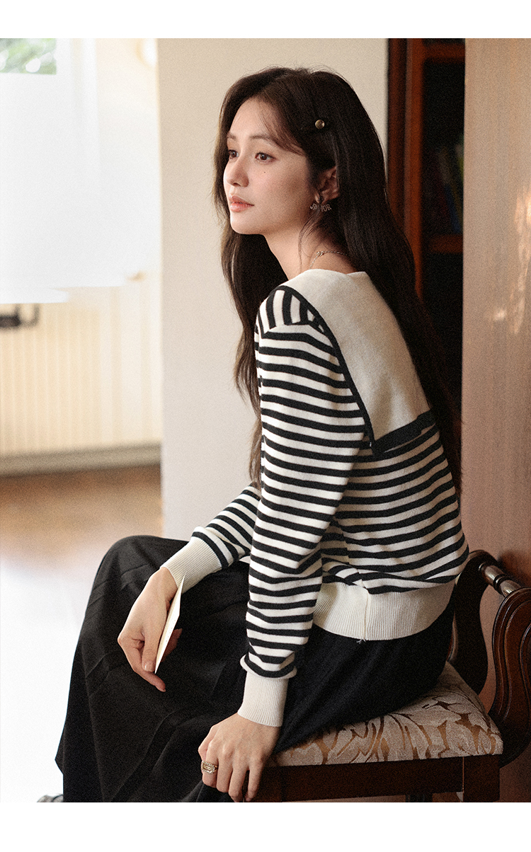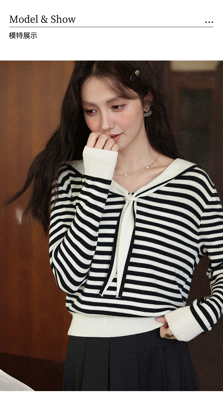 【6折秒杀】鹿向南「条纹序幕」海军领条纹针织衫女秋季新款显瘦减龄长袖上衣L57252