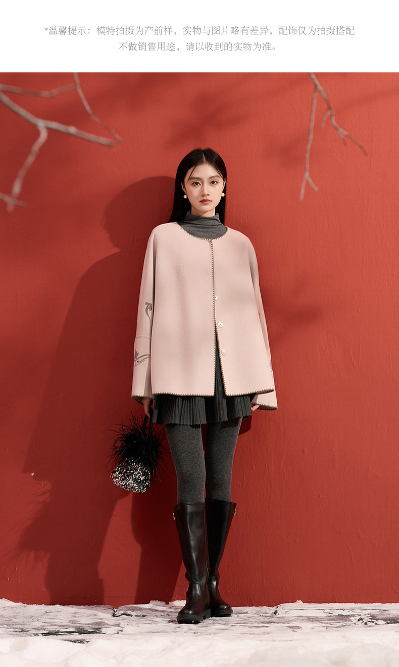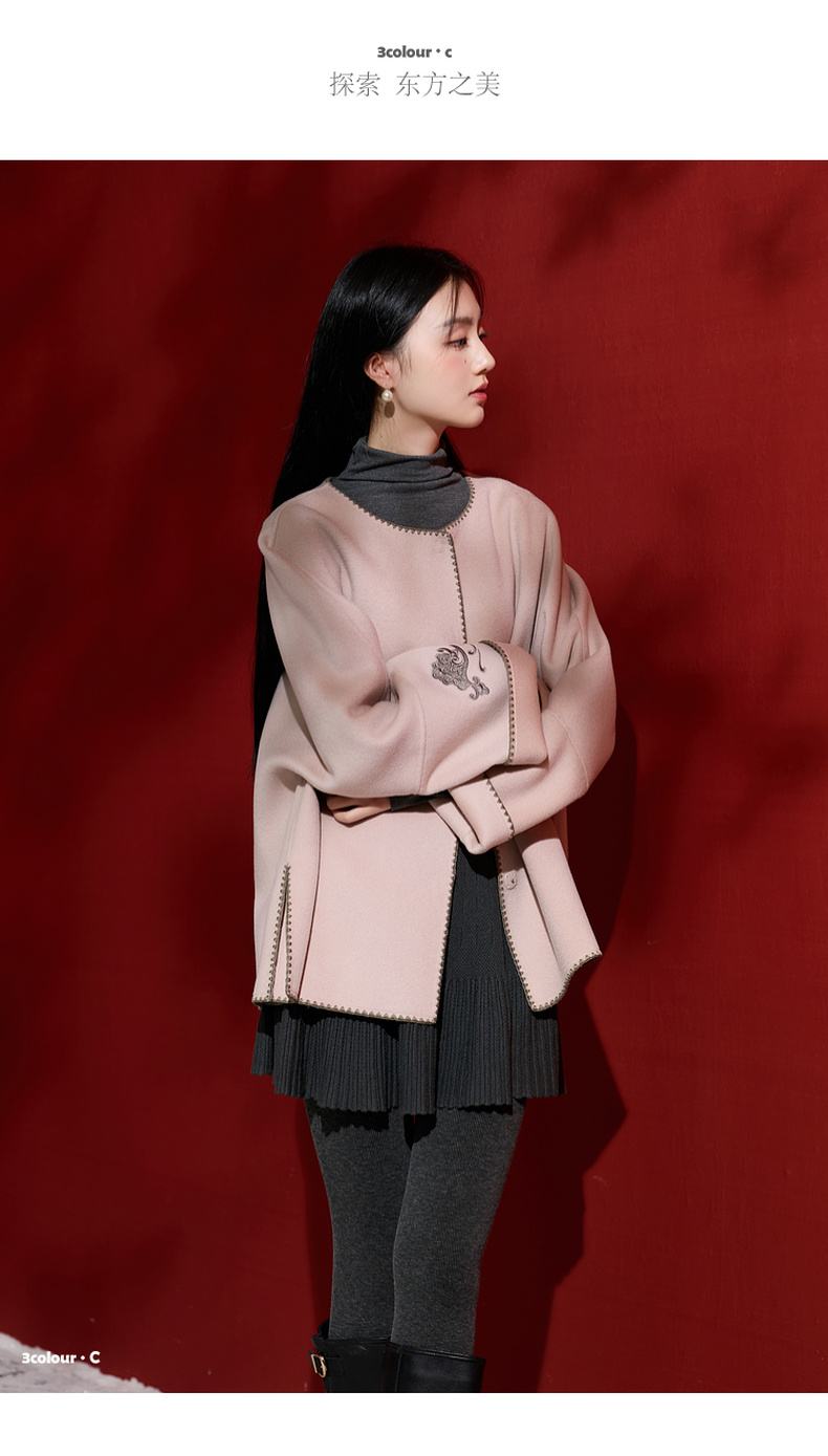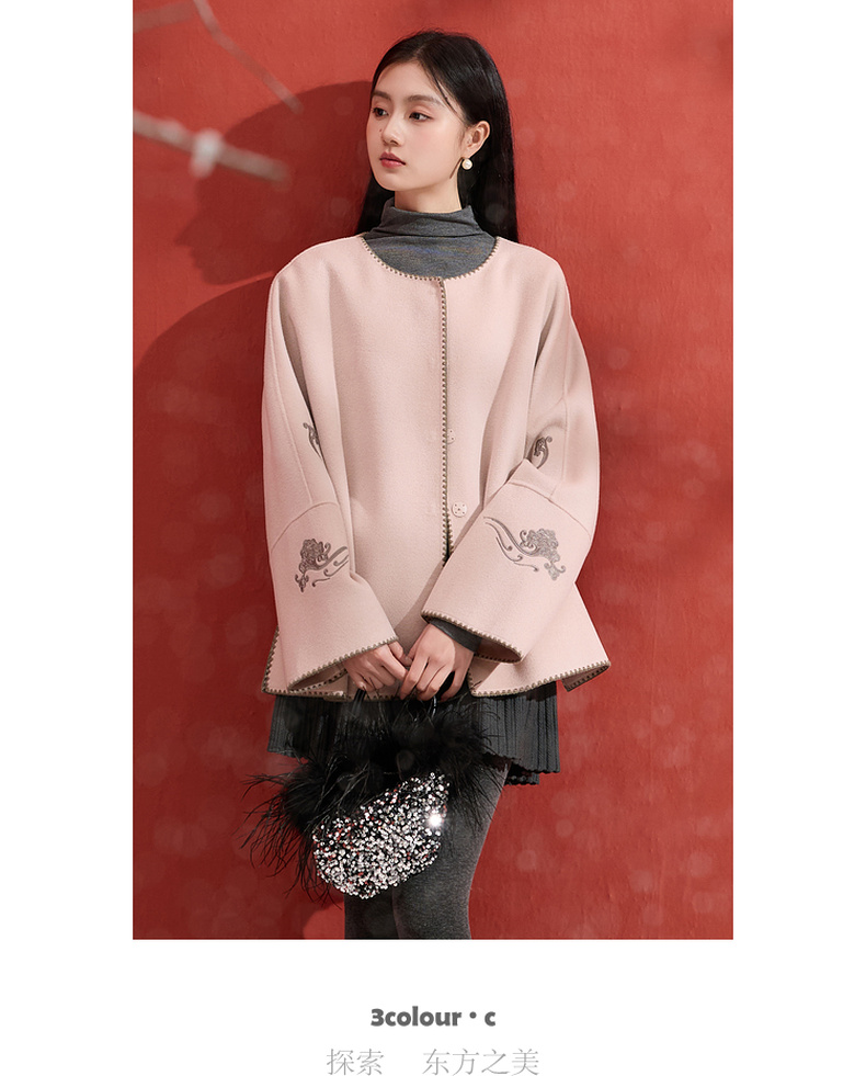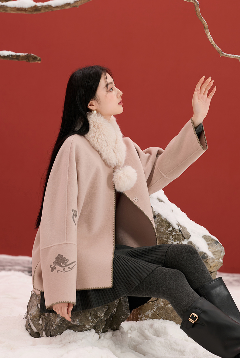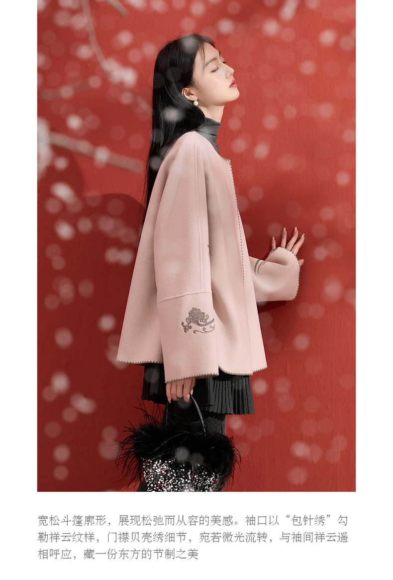 【社群秒杀】三彩【云卷云舒】2025冬季新款绵羊毛绣花双面呢大衣宽松C