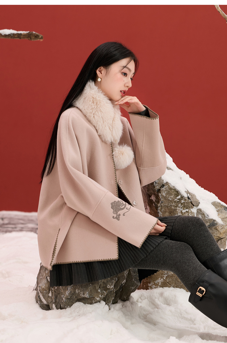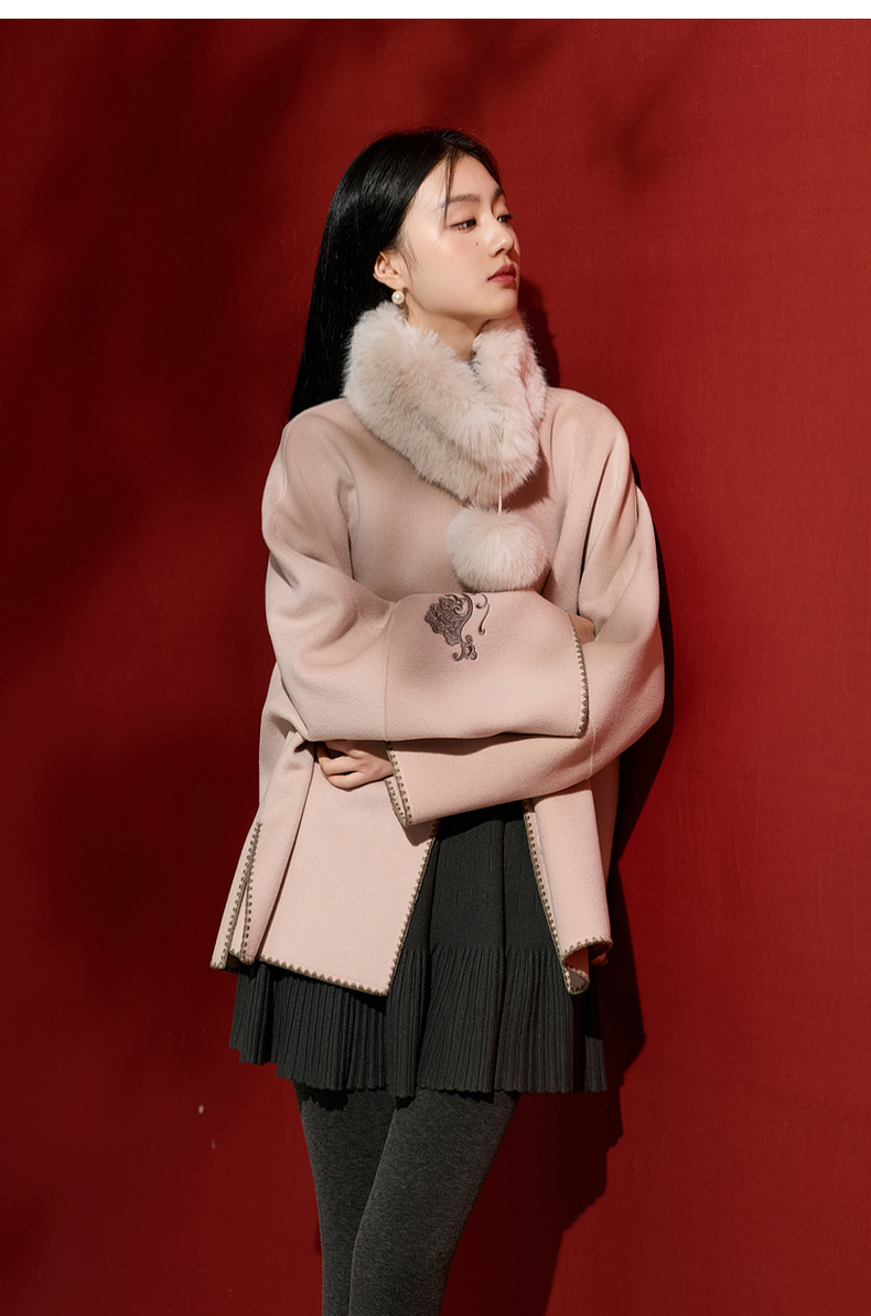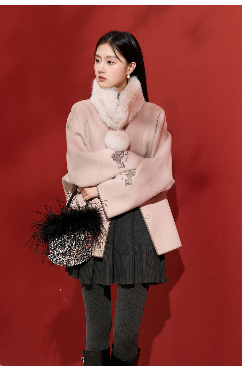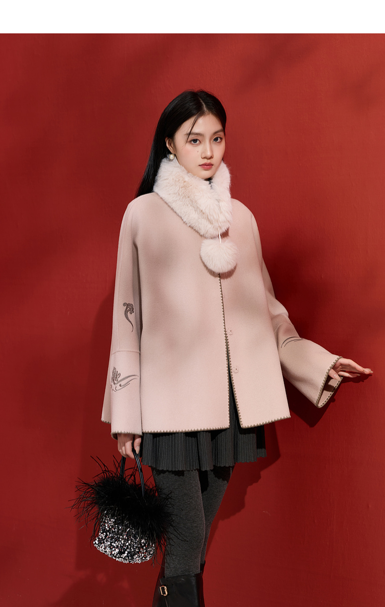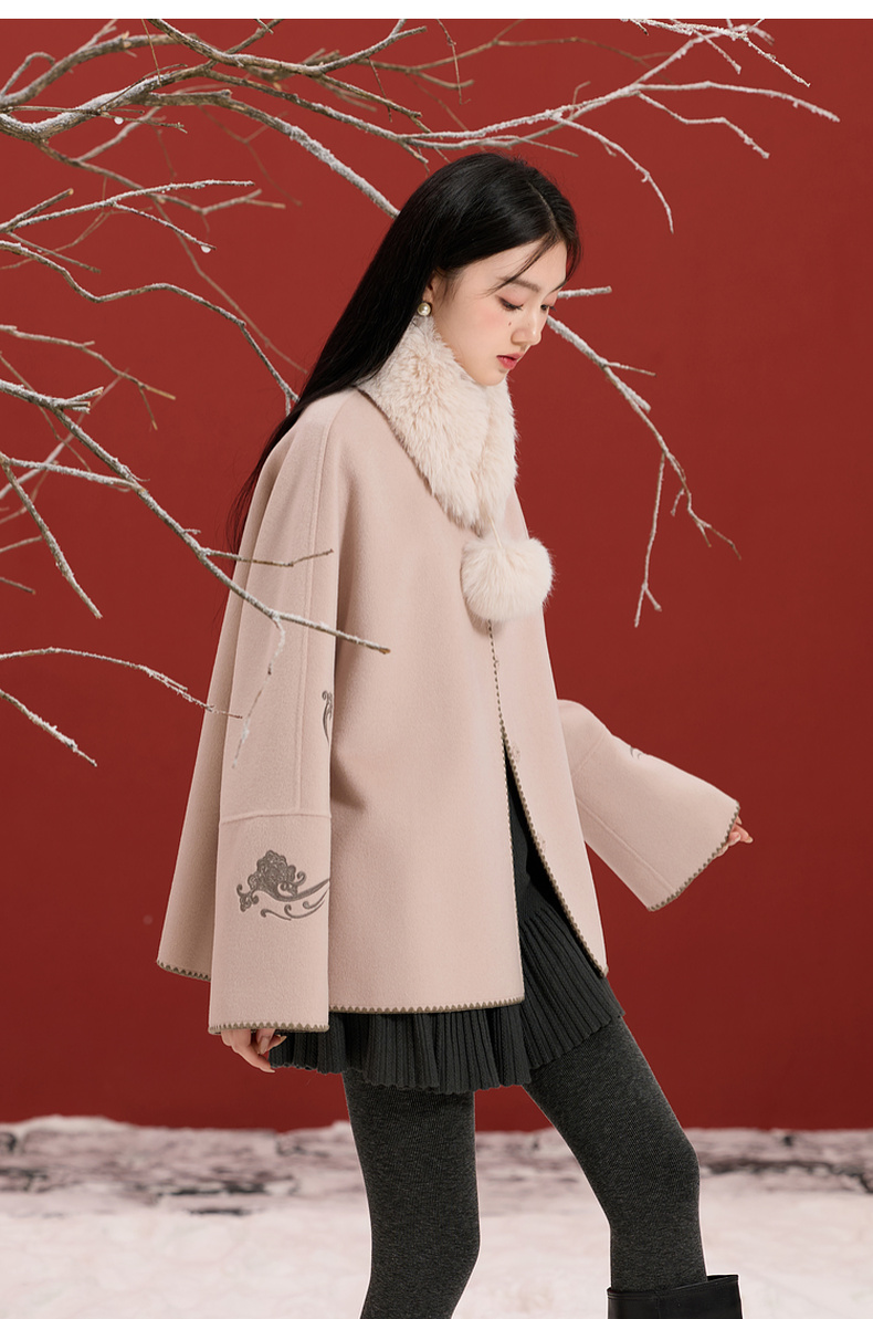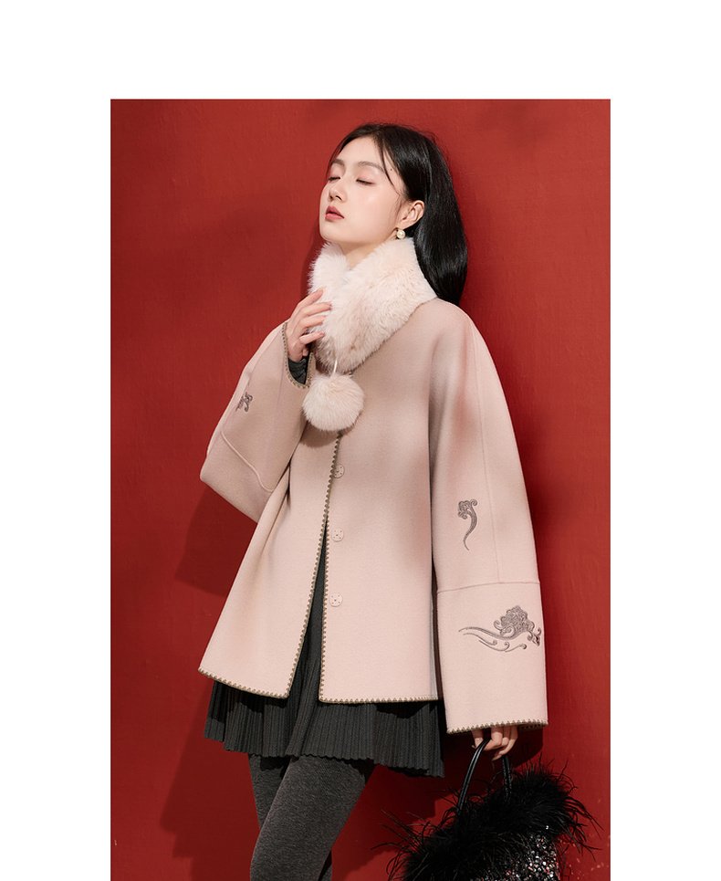 【社群秒杀】三彩【云卷云舒】2025冬季新款绵羊毛绣花双面呢大衣宽松C