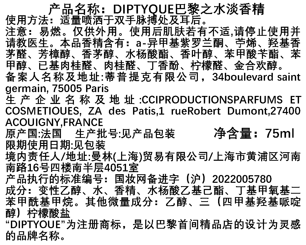 Diptyque蒂普(菩)提克 巴黎之水香水