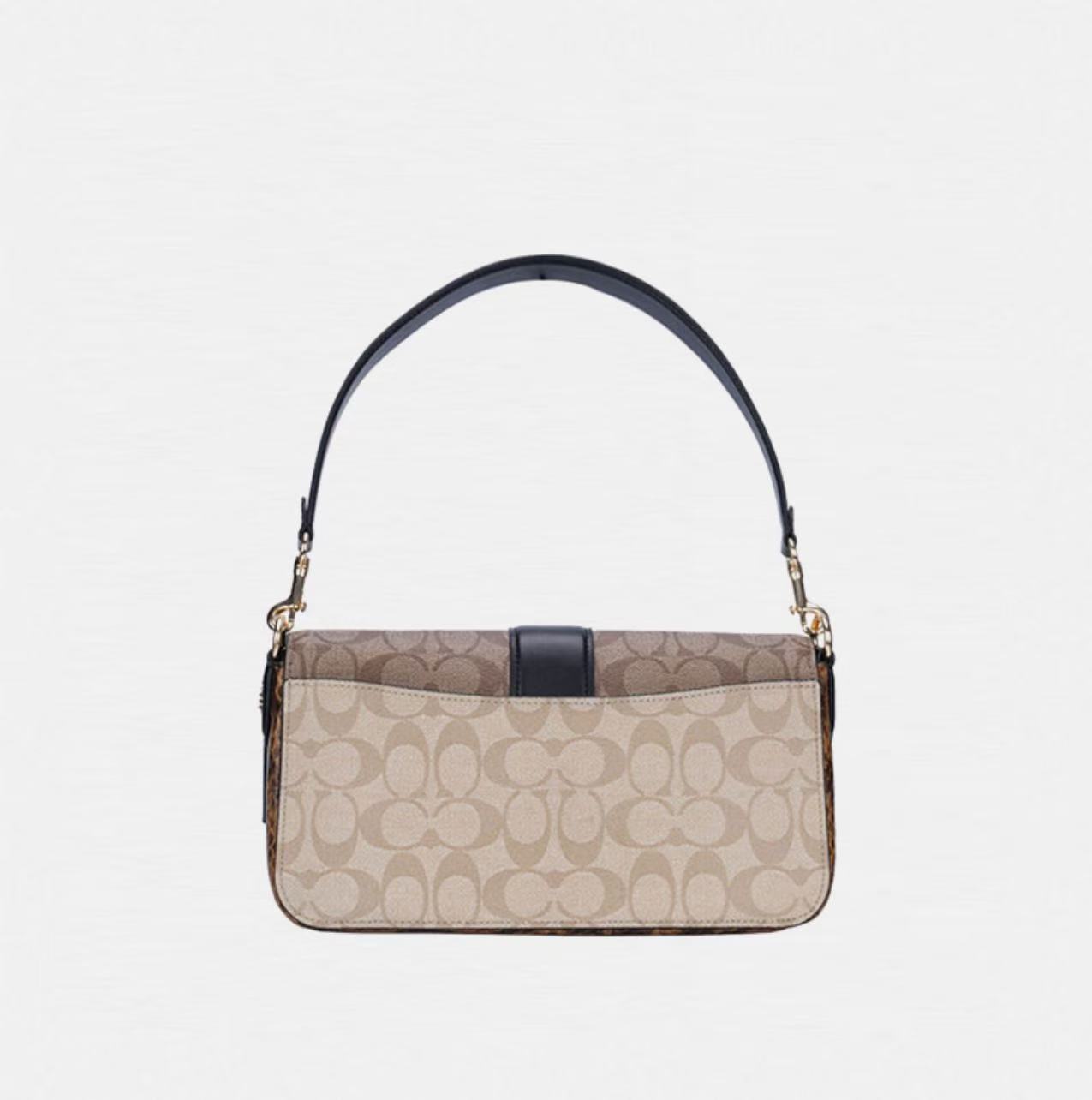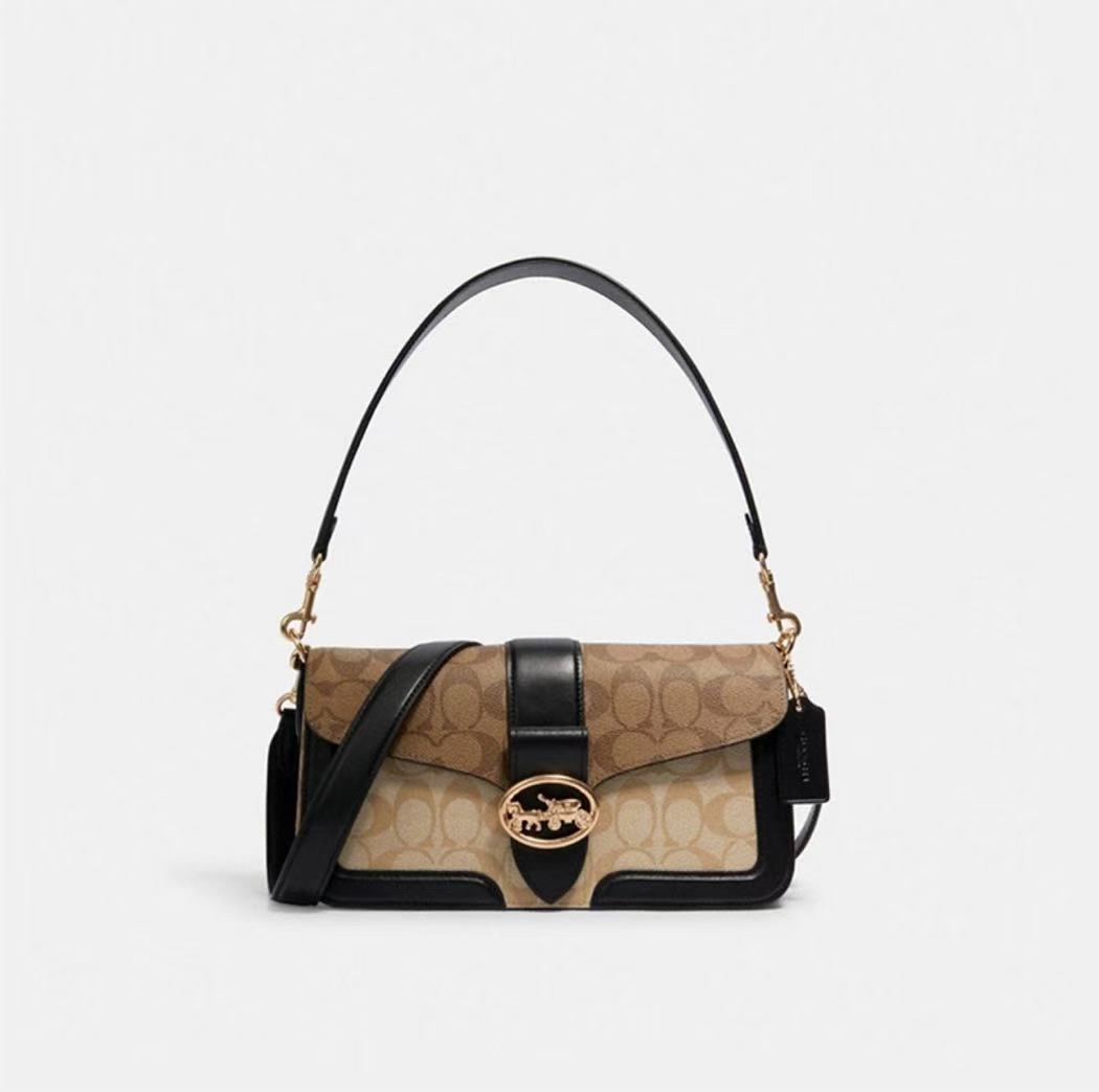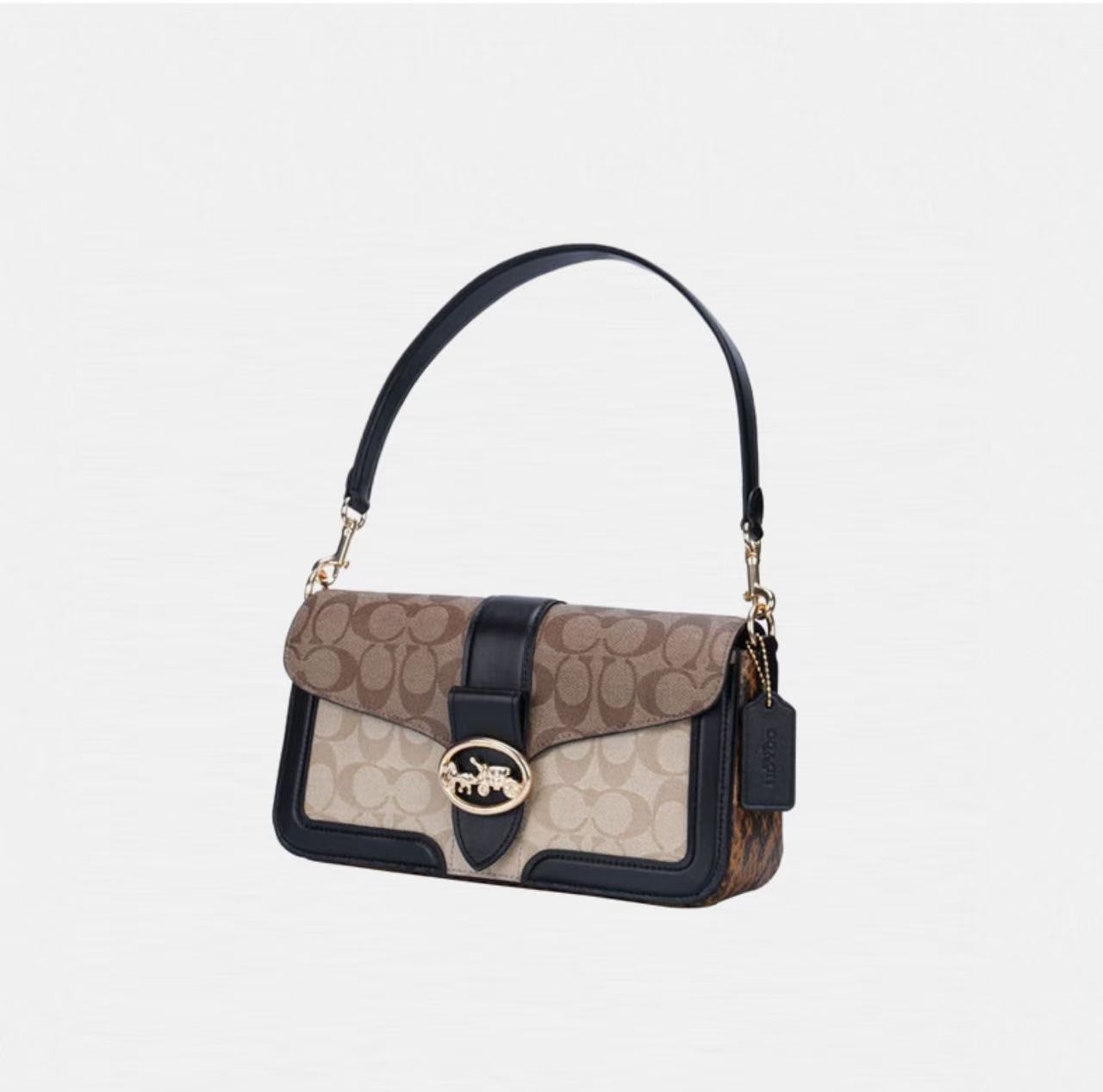 COACH蔻驰 Georgie 27 时尚徽标Logo 涂层帆布拼光滑皮革拼蛇纹压纹皮革 酒神包腋下包手提斜挎单肩包 大号 女款 黑色配卡其色