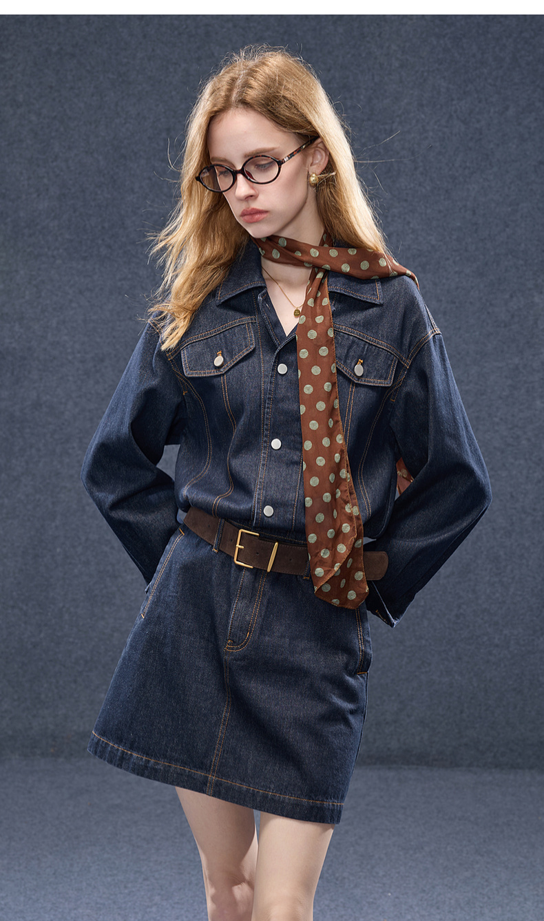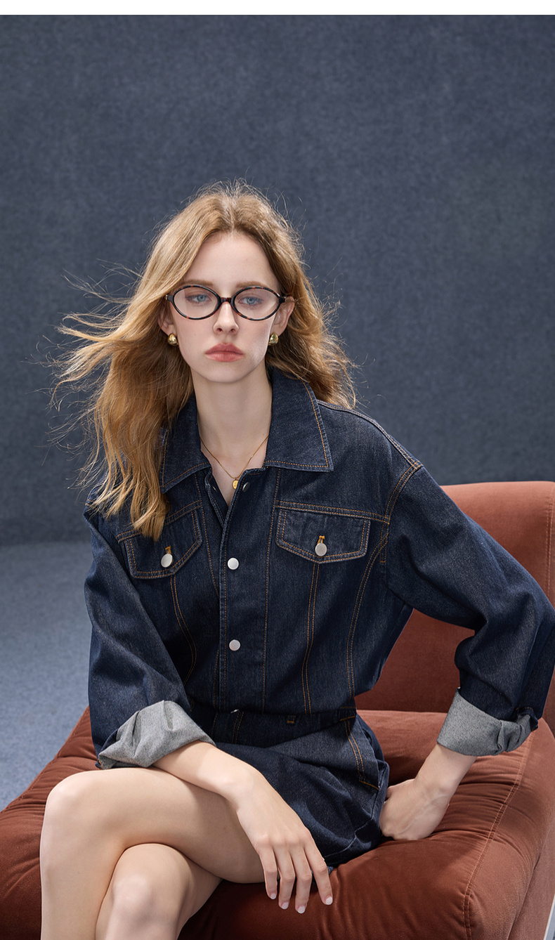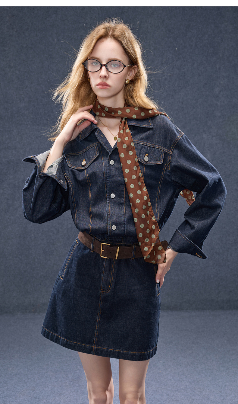 【100棉】三彩2025秋季新款翻领牛仔裙连衣裙直筒短裙甜酷M