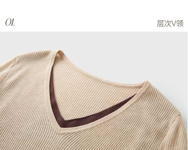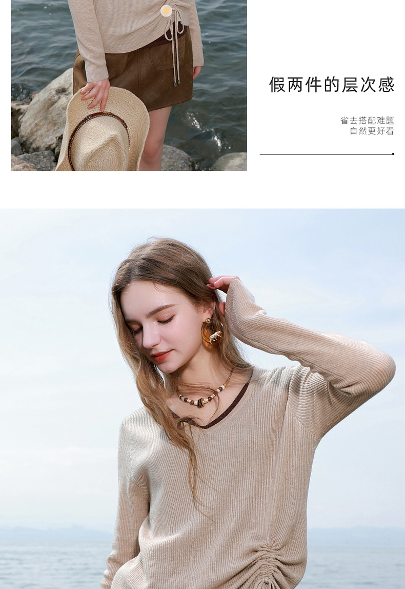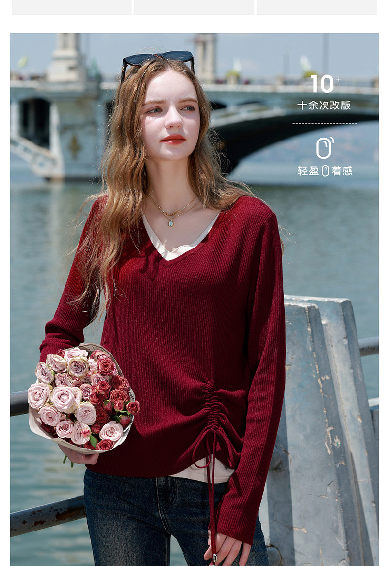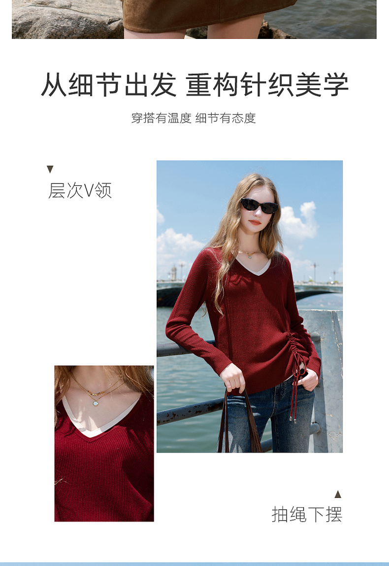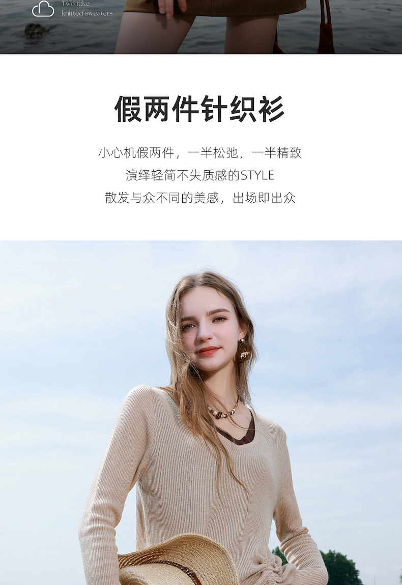 三彩2025秋季新款假两件针织衫V领毛衫长袖套头休闲M