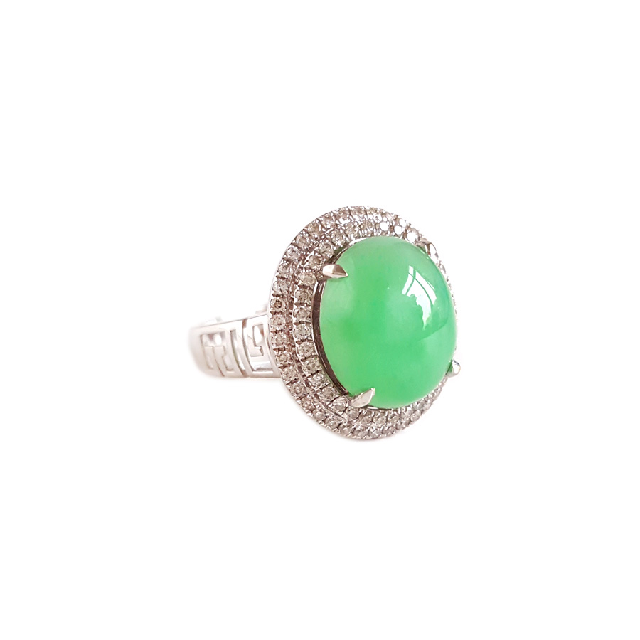 【天然正品】A货翡翠AU750白金豪镶钻镶天然细腻满绿糯种蛋面翡翠戒指12.9*11.3MM(皆取最大值)13.5号(戒圈可改)女士281025AH22