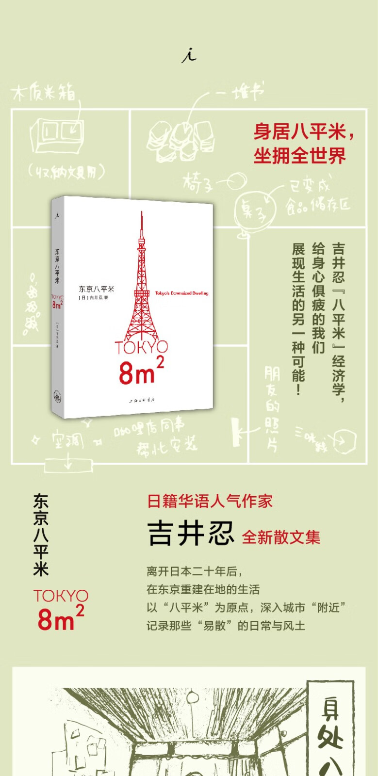 《东京八平米》是日籍华语作家吉井忍的全新散文集,是其对在东京亲手建立起另一种日常的记录。八平米在日本被称为“四畳半”,即只有四个半榻榻米大小的房间,租金便宜。因为八平米房间没有厨房和冰箱,也没有洗澡间和洗衣机,她兴致勃勃地写起如何饮食起居,以及亲历的日本庶民生活日常。居住空间逼仄,她把生活延伸到城市的街头和公共空间,写东京的洗衣店、钱汤、咖啡馆、24小时漫咖店、独立电影院、小餐厅等,同时写下她遇见的东京平民故事,这些人物是“看不见的、真正的东京人”,他们的故事为我们铺陈日本的世情百态,亦照见自身。