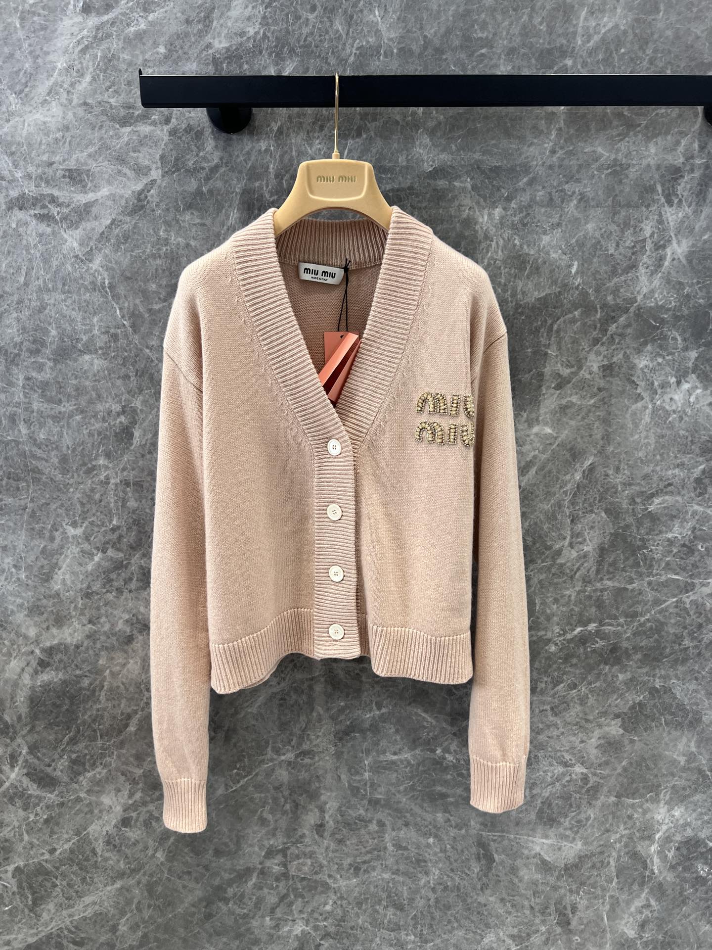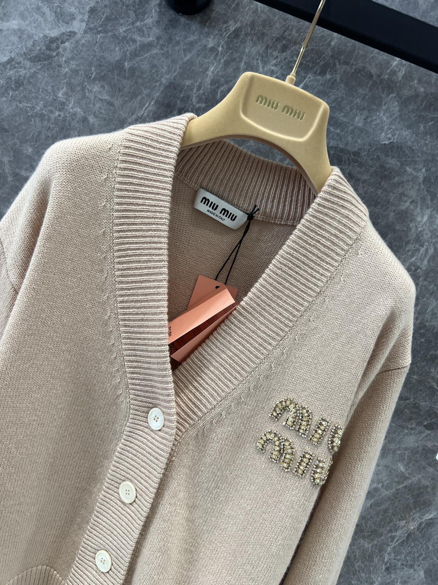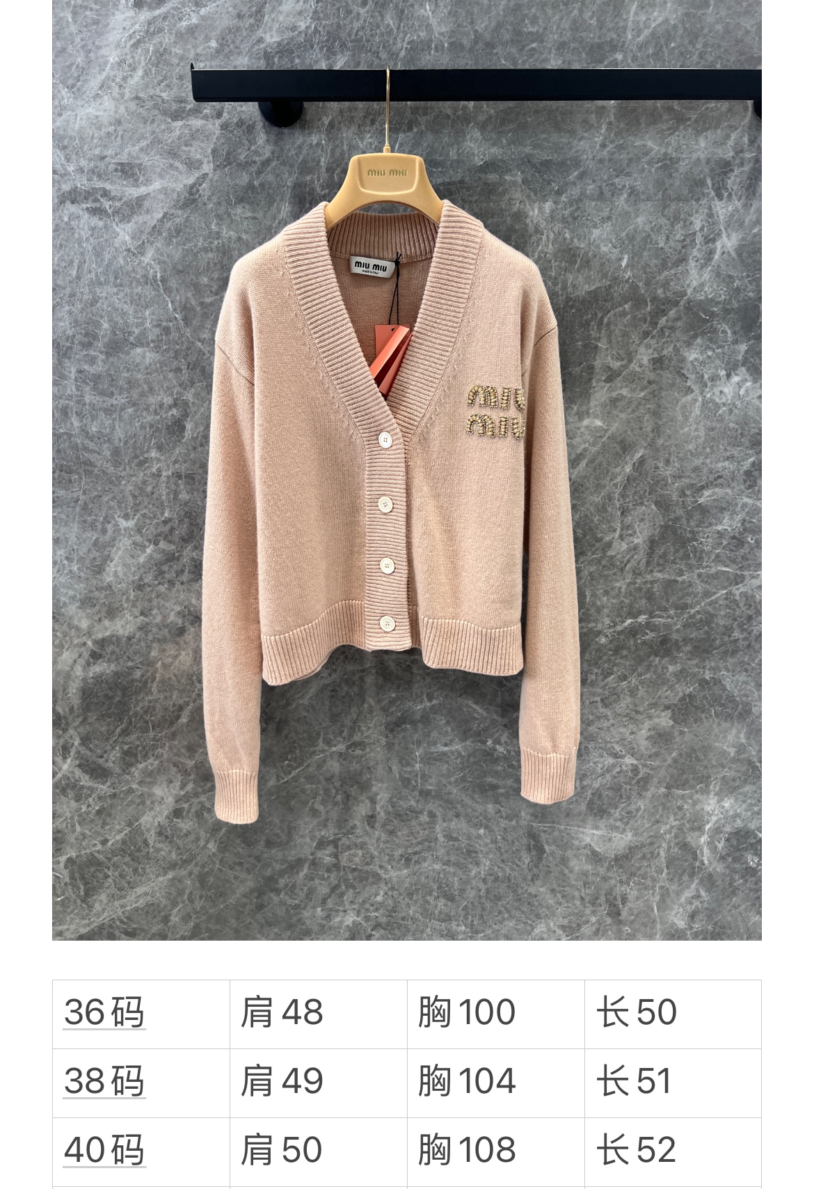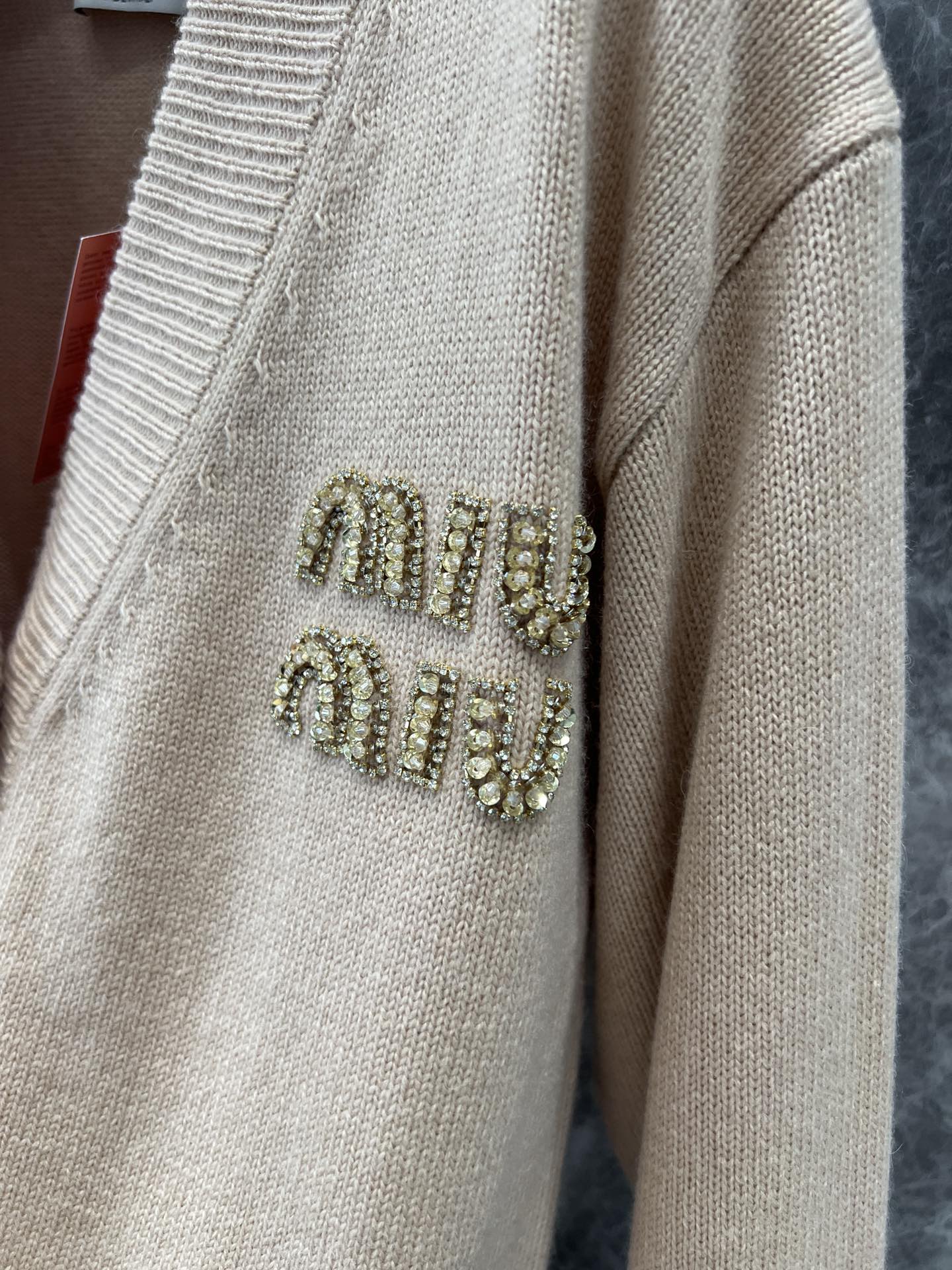 MIU复古少女系风格,V领设计开衫精致大方的款式,手工珠钻MIU字母logo设计,小重工又不繁琐,尽显优雅少女时髦感,面料是100%山羊绒,经过特殊处理,上身一点都不会扎 很奶糯的感觉!
