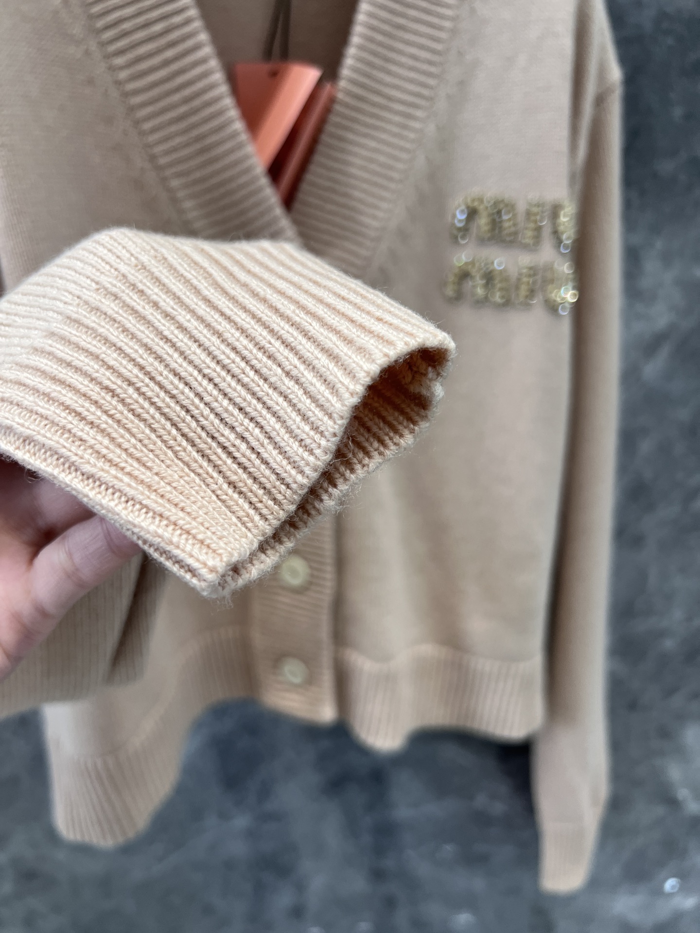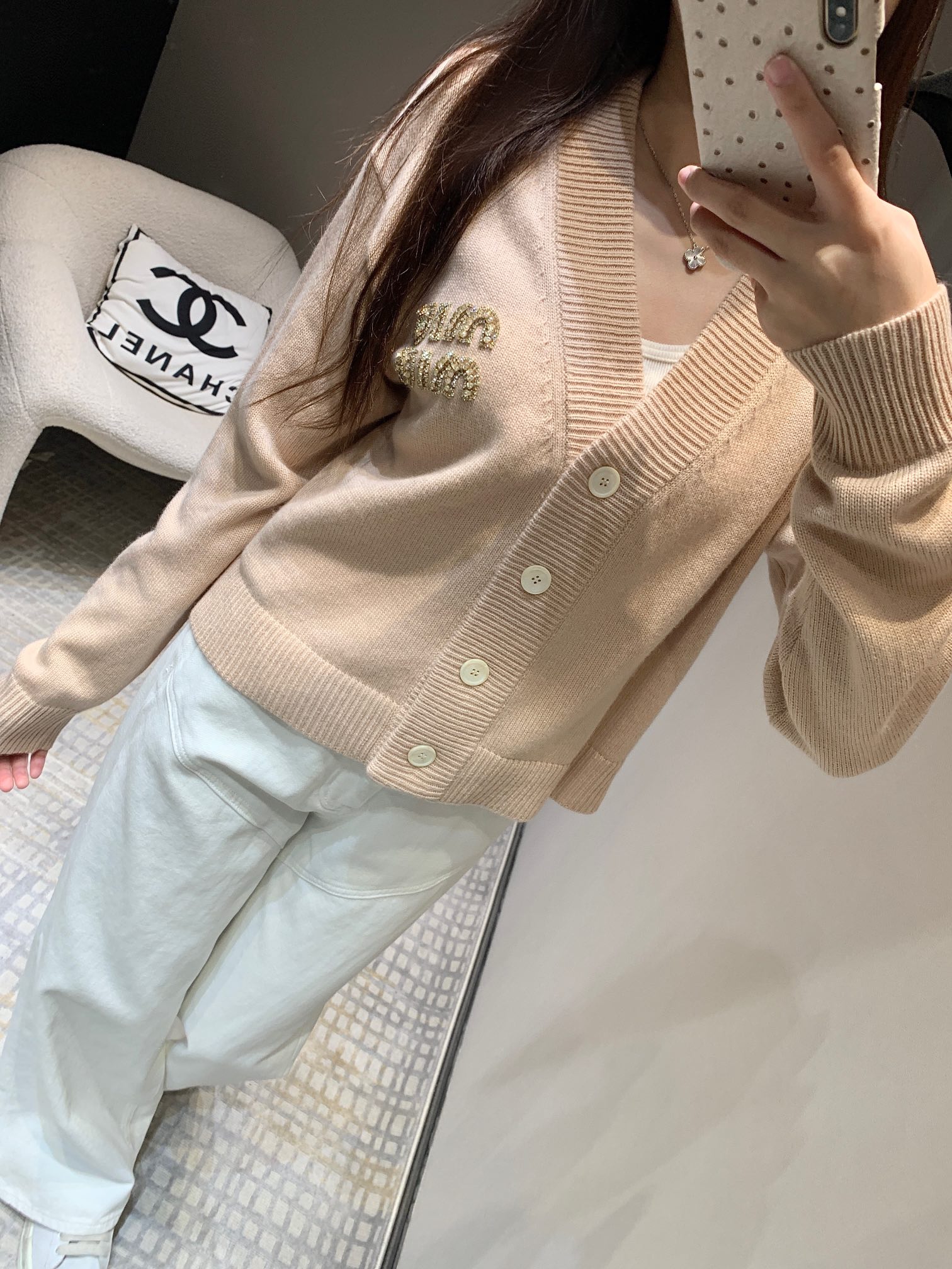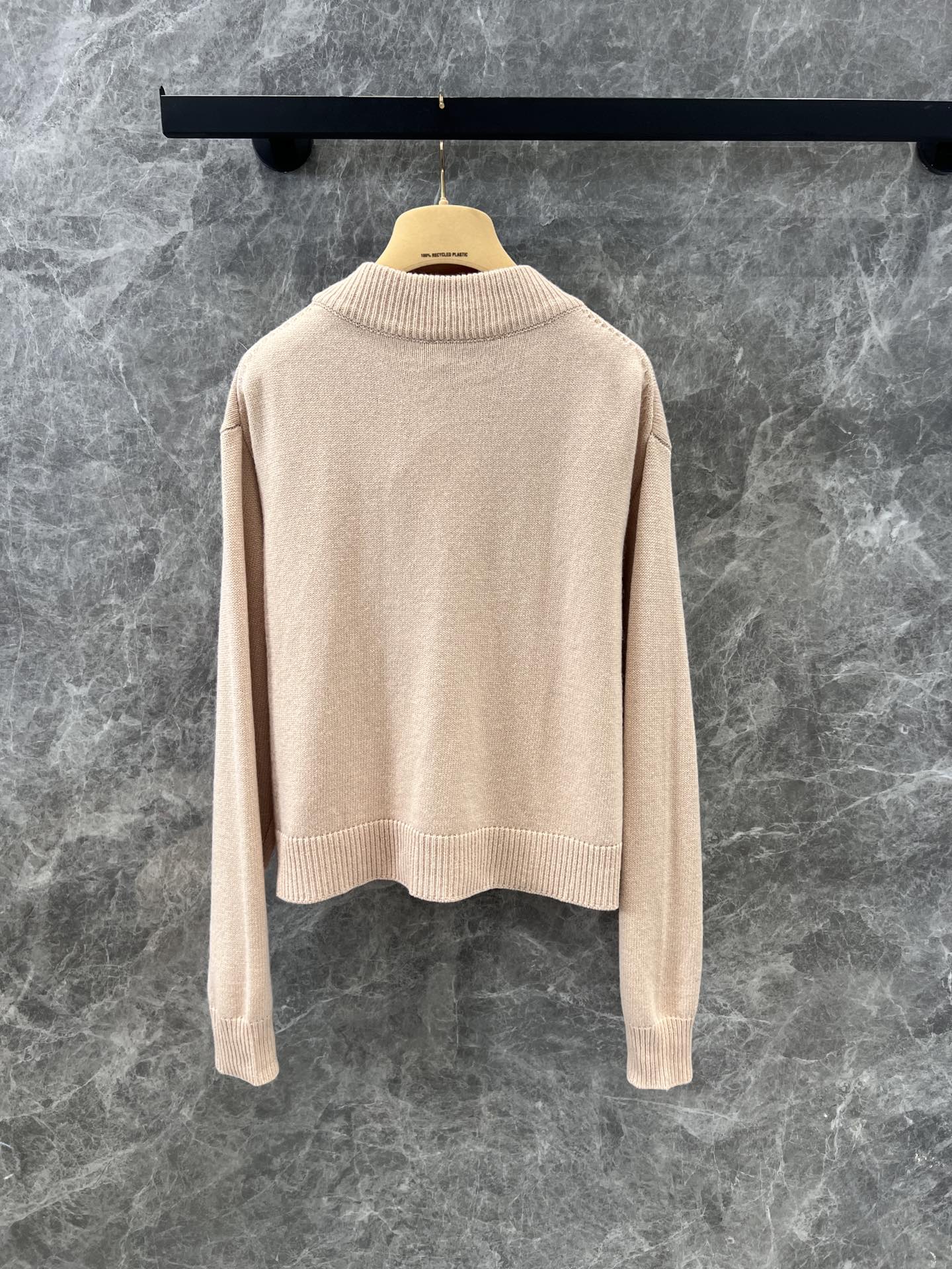 MIU复古少女系风格,V领设计开衫精致大方的款式,手工珠钻MIU字母logo设计,小重工又不繁琐,尽显优雅少女时髦感,面料是100%山羊绒,经过特殊处理,上身一点都不会扎 很奶糯的感觉!