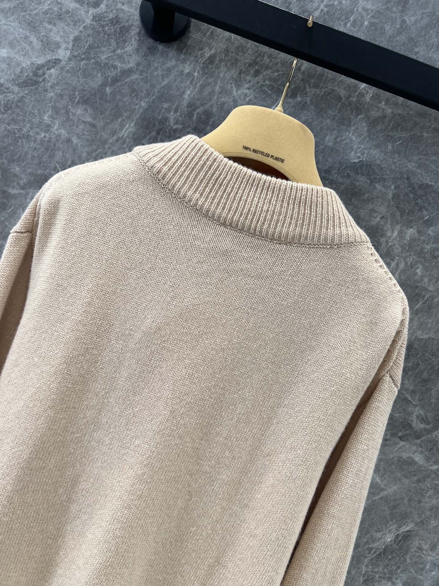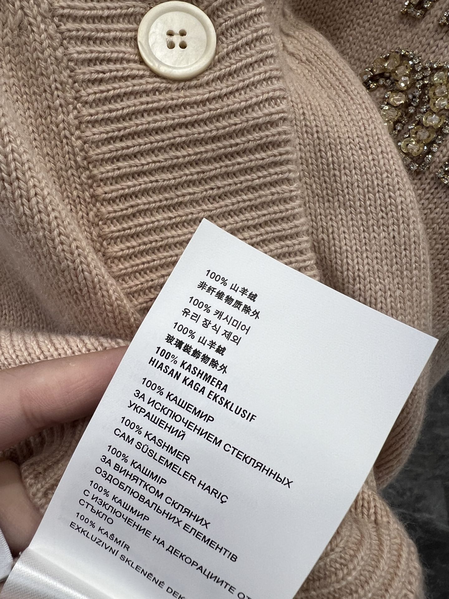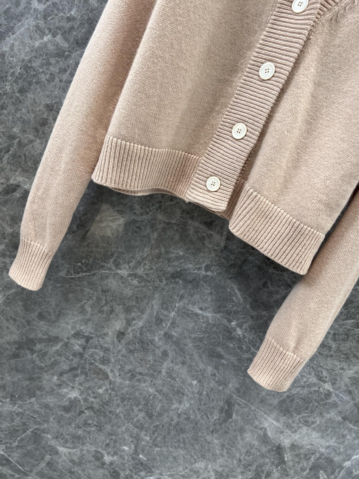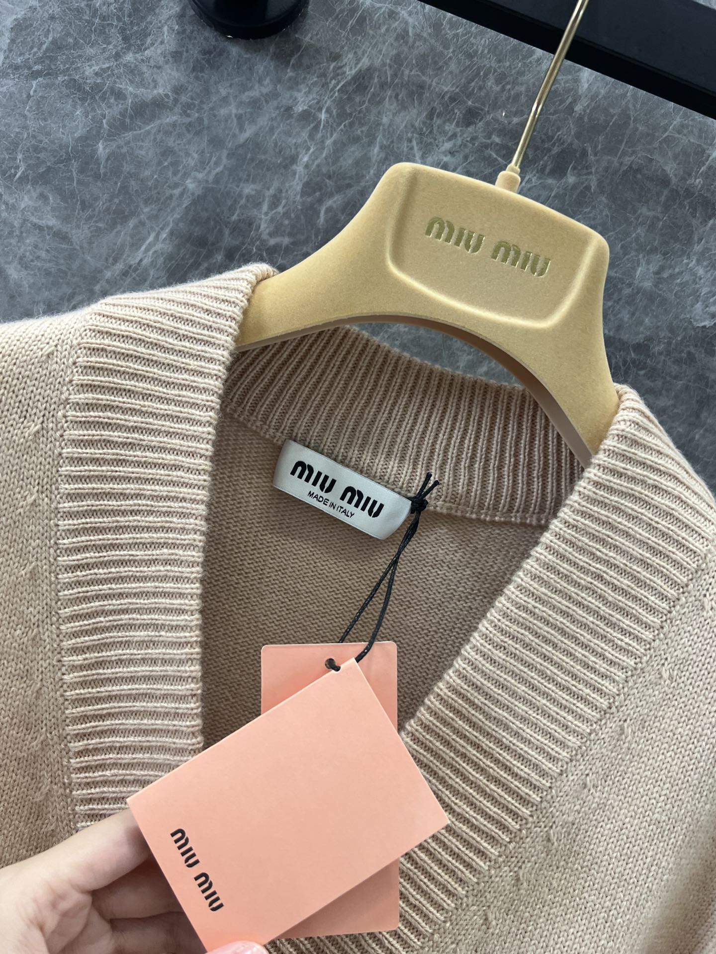 MIU复古少女系风格,V领设计开衫精致大方的款式,手工珠钻MIU字母logo设计,小重工又不繁琐,尽显优雅少女时髦感,面料是100%山羊绒,经过特殊处理,上身一点都不会扎 很奶糯的感觉!