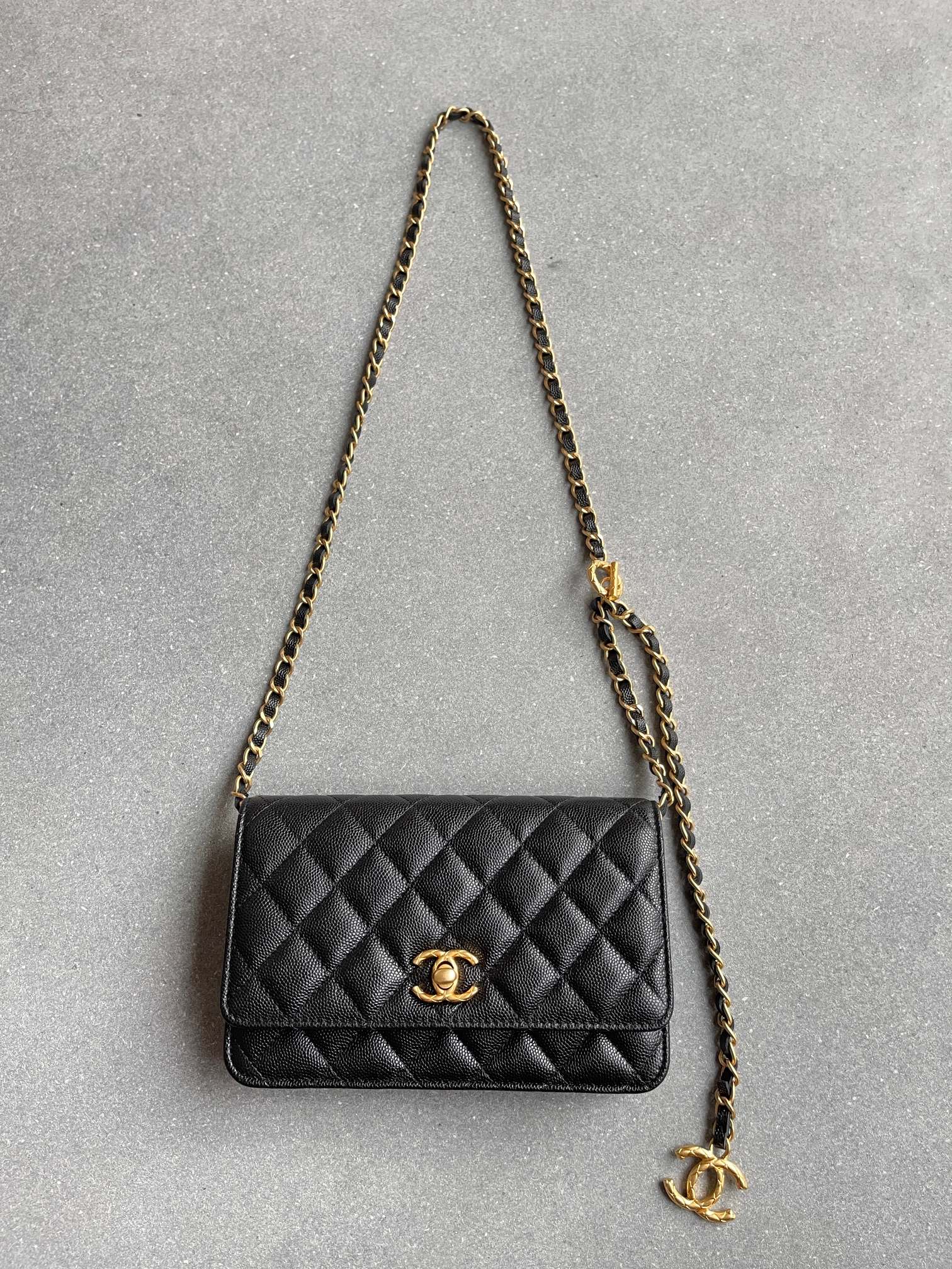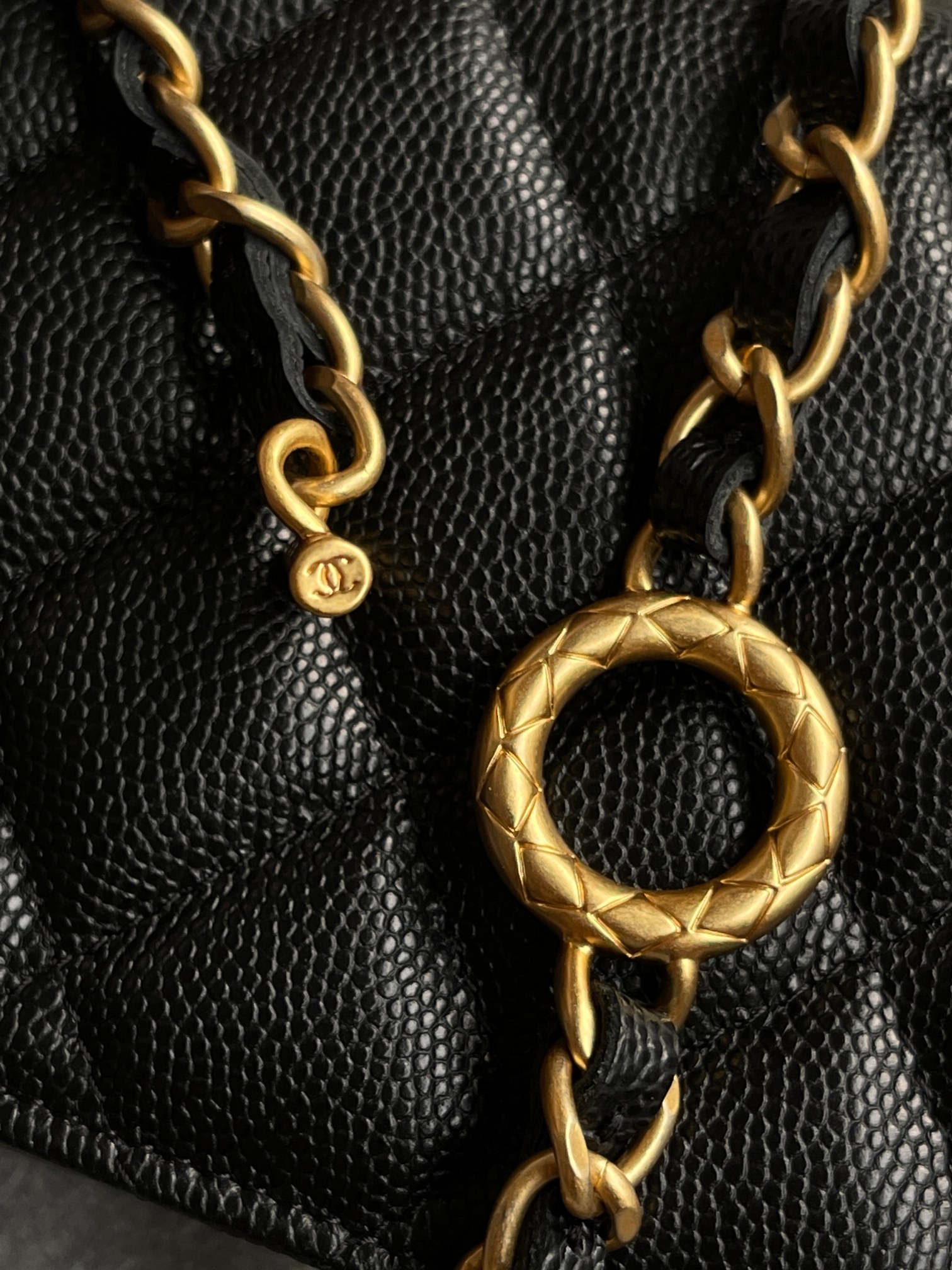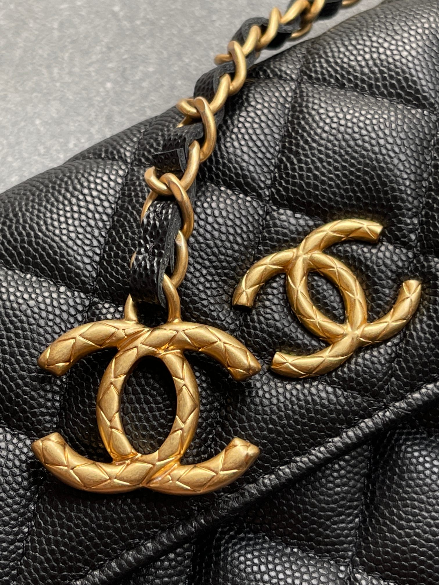 链条长短可调,很实用。有菱格纹的双C五金吊坠非常出彩!