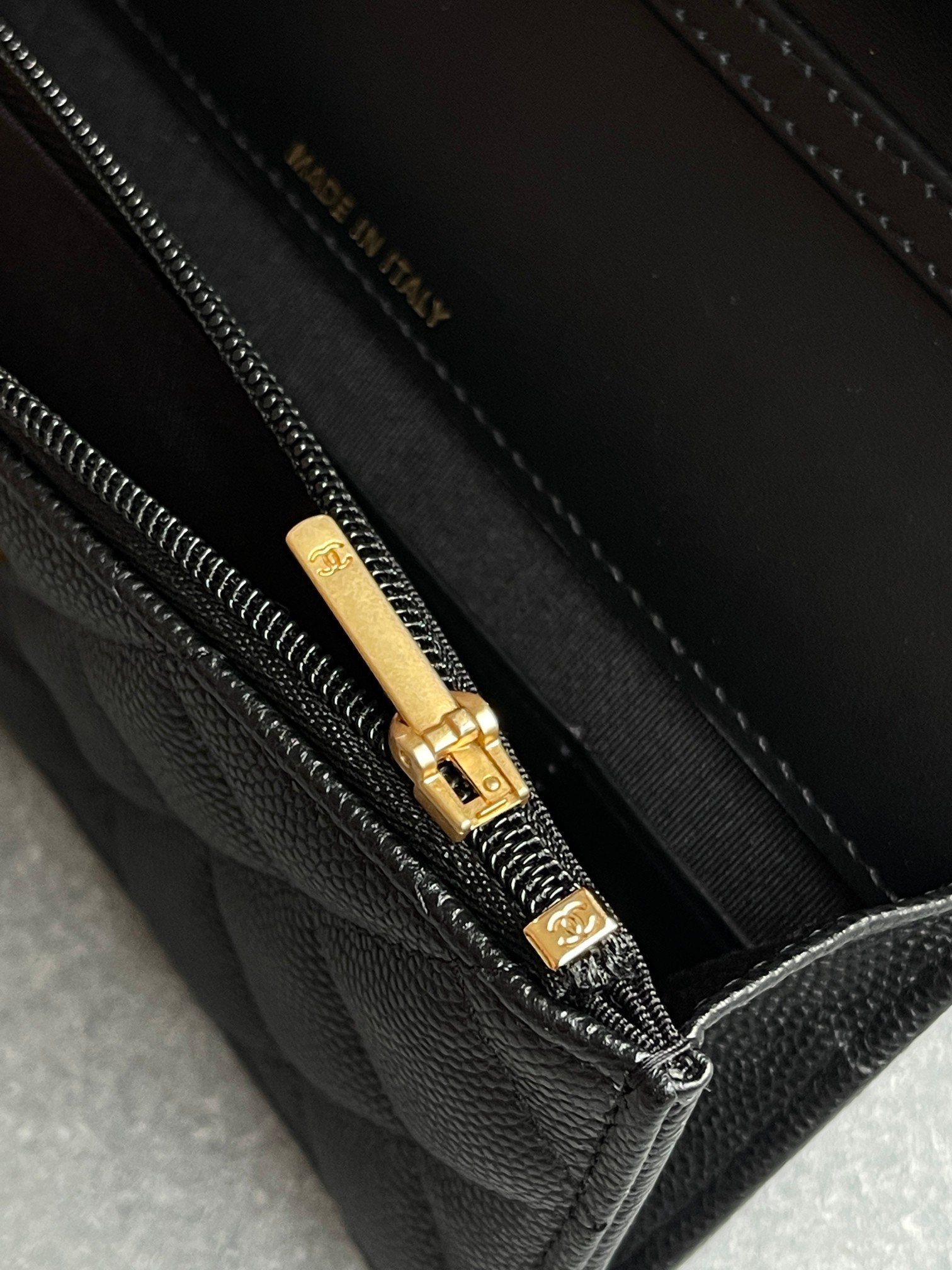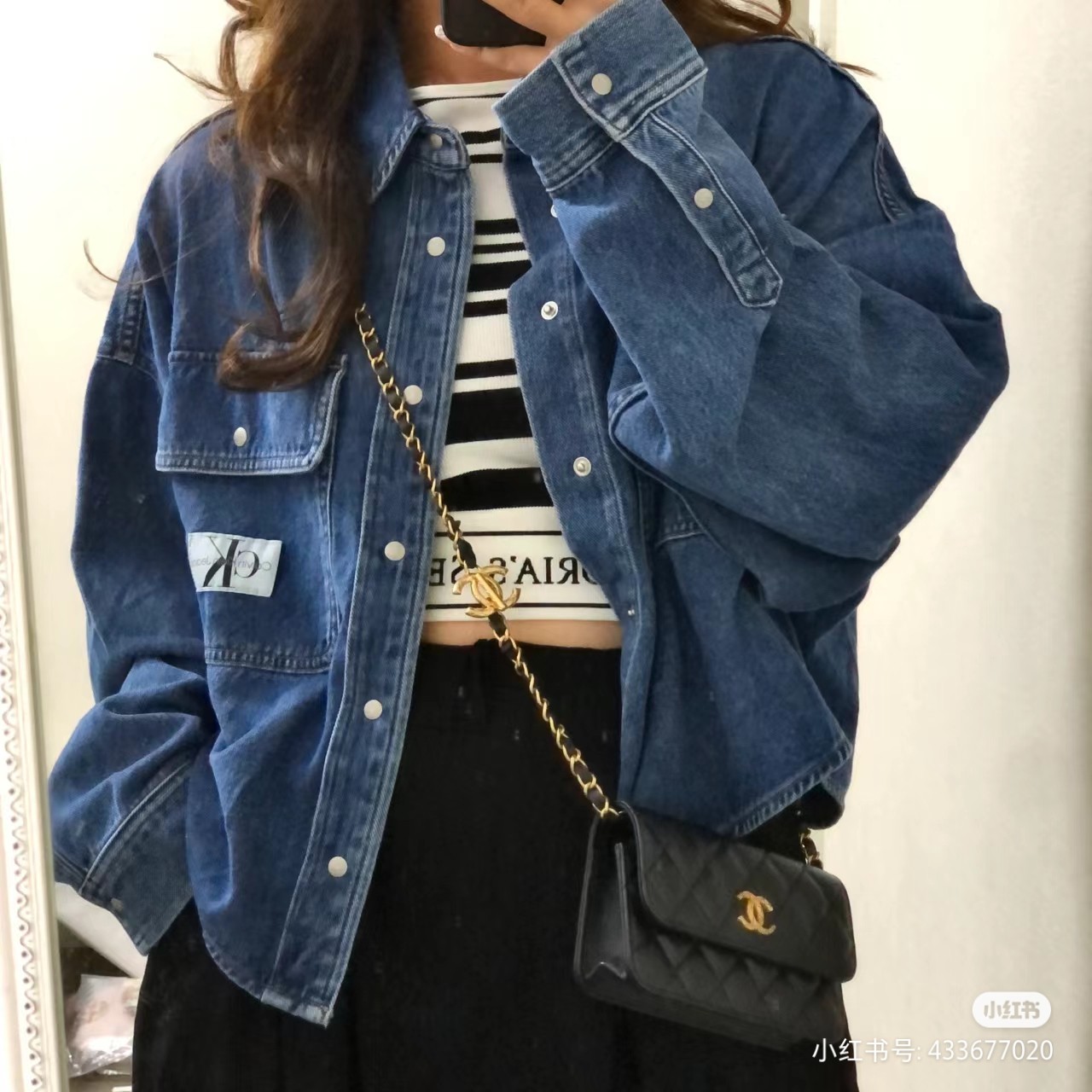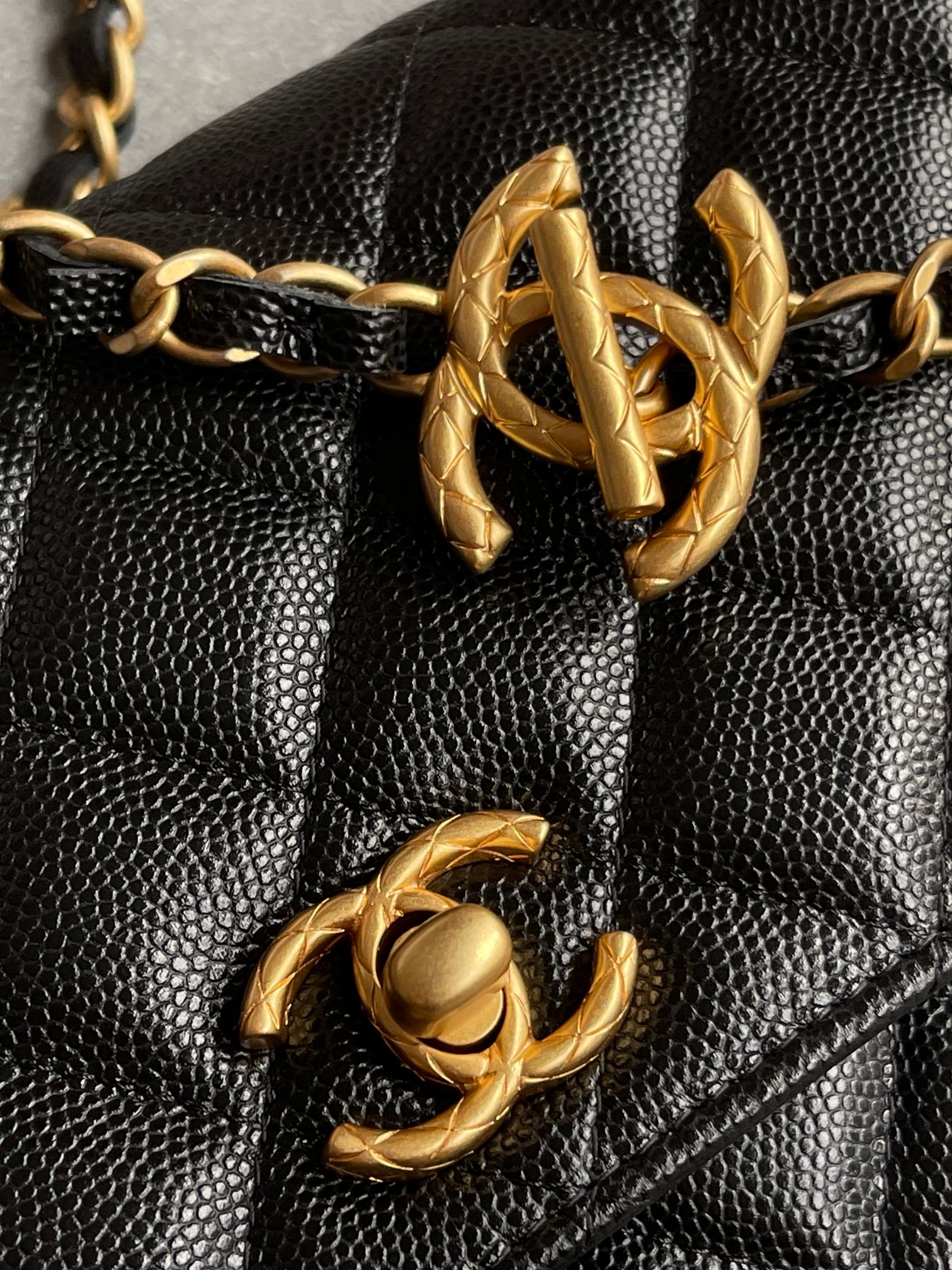 链条长短可调,很实用。有菱格纹的双C五金吊坠非常出彩!