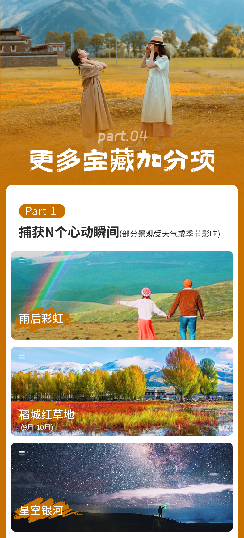 注:以上所有赠送项目若因客人自身原因或天气原因影响、景区政策性关闭导致无法进行,费用不退不换,敬请谅解。日照金山等景观受天气原因影响较大,如果没有看到不退费,也不接受此类投诉。