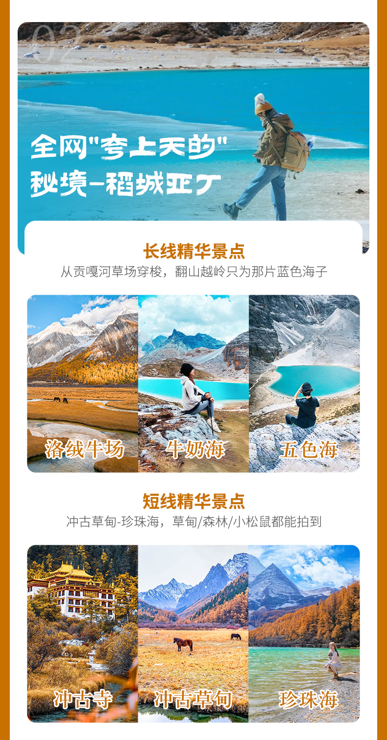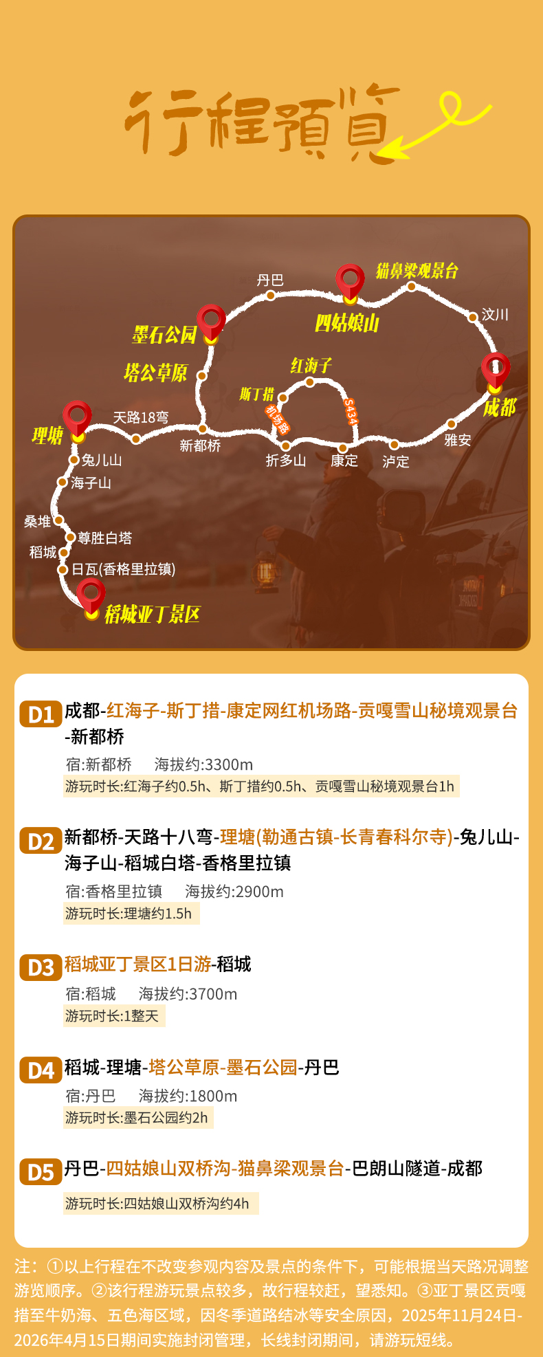 注:亚丁景区贡嘎措至牛奶海、五色海区域,因冬季道路结冰等安全原因,2025年11月24日—2026年4月15日期间实施封闭管理;长线封闭期间,请游玩短线,且景区门票价格调整为120元/人。