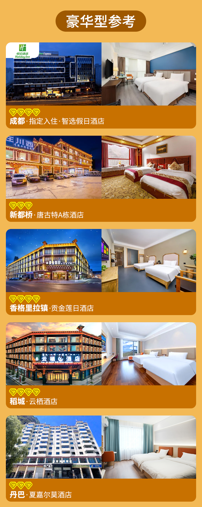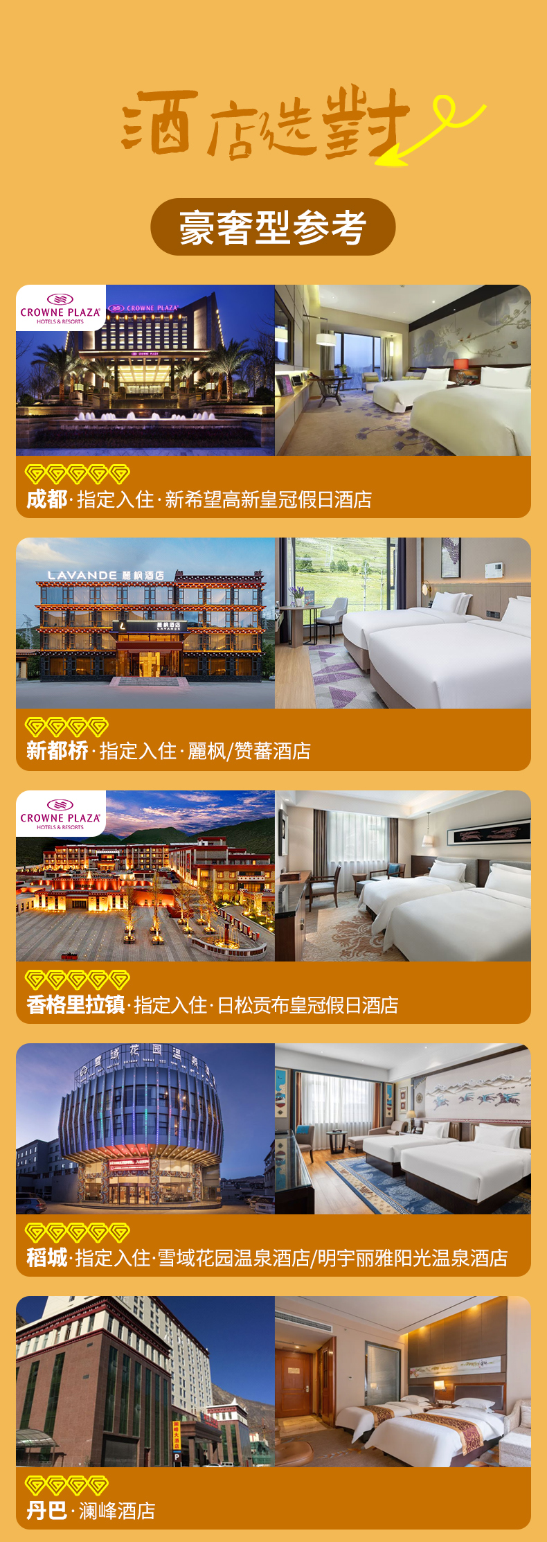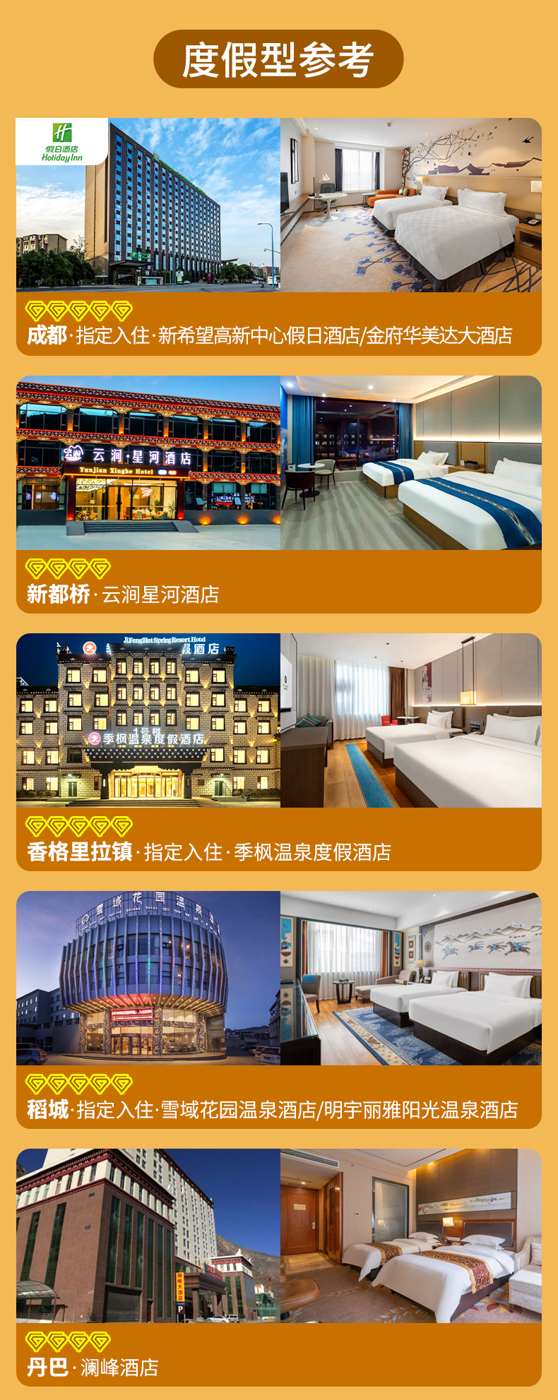 成都住宿:豪华型及以上套餐,所有出发团期均含成都住宿1晚,若不需要成都住宿可联系客服享优惠。