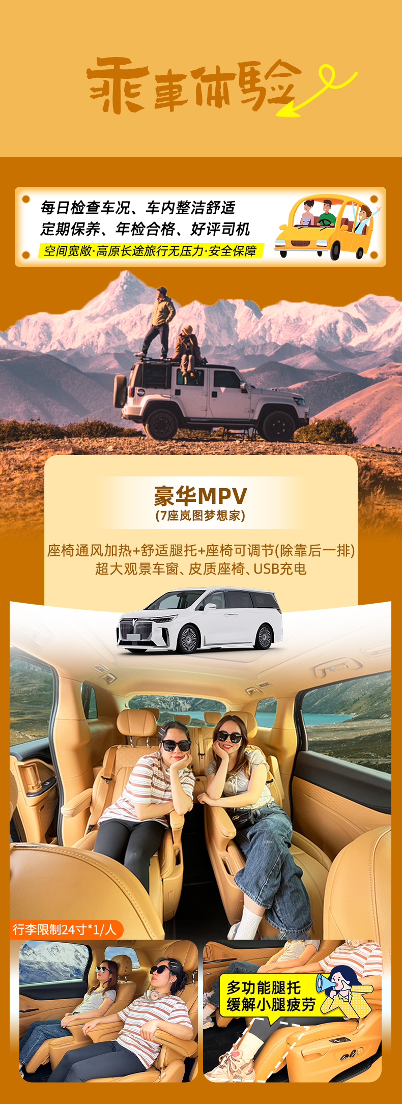 注:车型不支持指定,根据人数调派车型,保证一人一正座(行车座位须每天轮流换座,不指定安排座位,如您有特殊需求,可在团上自行协调,敬请谅解)。