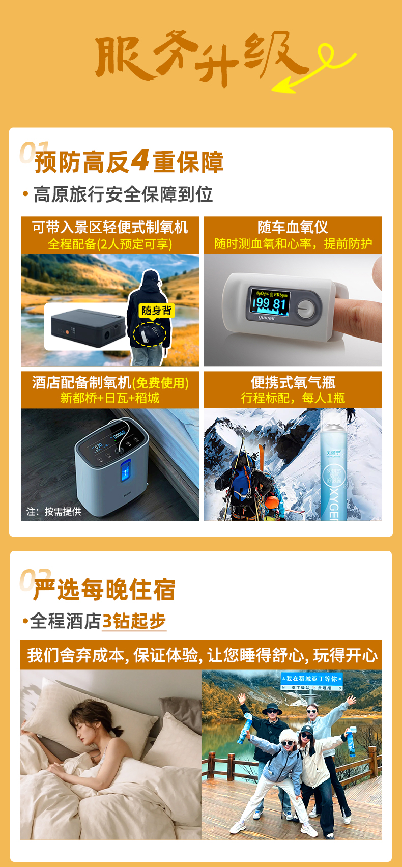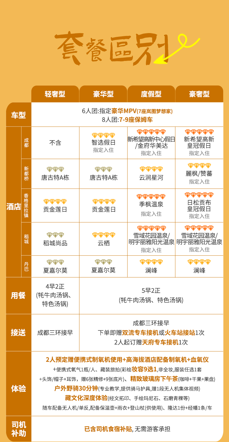 赠 1人起赠1次双流专车接机/接站或2人起赠1次天府机场专车接机/接站(轻奢型套餐不含接机服务)出发日三环内接早、2人预定赠便携式制氧机使用+高海拔酒店配备制氧机(按需提供)+随车血氧仪+便携式氧气1瓶/人、藏装旅拍(彩绘妆容9选1,非全妆,服装任选1套+头饰/帽子+耳饰,赠精修6张+底片9张)+精致玻璃房下午茶(咖啡+干果+果盘)+户外野骑30分钟(专业教学+提供骑马护具,赠一段无人机集体视频)、随车配备无人机/单反(暑期/节假日期间为随车队配备)、配备保温壶+雨衣+登山杖使用、藏文化深度体验(经文拓印·手绘玛尼石·石磨青稞等)、隆达1份+经幡1条/车