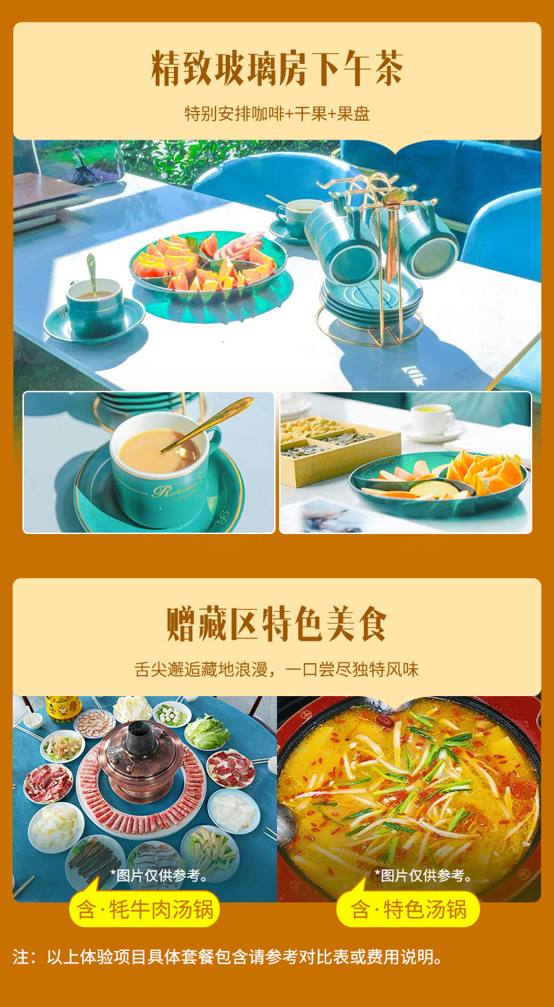 5早(轻奢型为4早),赠送2个特色餐:牦牛肉汤锅、特色汤锅。