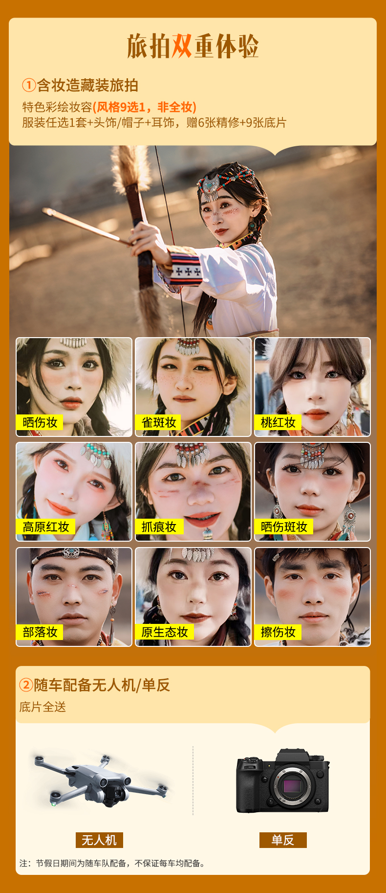 注:旺季/节假日期间,单反/无人机为随车队配备,随机安排,不保证每车均配备,敬请谅解!