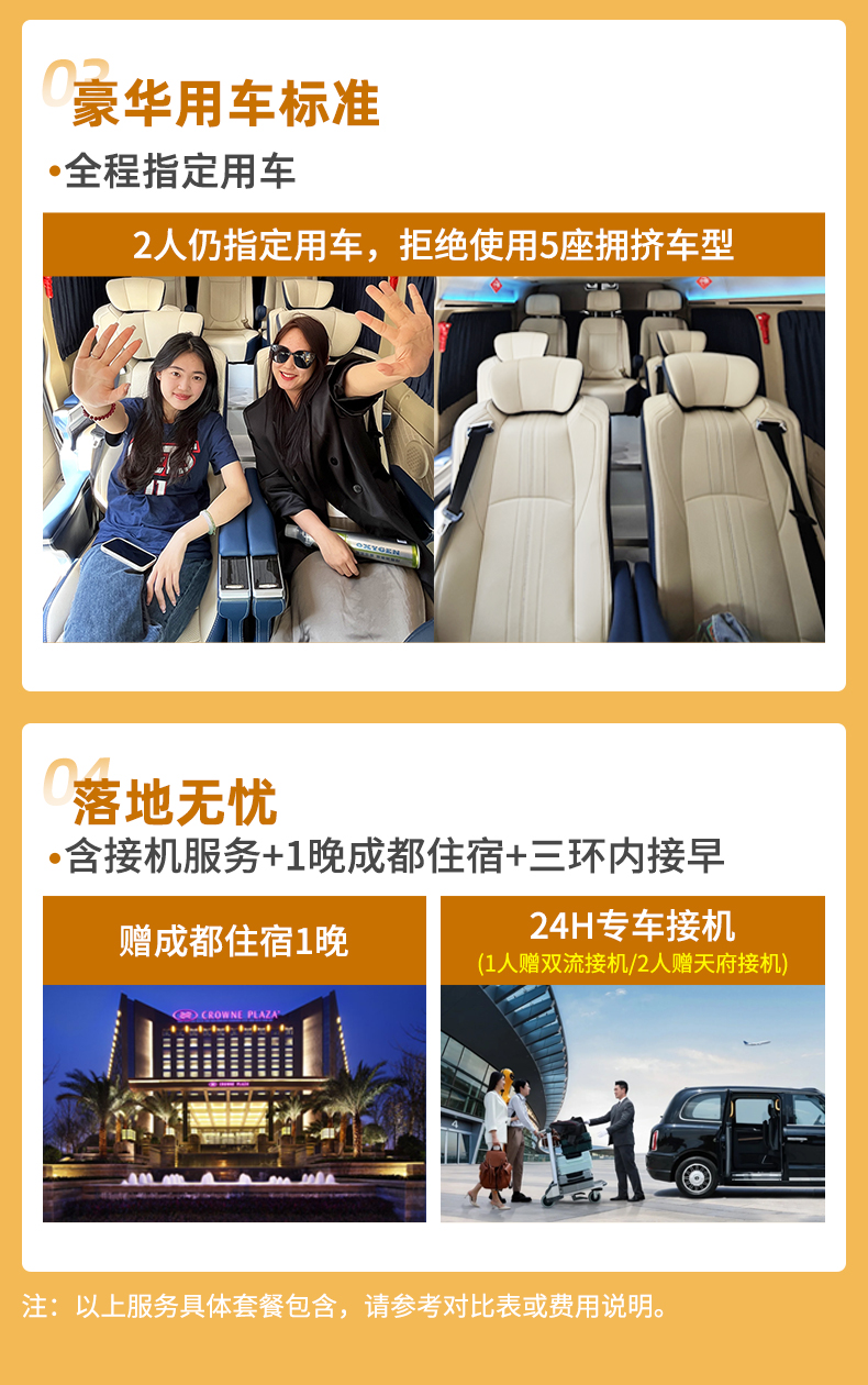 注:豪华型/度假型/豪奢型的游客,成都住宿默认安排出发前一天晚上住宿,若有特殊需求请提前告知客服或下单备注,不接受临时更改;逾期未使用不做退费。