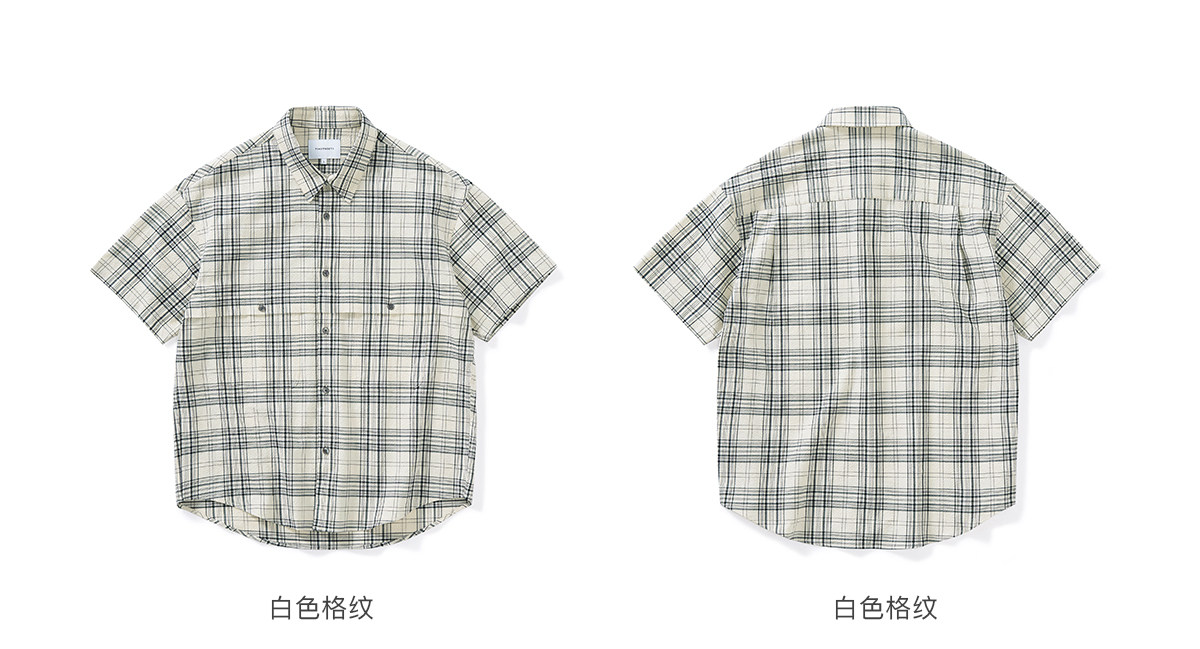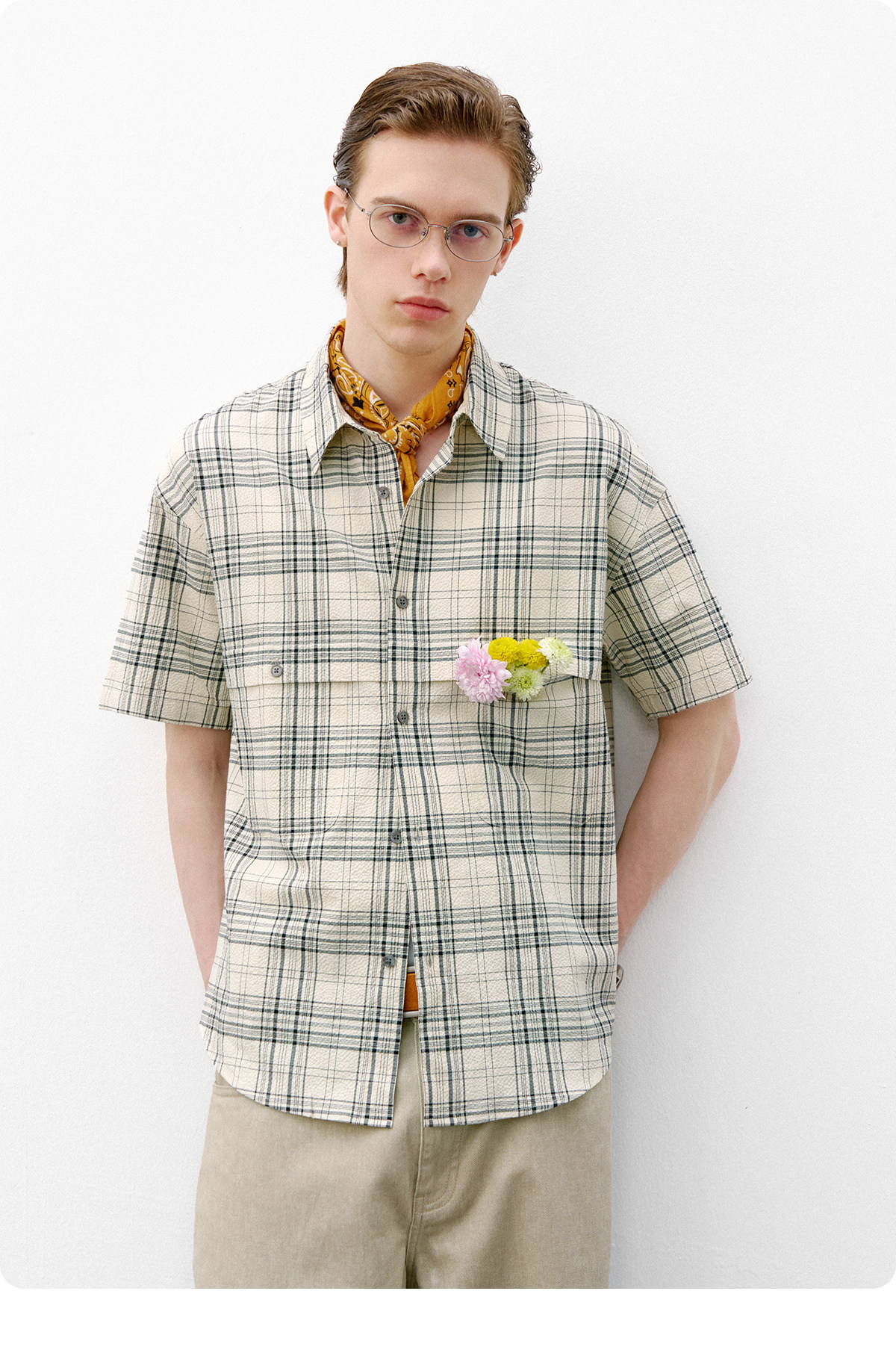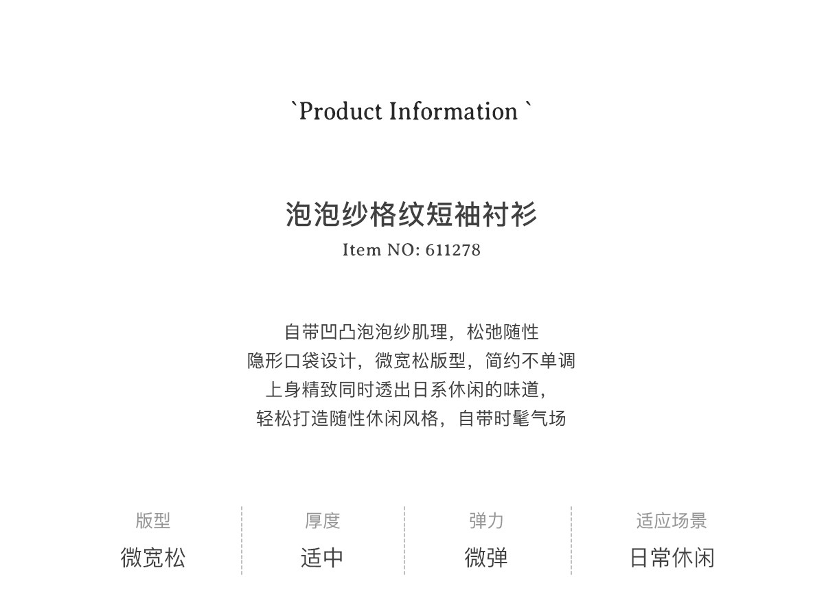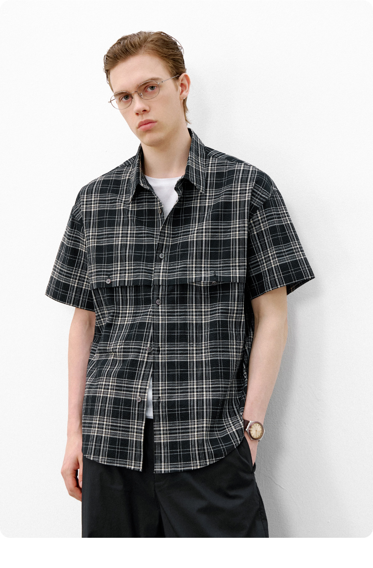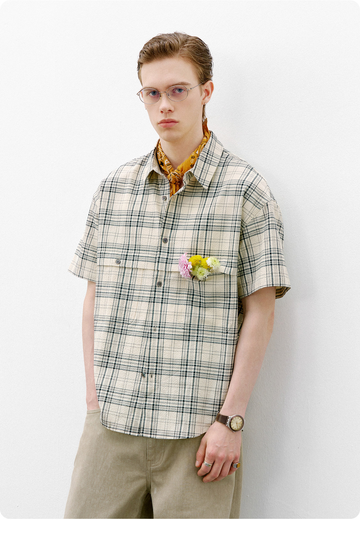 714street夏季新款日系休闲高级感凹凸微皱肌理格子短袖衬衫男款