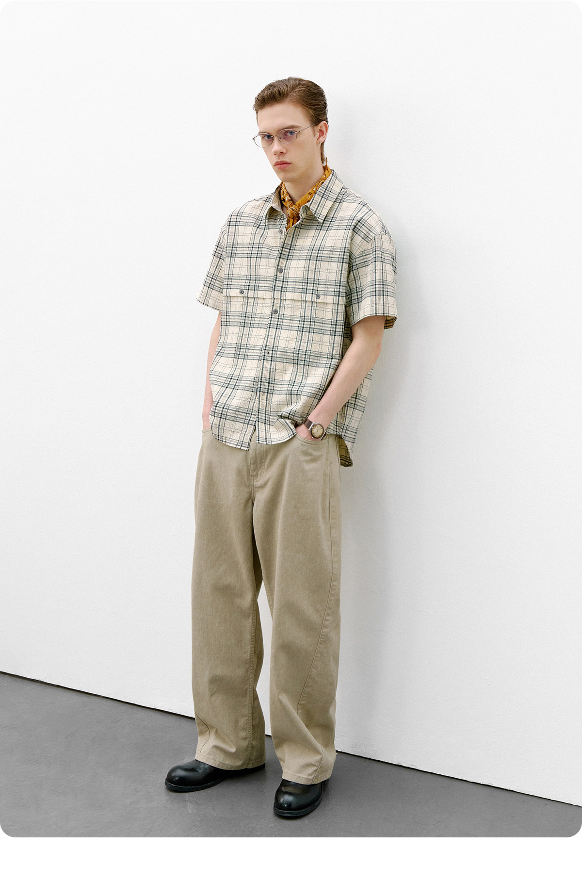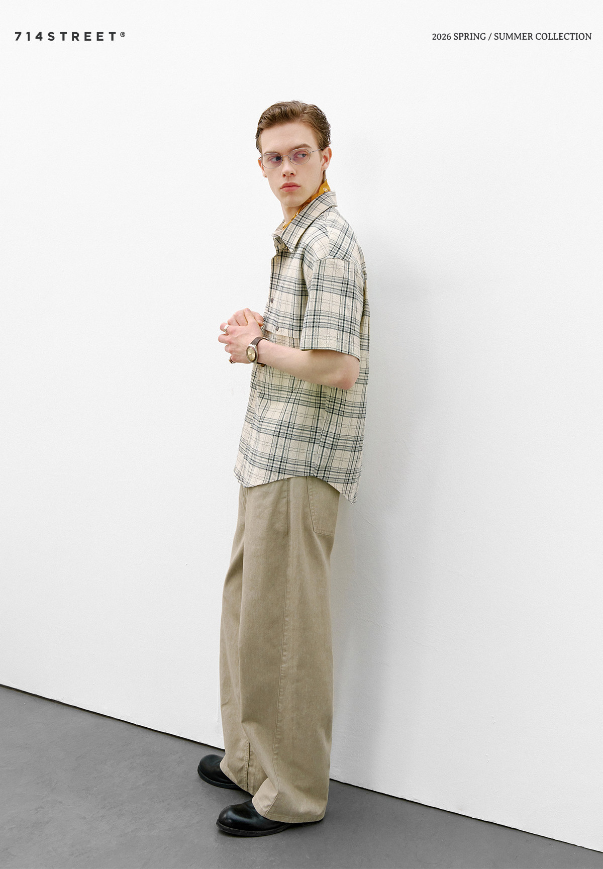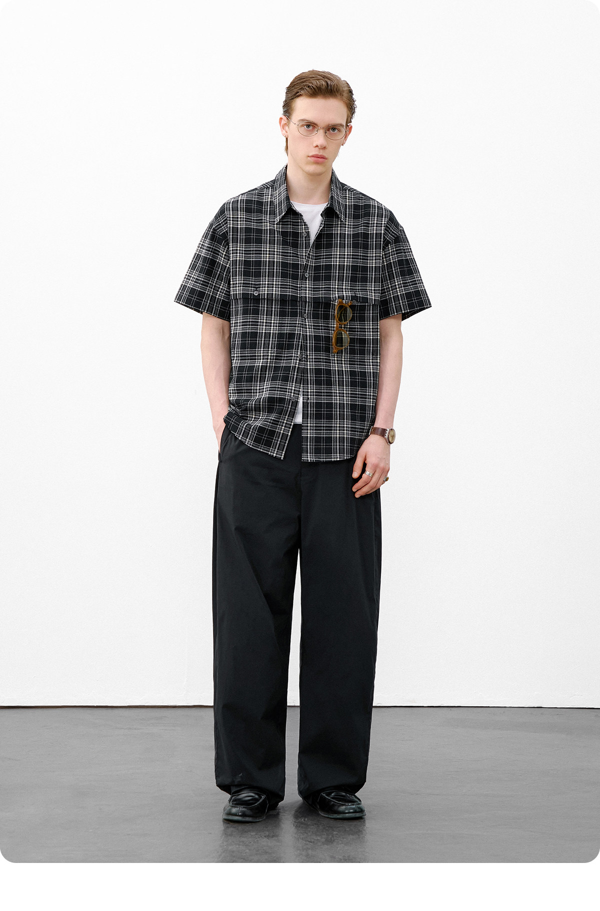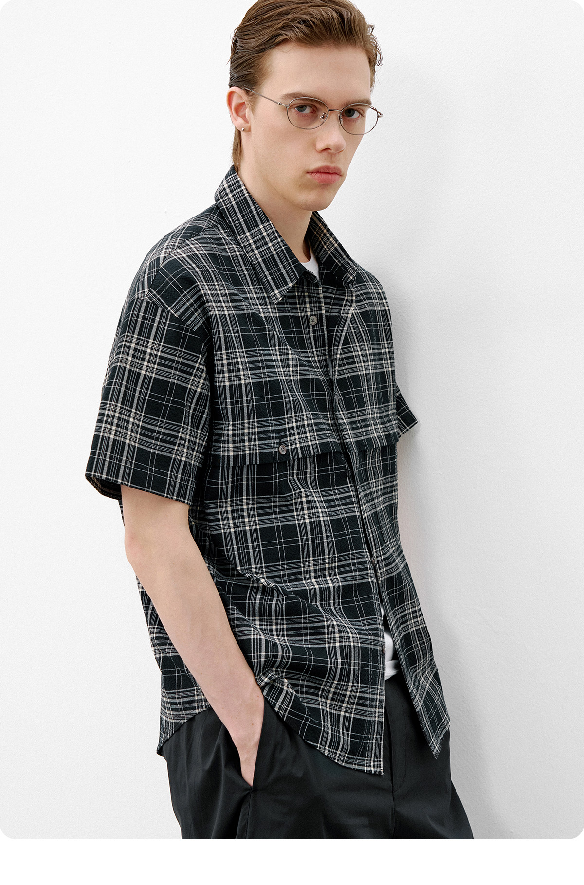 714street夏季新款日系休闲高级感凹凸微皱肌理格子短袖衬衫男款