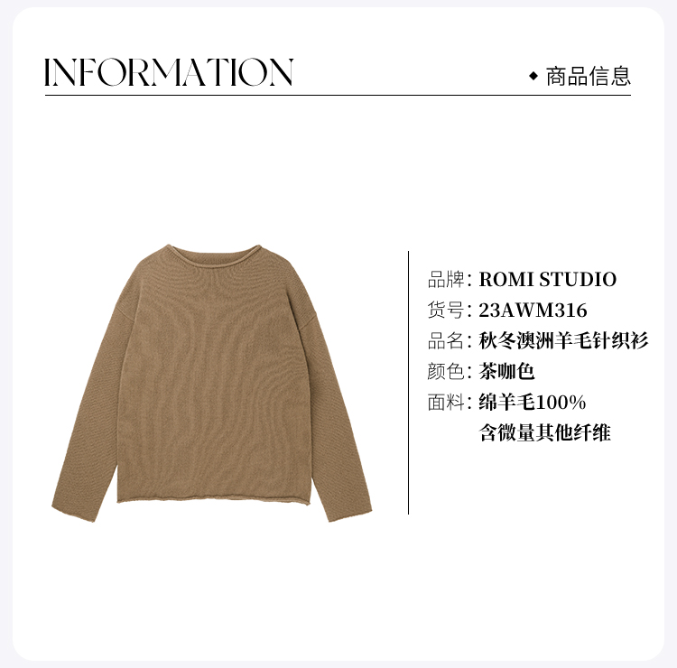 ROMI STUDIO“秋冬美拉德" 100%澳洲羊毛卷边圆领针织毛衣23AWM316