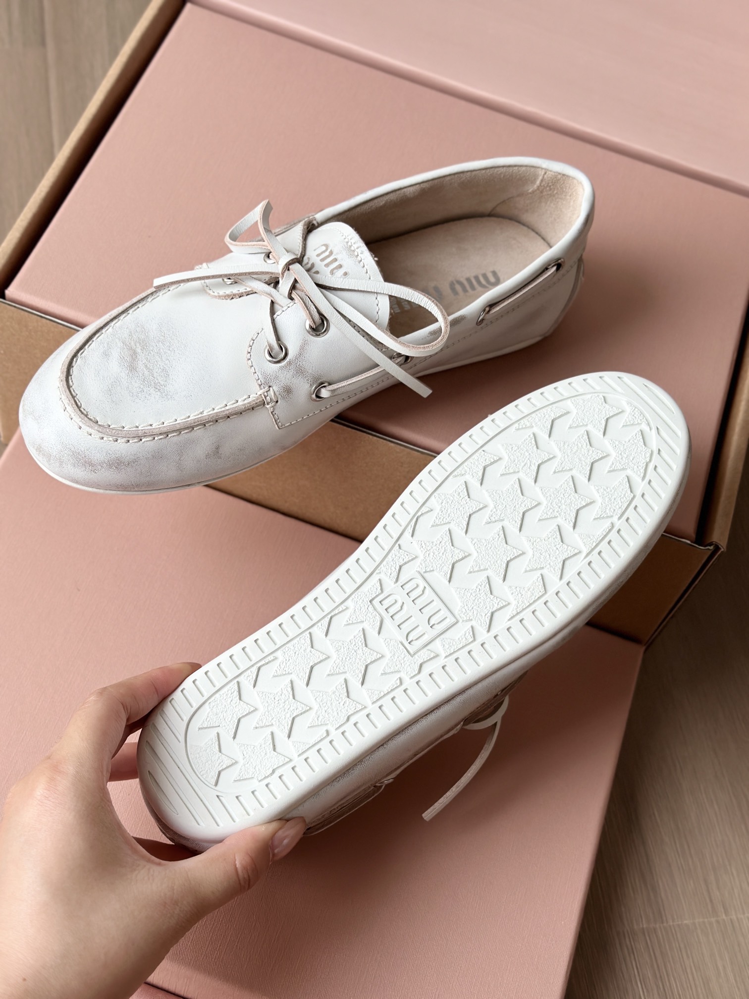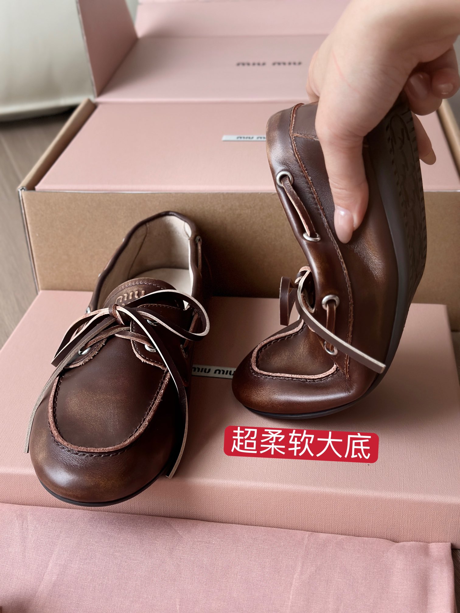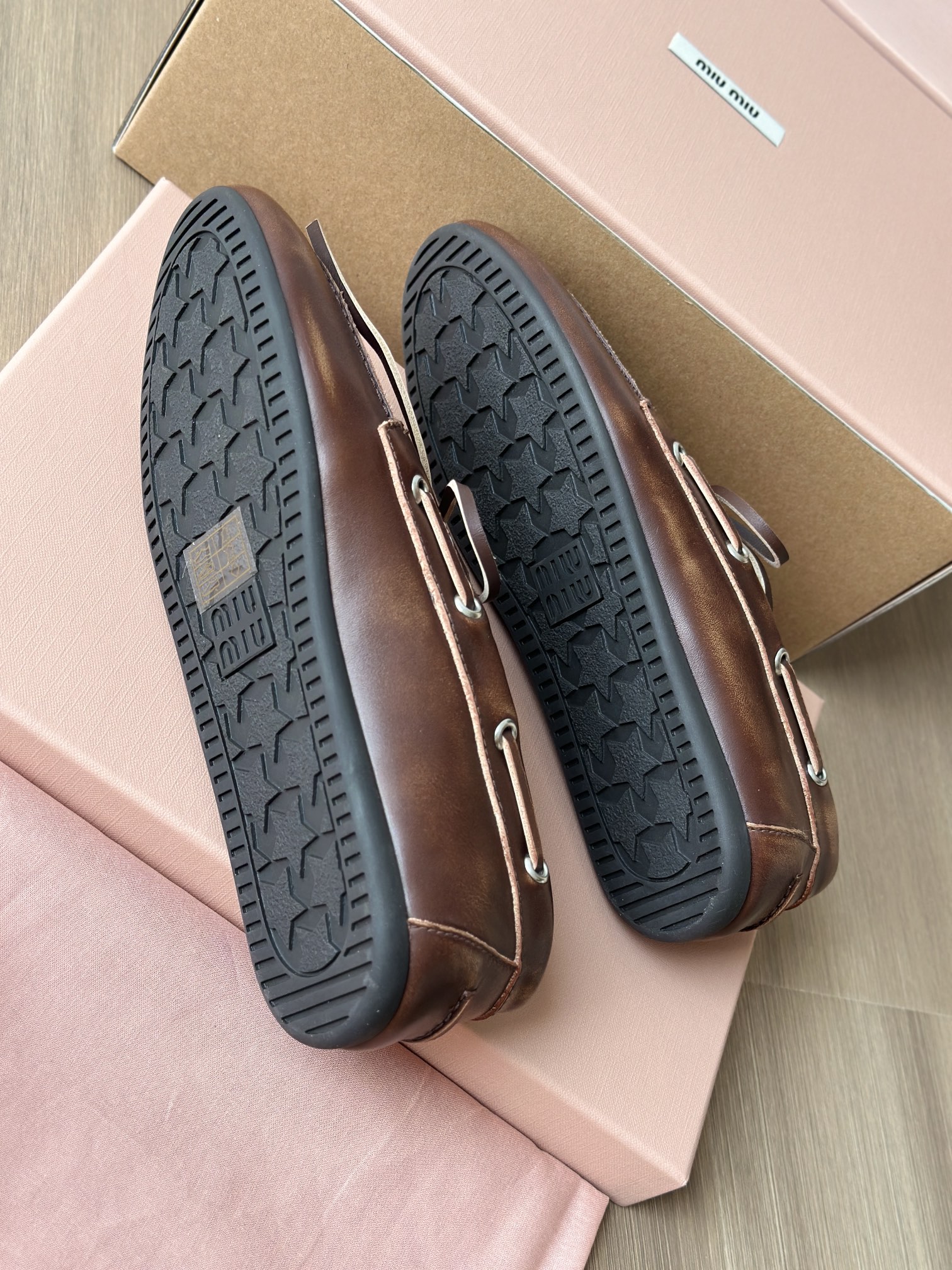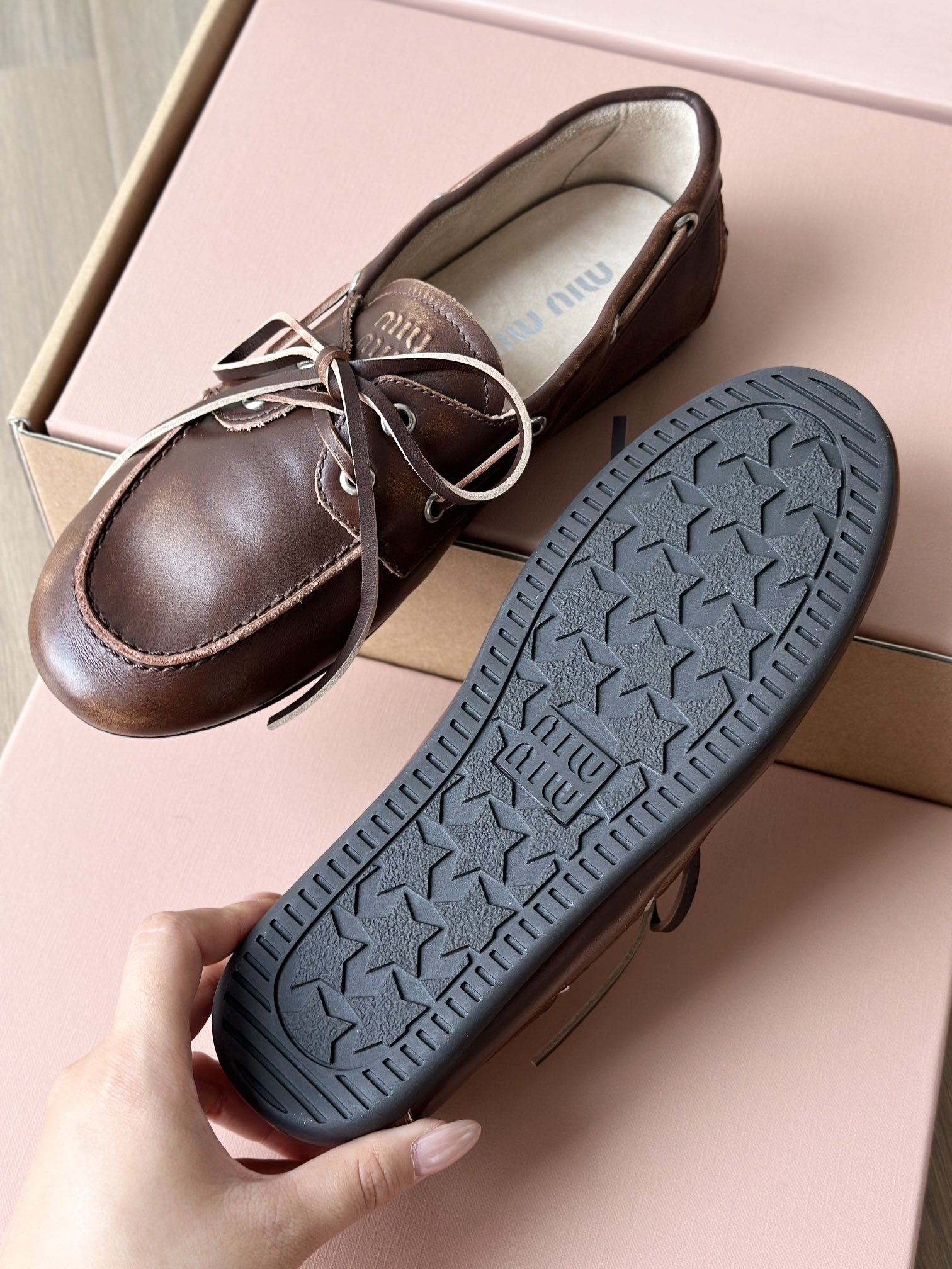 miu家标准的星星型橡胶磨具大底 耐磨防滑又耐穿,抓地感很强 而且鞋底非常软,可以轻松弯曲那种 穿上脚舒服又 轻便,轻松走路无压力 能脚随鞋走不板脚!日常暴走压力!❤️