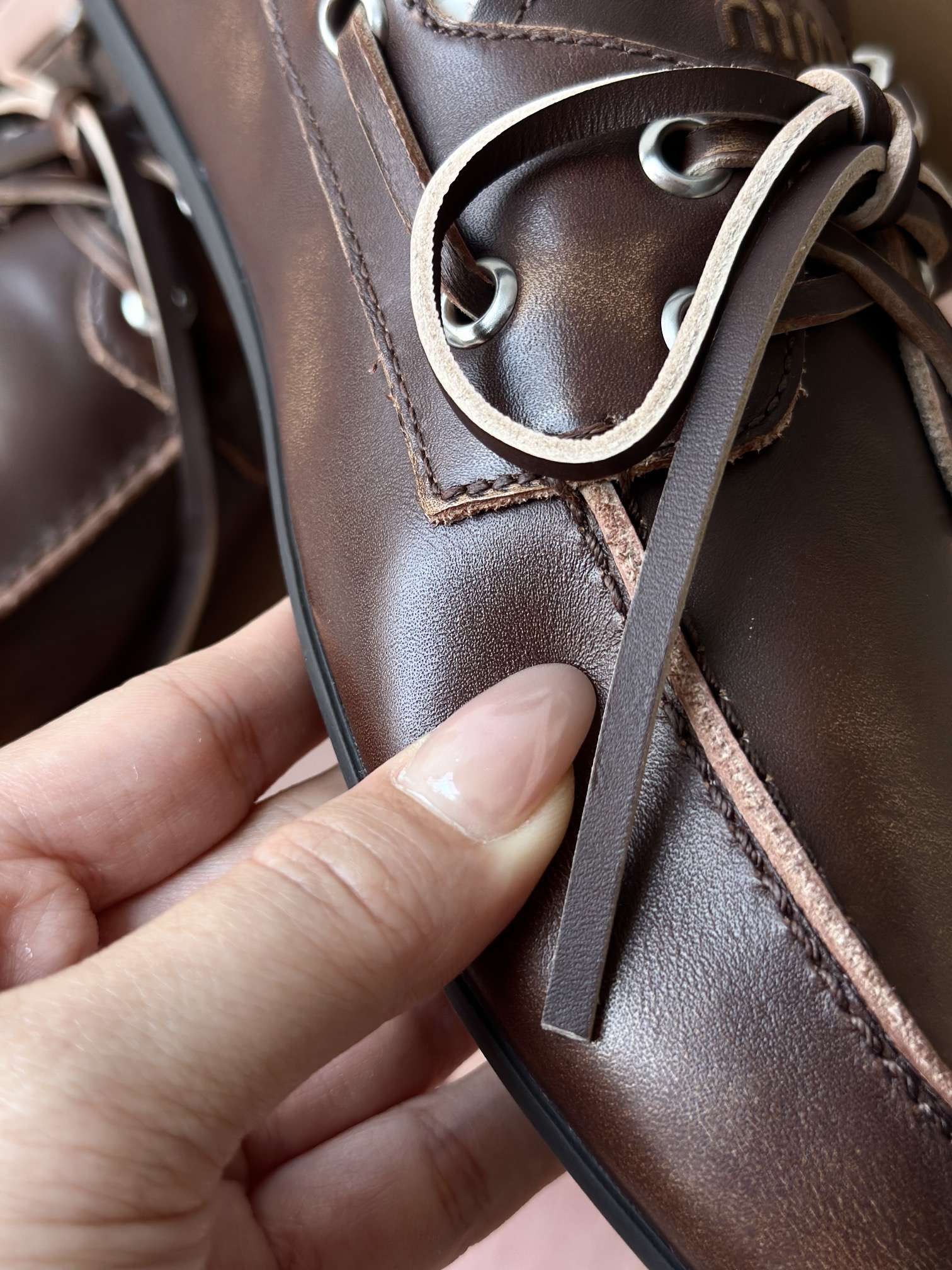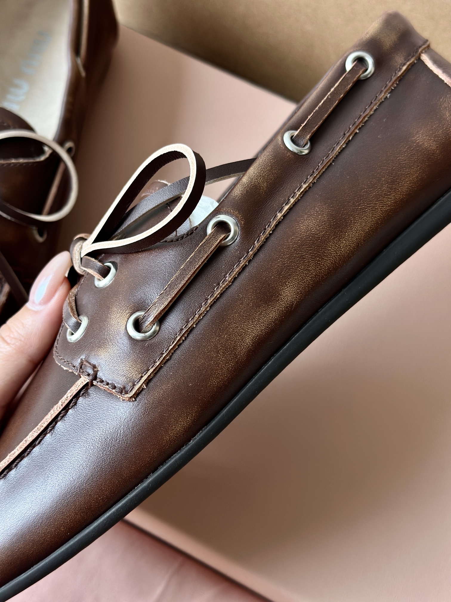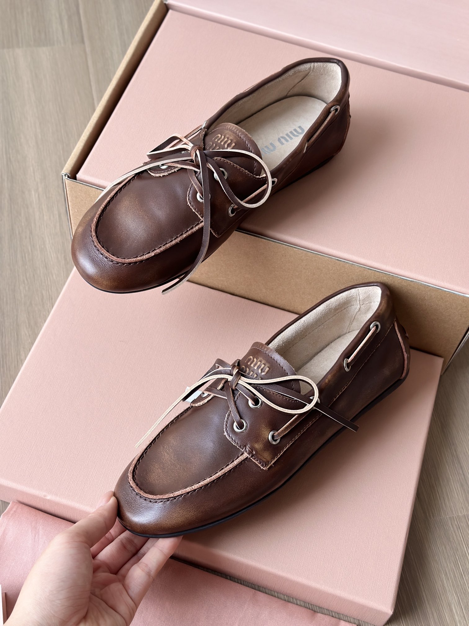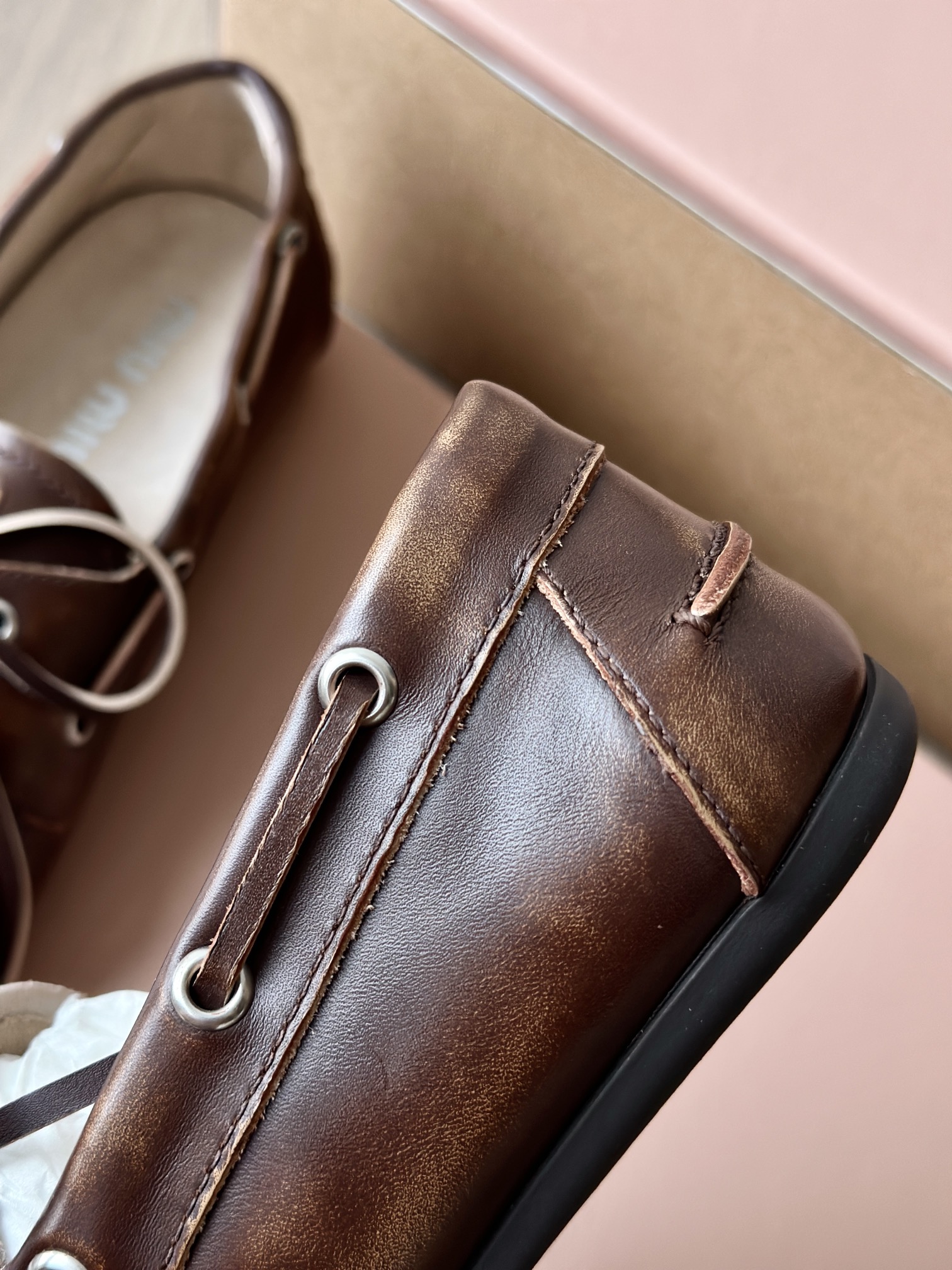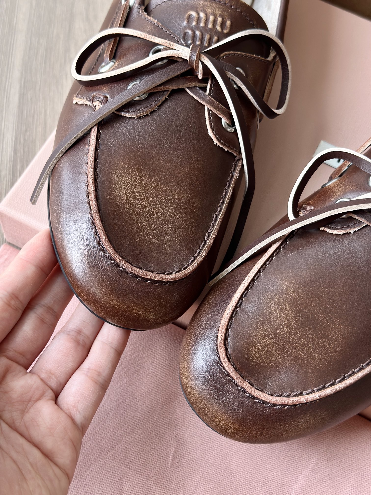 春夏这种复古范儿的小皮鞋少不了! 这不比个别硬邦邦的乐福鞋要舒服太多了呀! 依旧是复古擦色的工艺 在顶级胎牛皮上留下“岁月”的痕迹,miu拿捏复古范儿真是一把好手! 喜欢的朋友可以放心入!