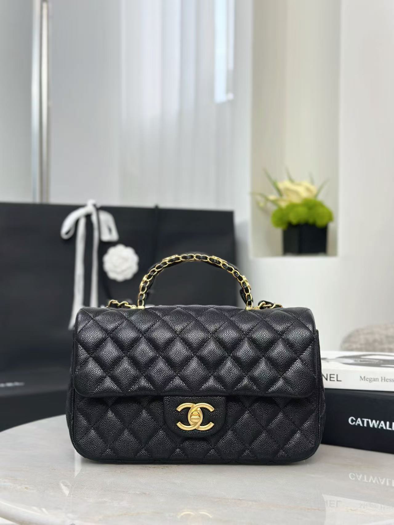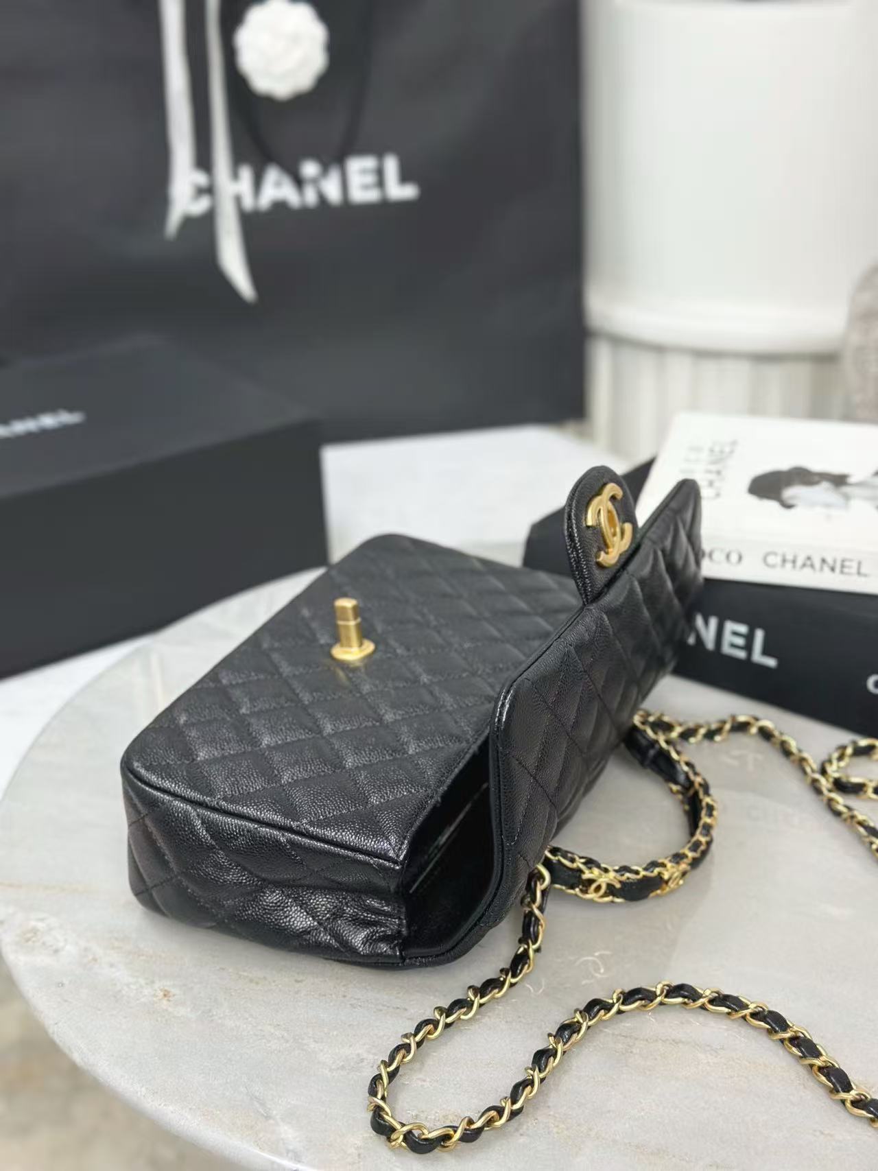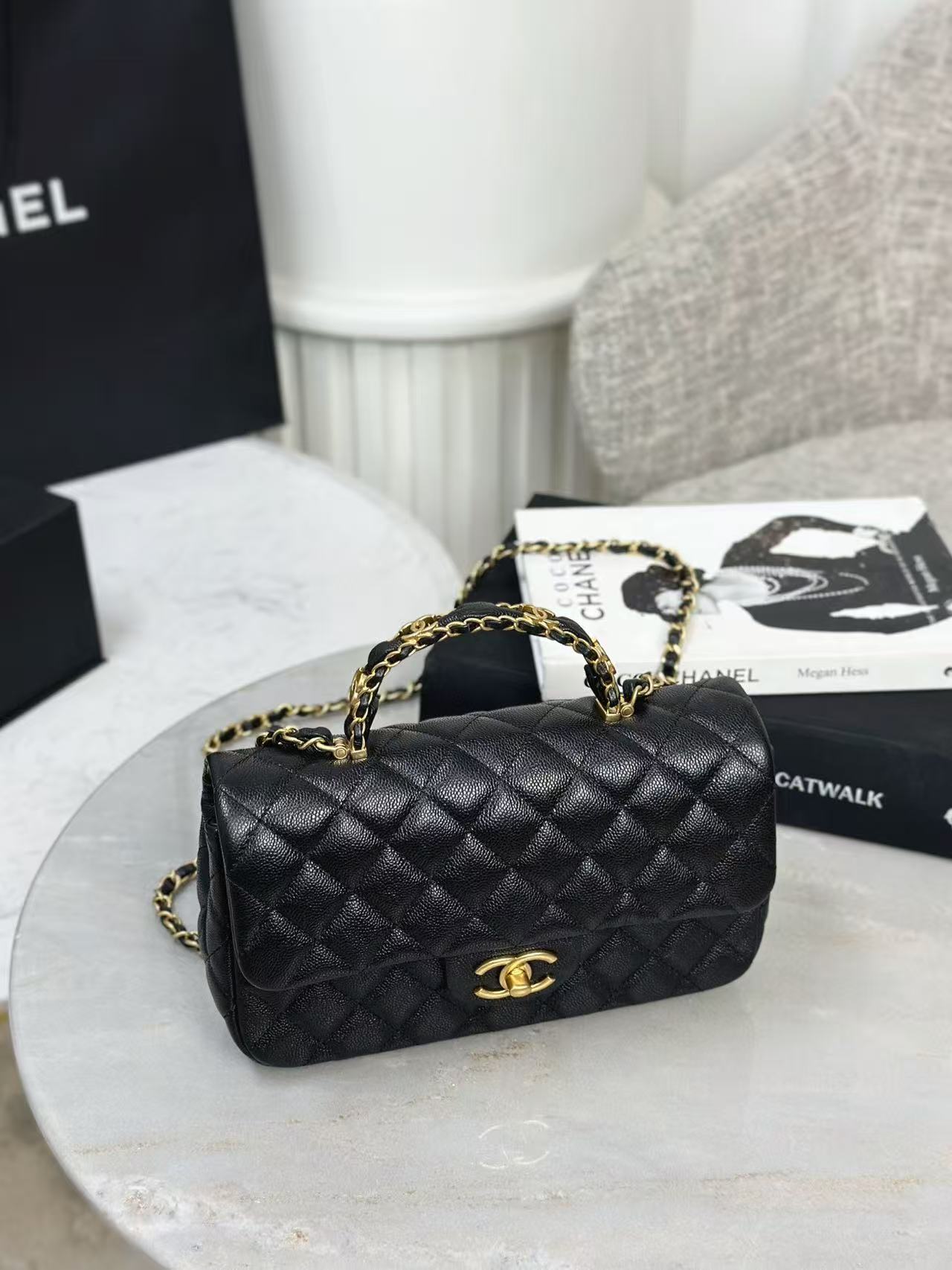 香奈儿 Classic Flap CF 手柄款 25B 双C Logo 菱格 金扣 皮穿链 牛皮 单肩斜挎手提包 (LZ*MM)