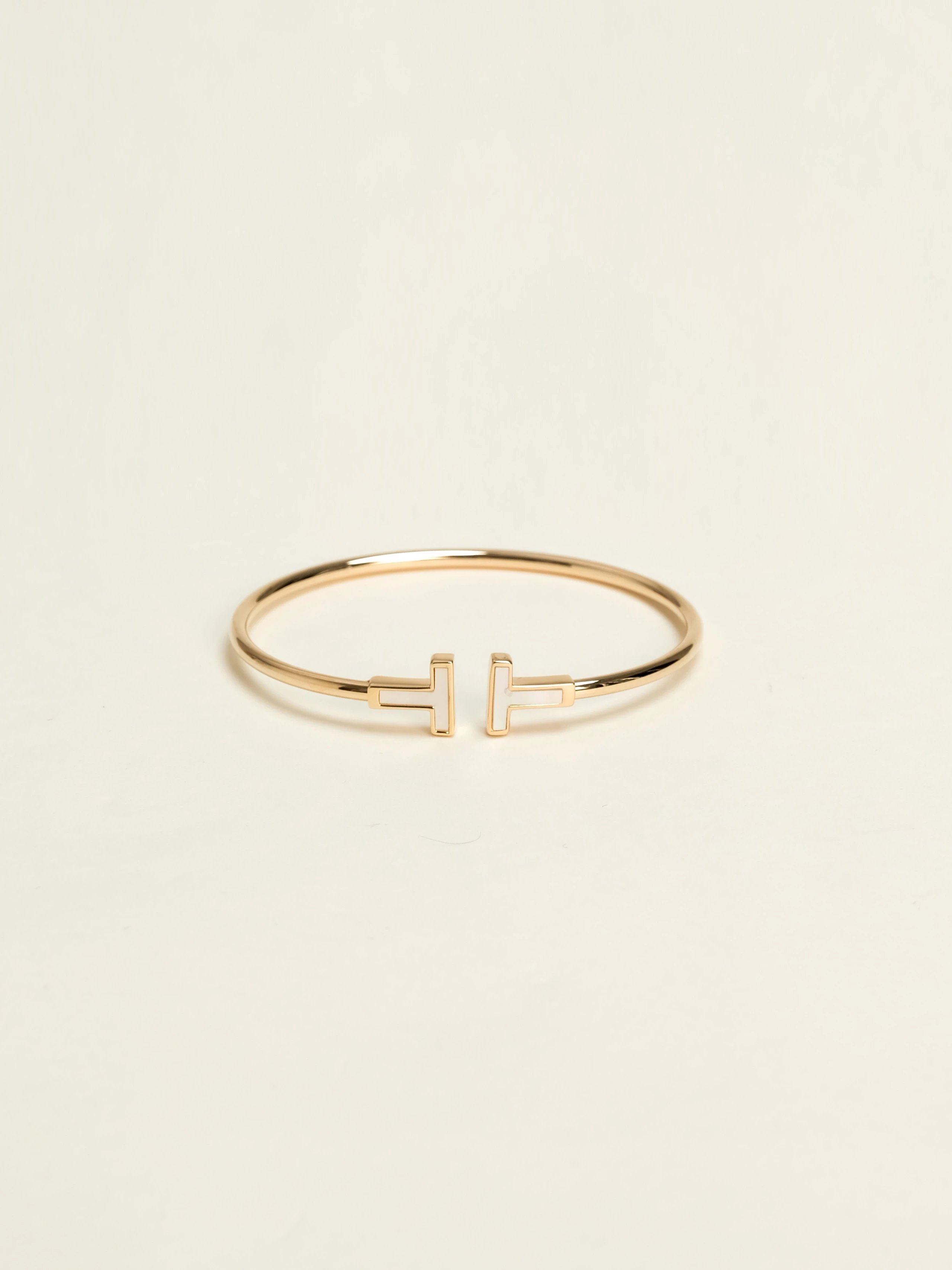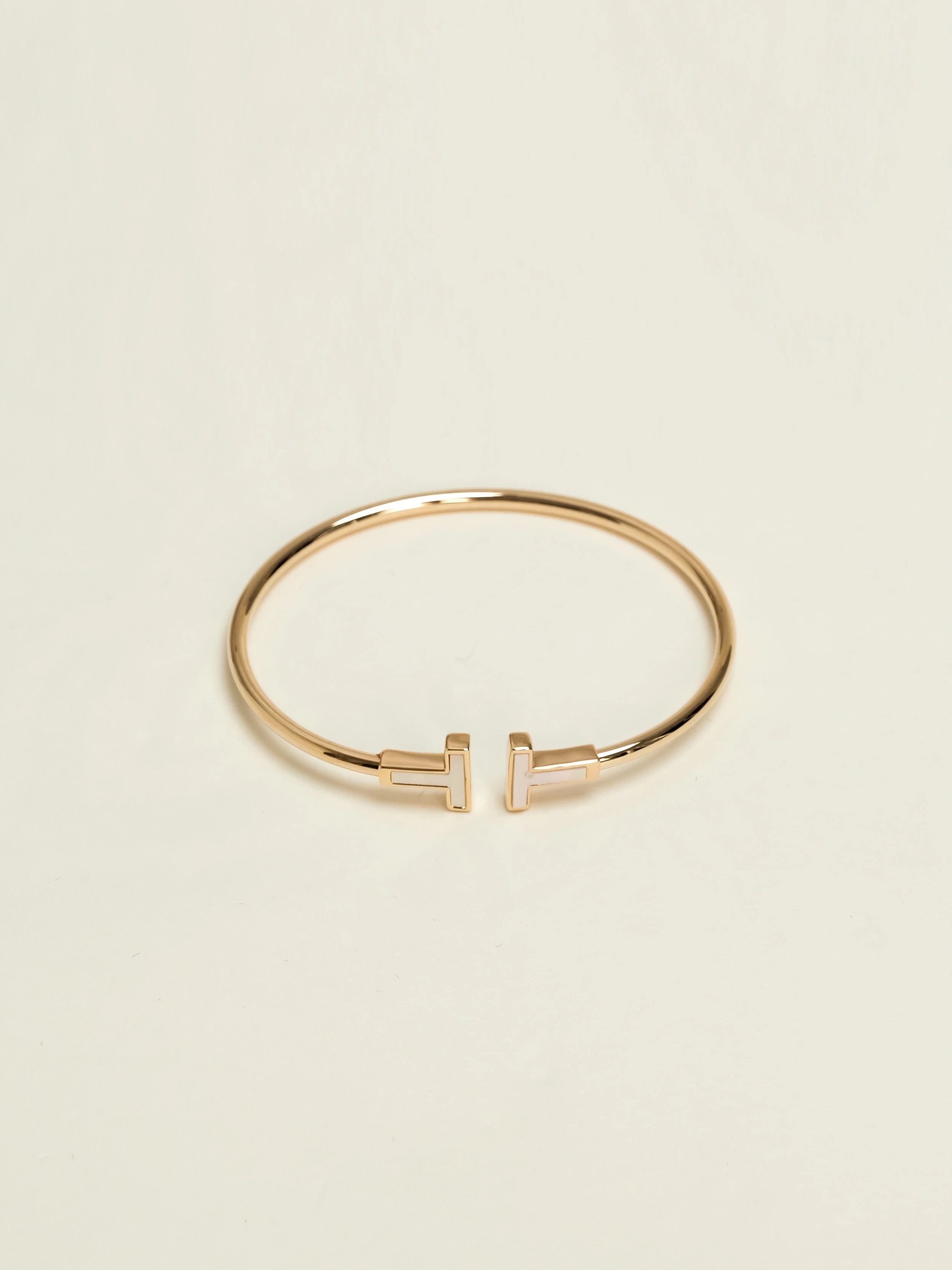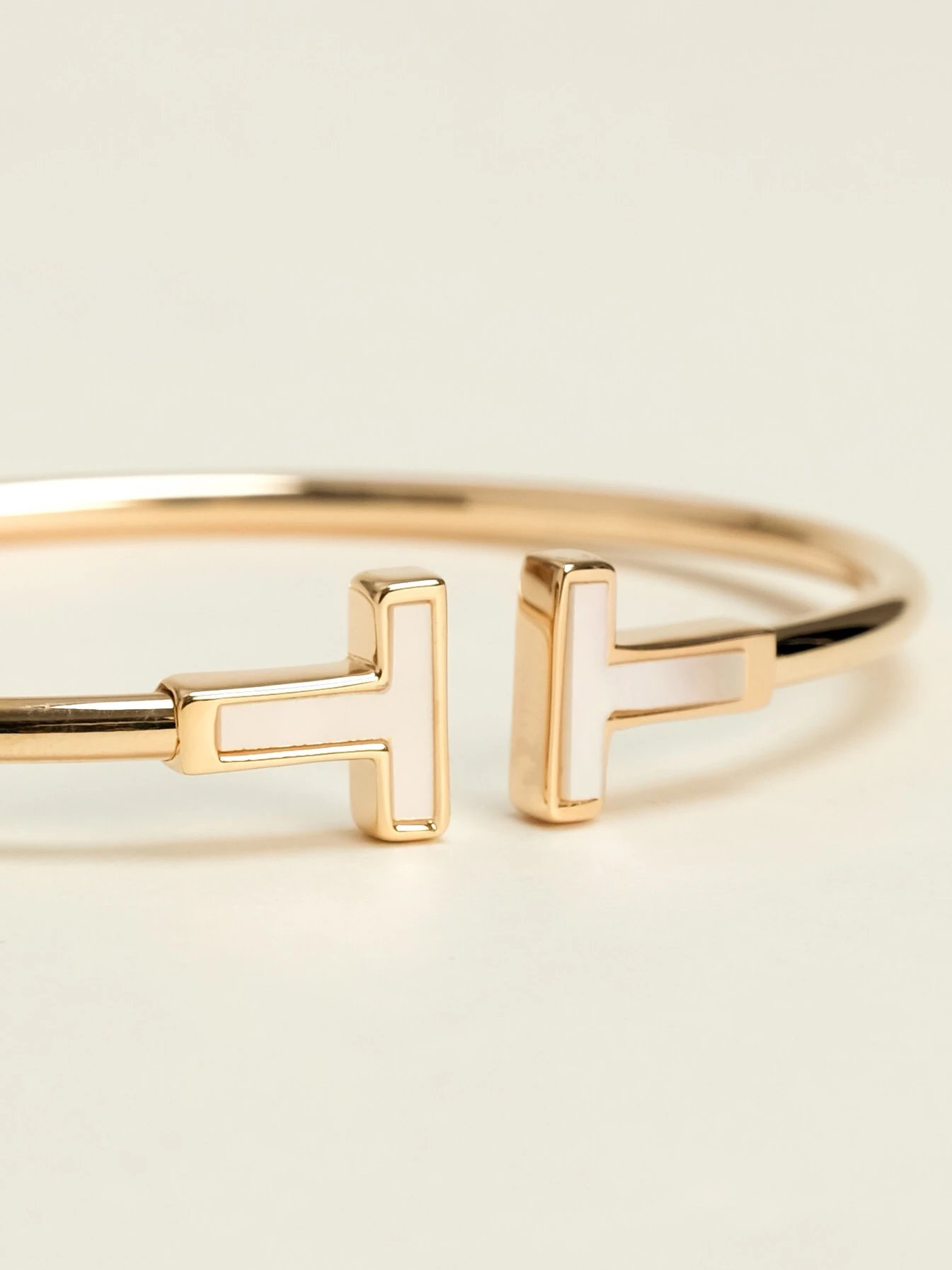 此款手镯镶嵌彩虹光泽的珍珠母贝,设计大胆、光彩耀目、典雅迷人、时尚别致。Tiffany T 系列多面设计经典迷人,令爱意时刻相伴您的左右。将这款简洁的手镯与其他金属手链叠戴,打造迷人造型
