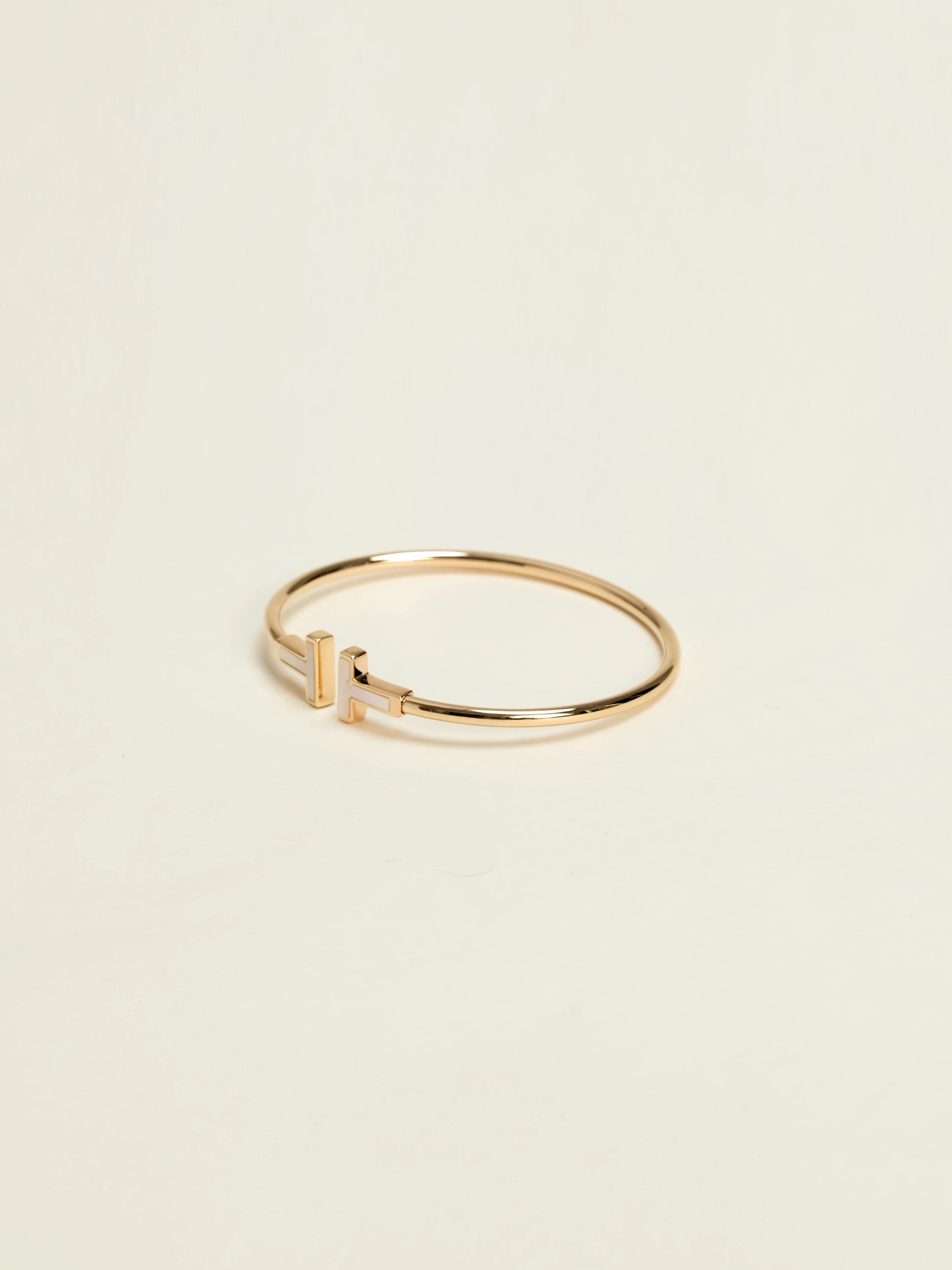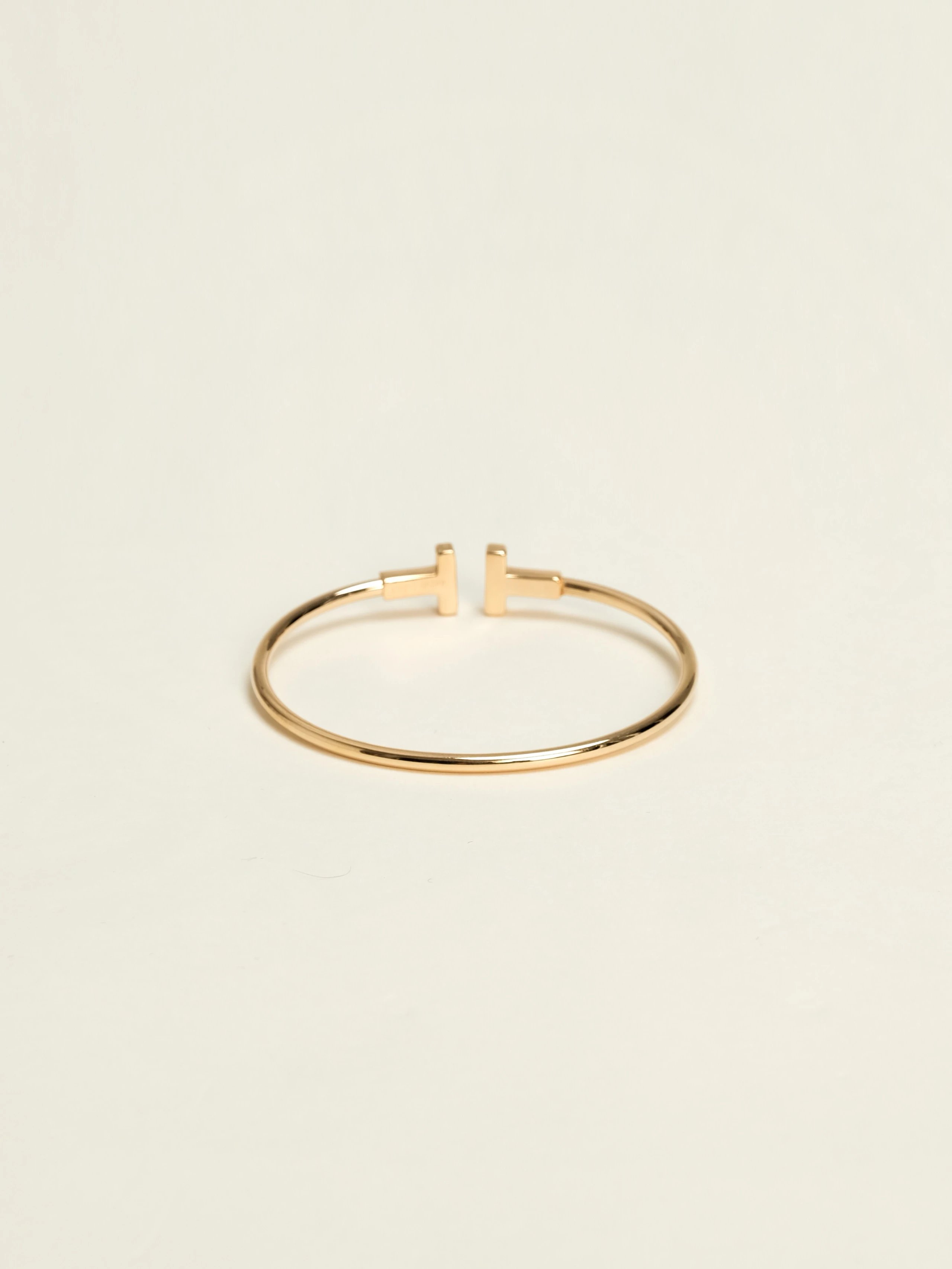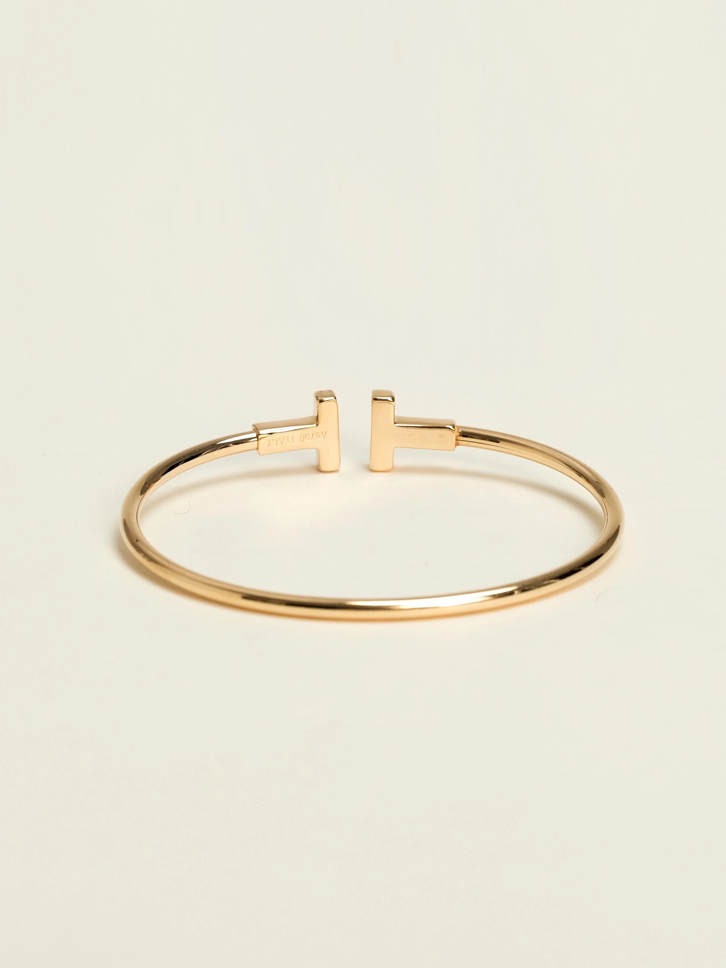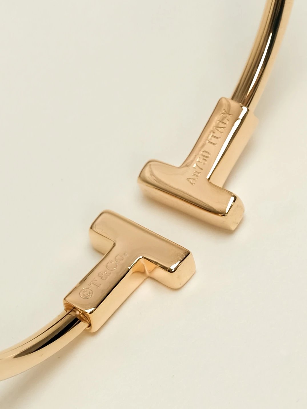 此款手镯镶嵌彩虹光泽的珍珠母贝,设计大胆、光彩耀目、典雅迷人、时尚别致。Tiffany T 系列多面设计经典迷人,令爱意时刻相伴您的左右。将这款简洁的手镯与其他金属手链叠戴,打造迷人造型