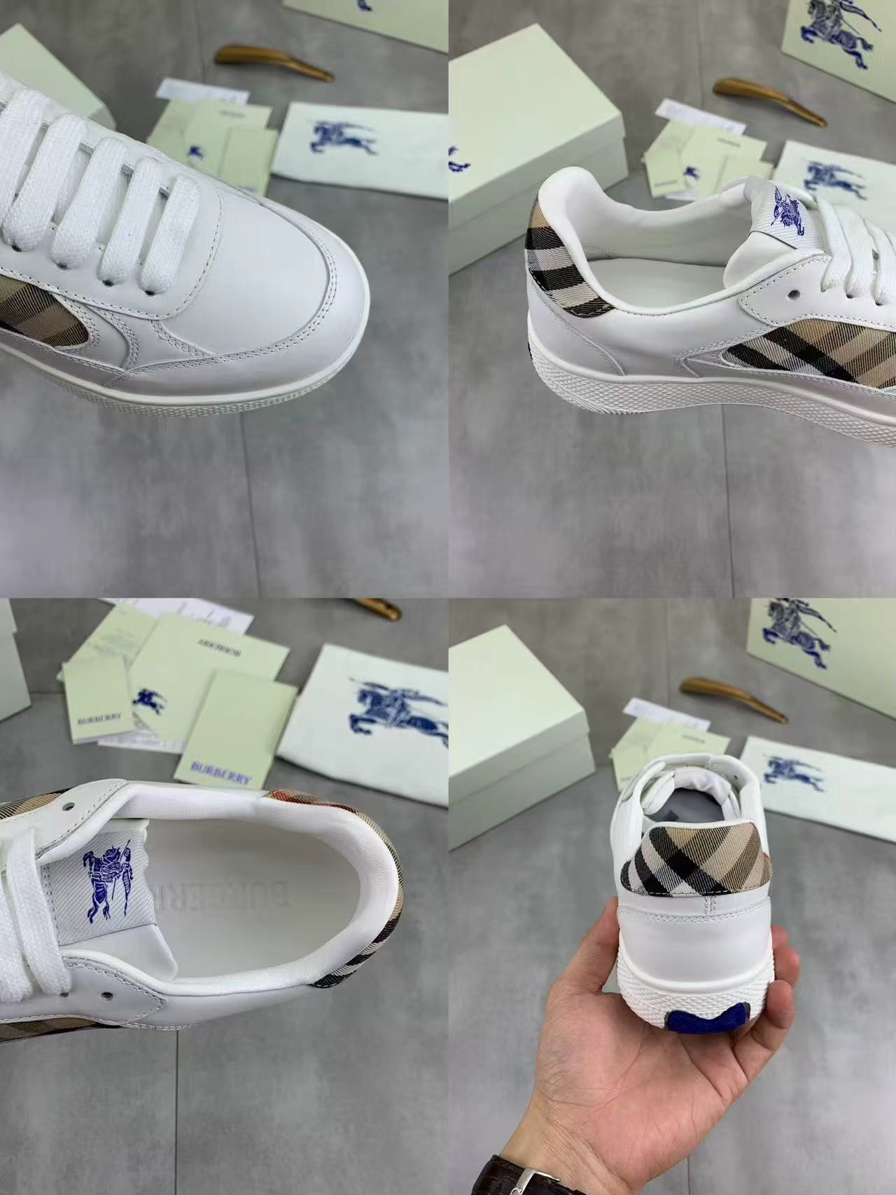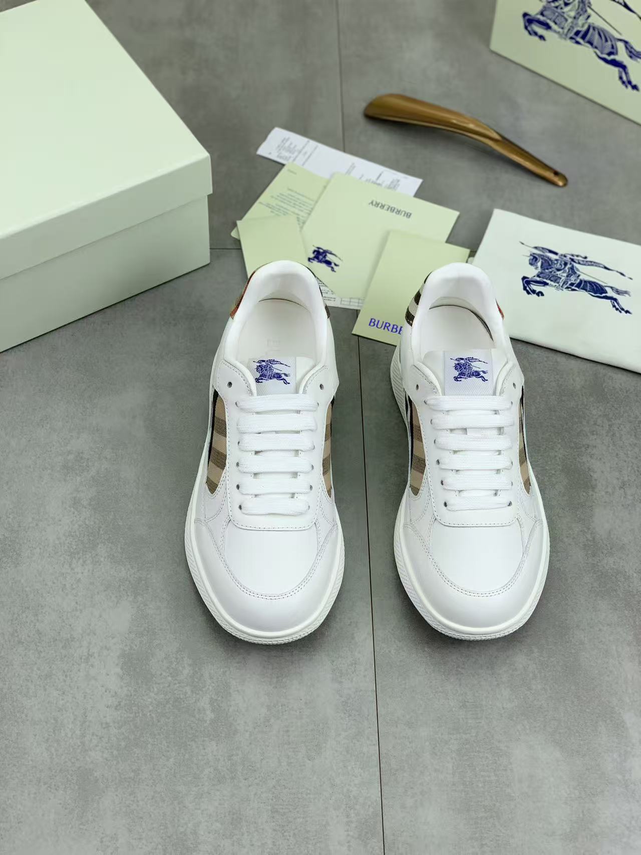 Burberry巴宝莉 Terrace PU 小牛皮 格纹马术骑士标签 圆头系带 低帮 板鞋 白色