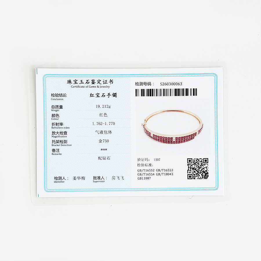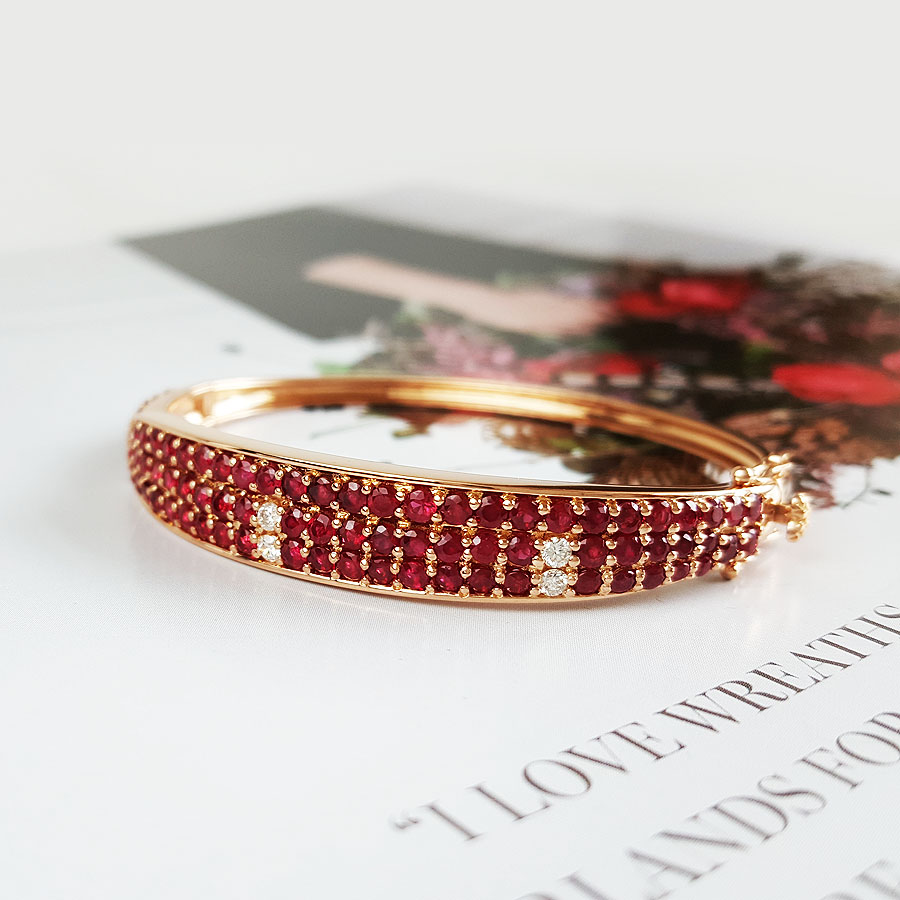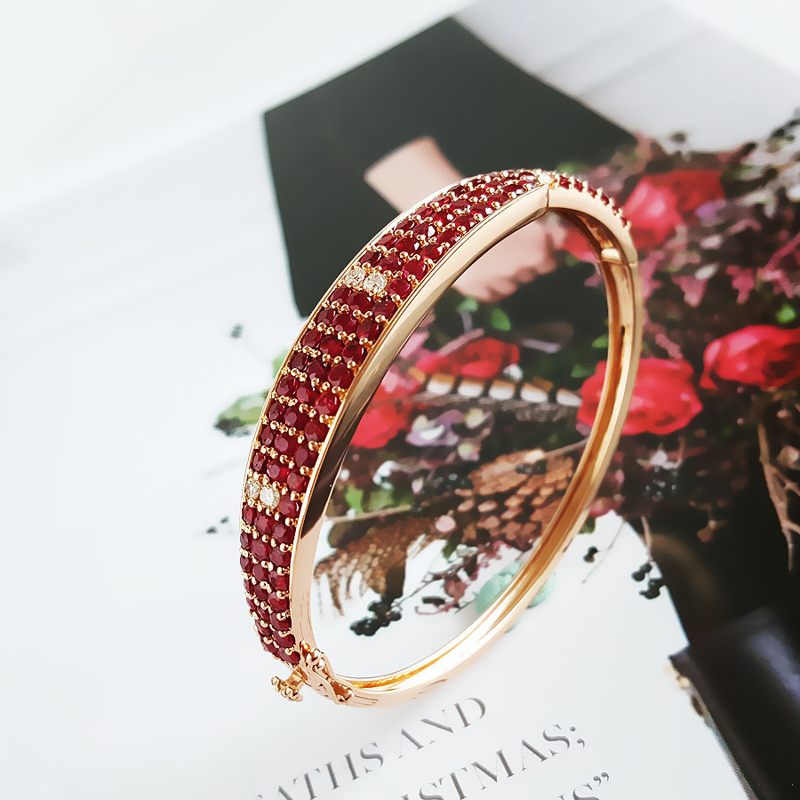 名称 | AU750玫瑰金镶钻镶天然群镶款鸽血红红宝石手镯 |