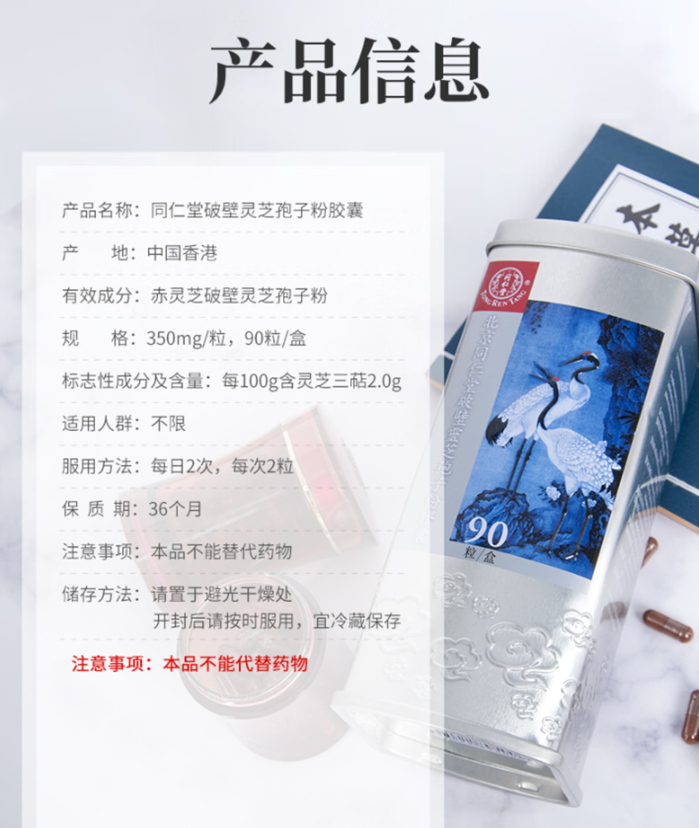 【香港直邮】增强免疫力 正品北京同仁堂靈芝孢子(90粒)