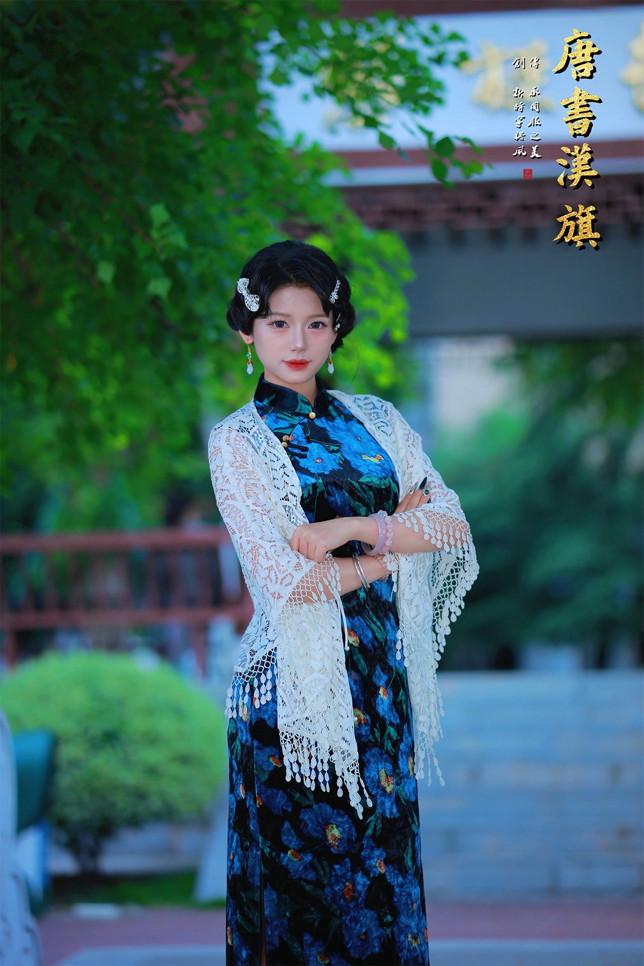 【青蕊花韵】甄选质感丝绒面料,复古无袖设计搭配经典立领,蓝底繁花图案雅致吸睛,将民国风情与现代审美巧妙融合。修身剪裁尽显曼妙身姿