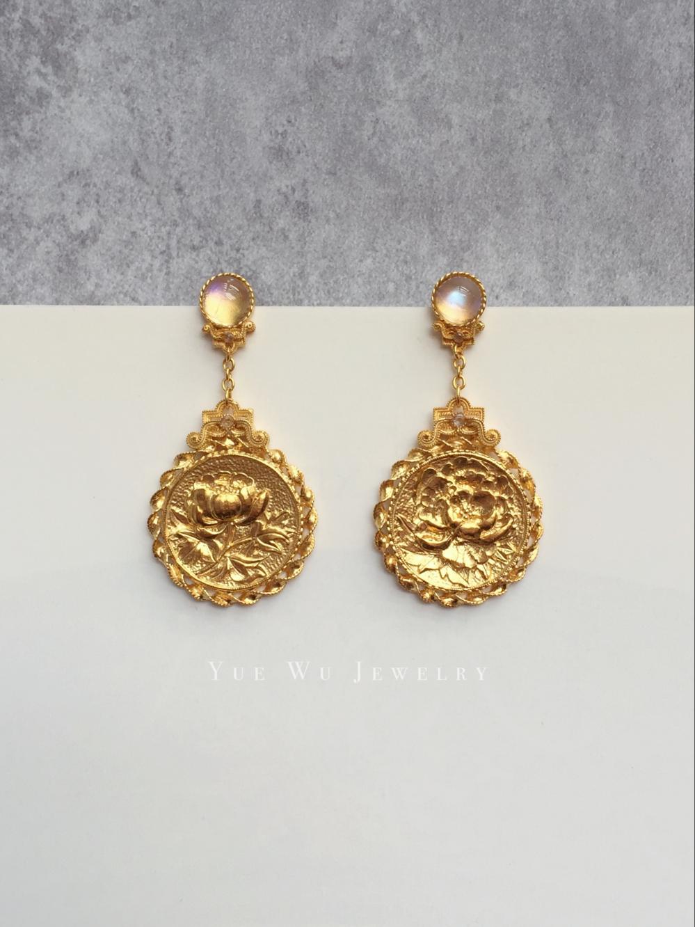 作品描述:牡丹,雍容华贵,为中国之国花。耳坠上绘制了两款不同形态的花朵,再经过錾刻,将花瓣和叶片雕刻得更灵动。牡丹花之外,又再镶嵌一圈独特的花丝。悦物秉持原创设计的理念,将中国传统的花丝工艺与錾刻工艺相融合,希望能呈现不一样的花丝设计,展现新的大唐风华。