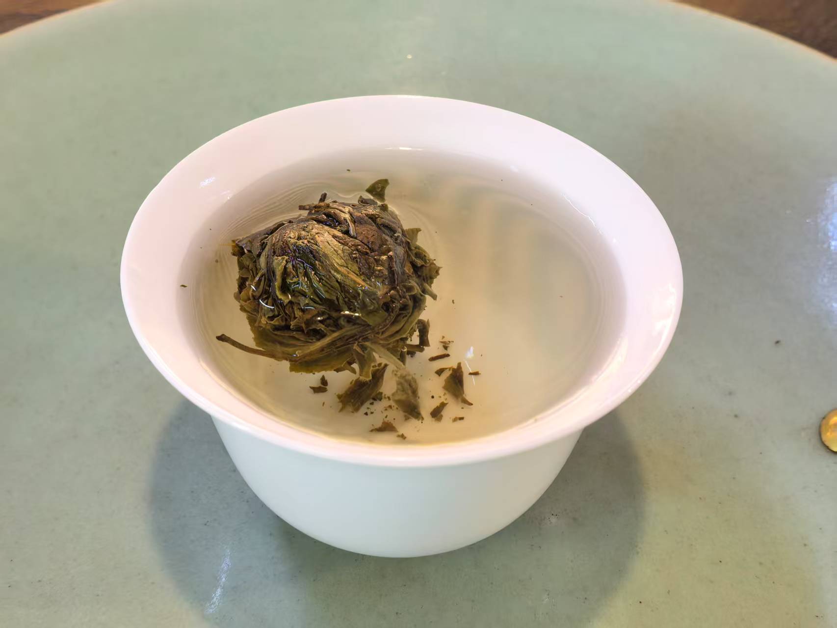 第四道,稍许闷泡,茶球已经逐散开,滋味得到更好的释放,浓强度很高,盖香也进一步上扬,现喝或者再放几年都是可以的。
