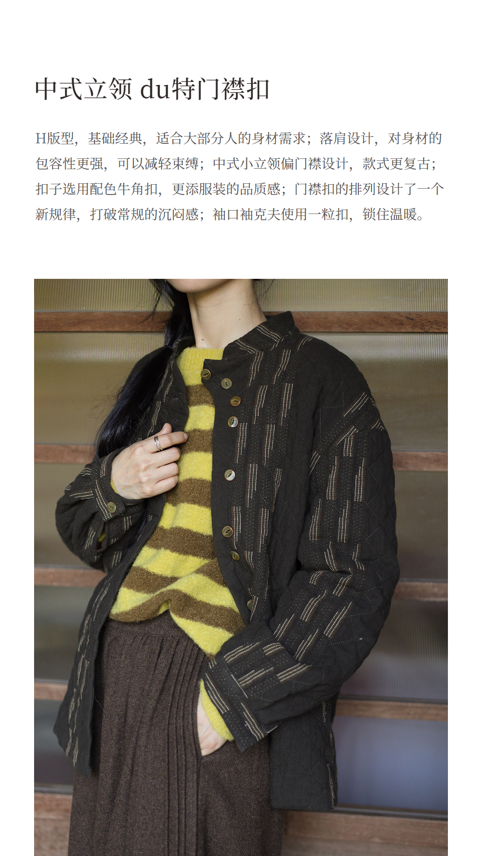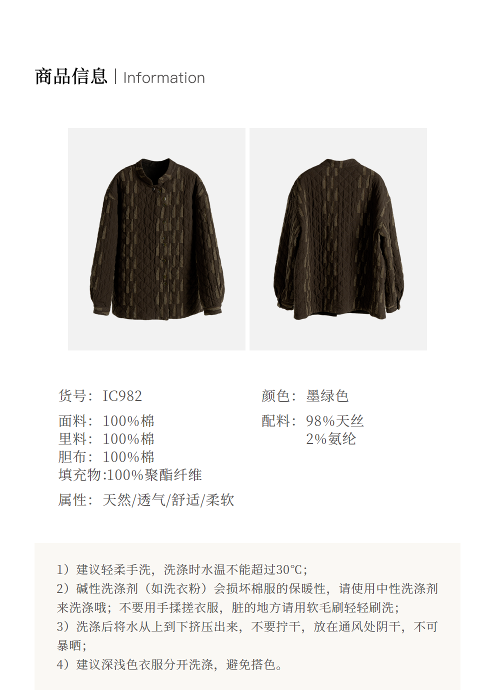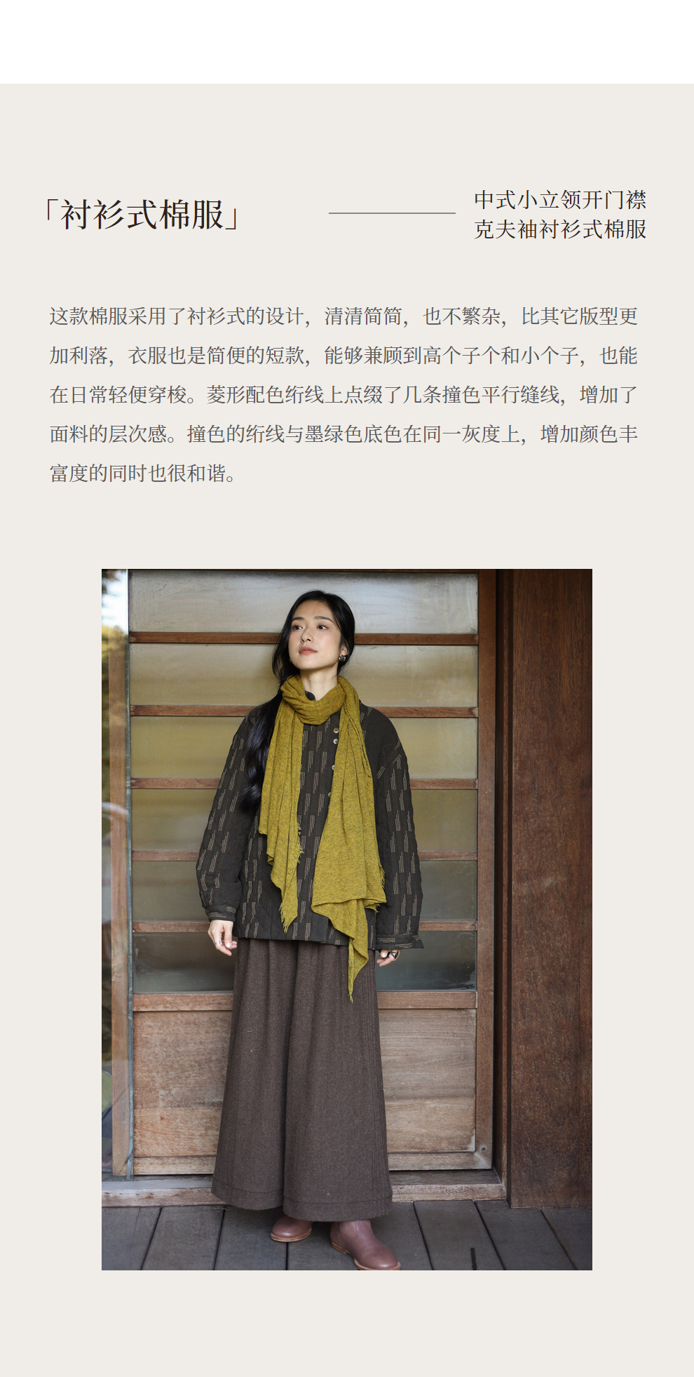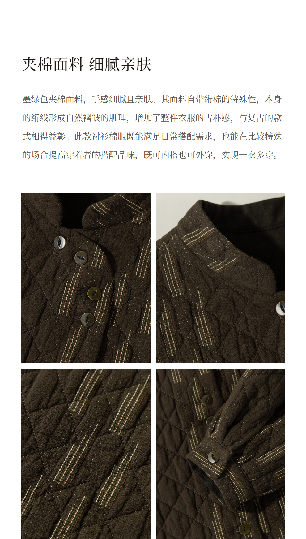 绽放982/2023冬季墨绿色中式复古小立领开襟长袖夹棉衬衫式棉服