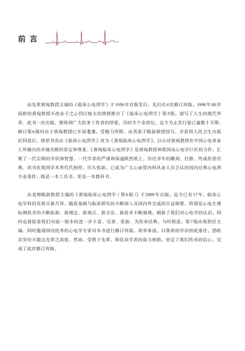 本次将由张澍教授和陈新教授共同主编。张澍教授为中华医学会心电生理和起搏分会的主任委员、亚太心律学会(AP-HRS)秘书长、世界心律失常学会(World Society of Arrhythmia)理事,联合中华医学会心电生理的主要专家将对本书进行修订改版。本版不仅沿袭前面6版的风格,将心电学的知识以图文并茂的形式展现,同时还将国内、国际上心电学的研究进展注入本书中。同时还将全部采用中国医生自己的特征性心电图,展现中国心电图学的发展,注重黄宛临床心电图学在临床医学中的定位和实用性。