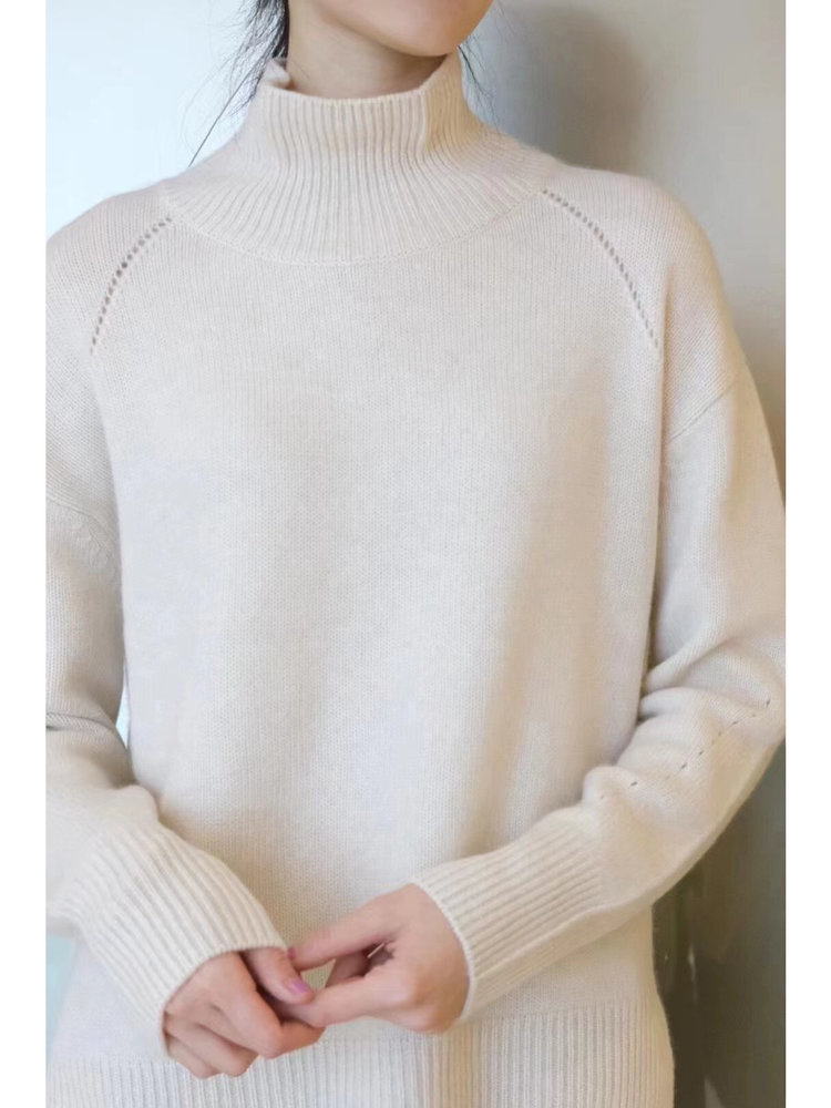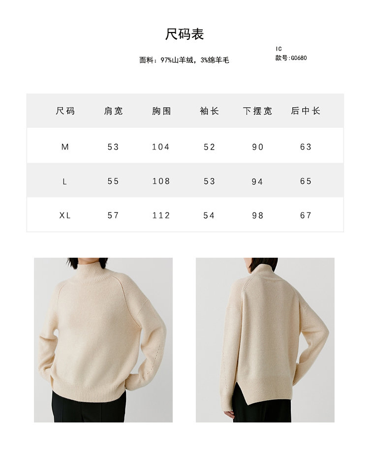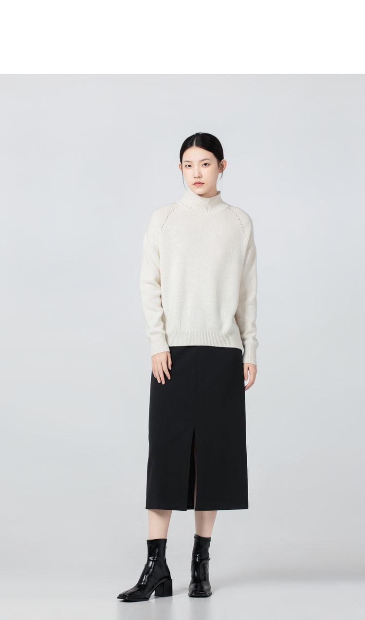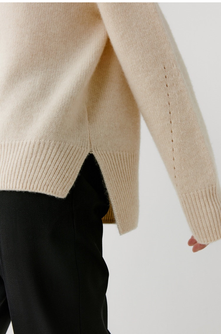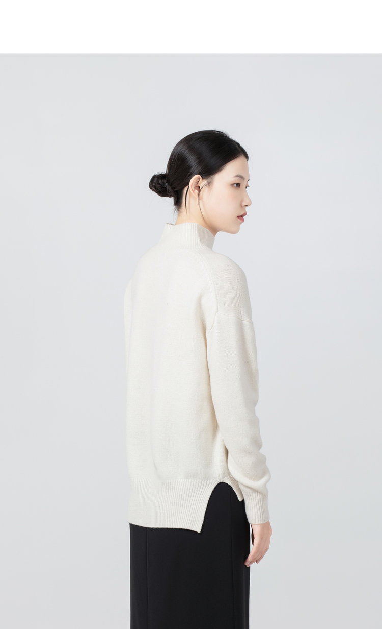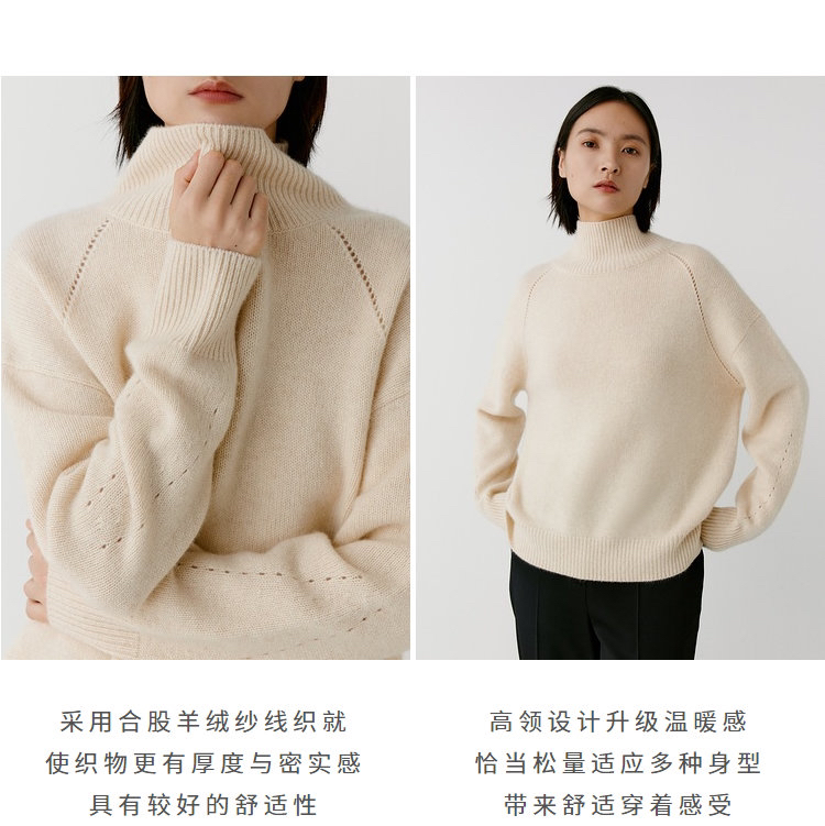 合股羊绒高领乳白色针织衫 97%羊绒+3%羊毛 手感丰厚柔软 宽松版型设计 罗纹高领 下摆开叉